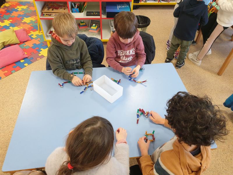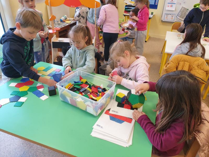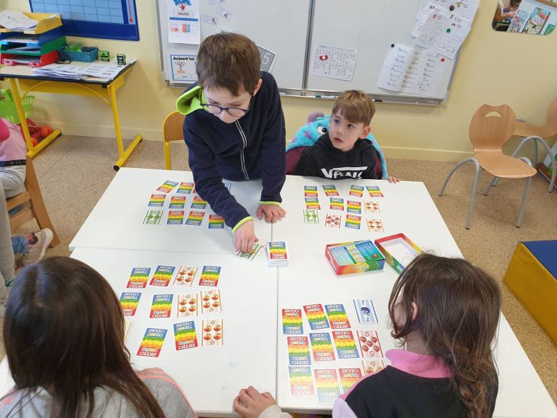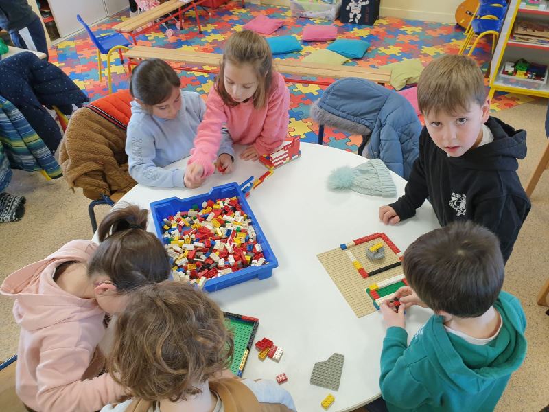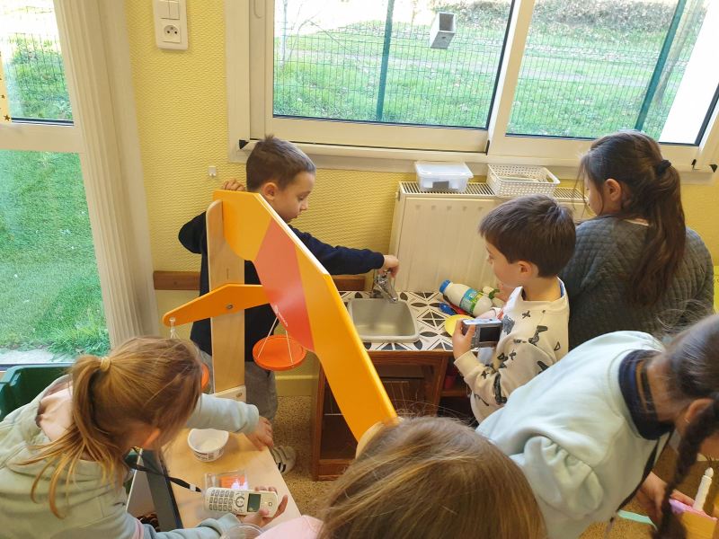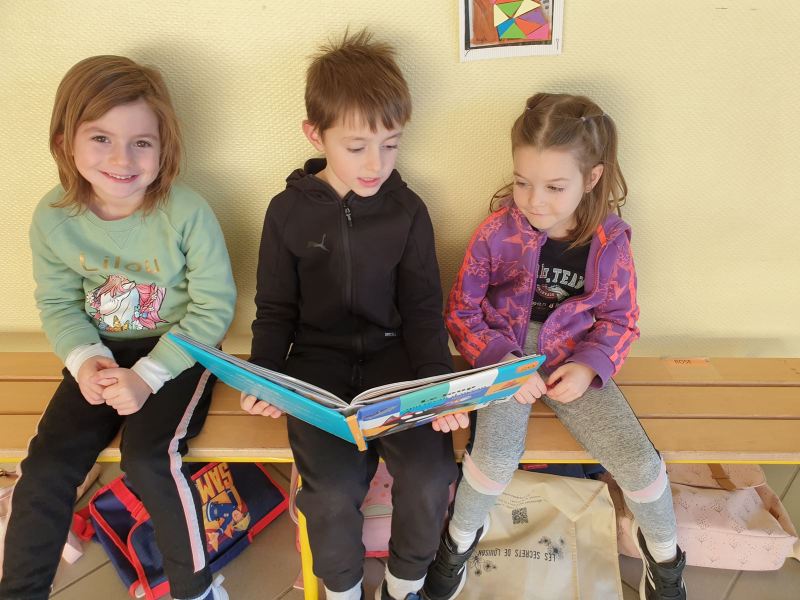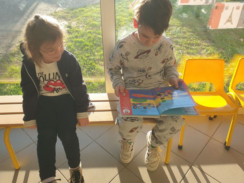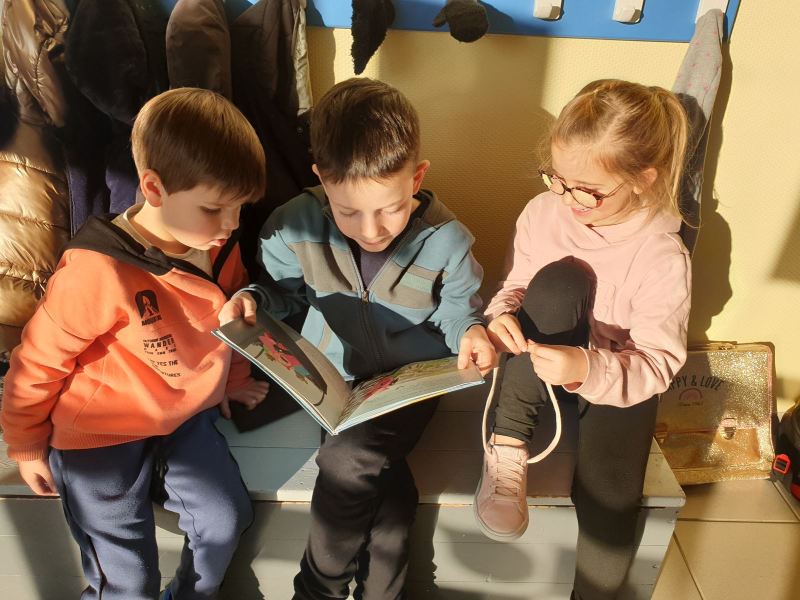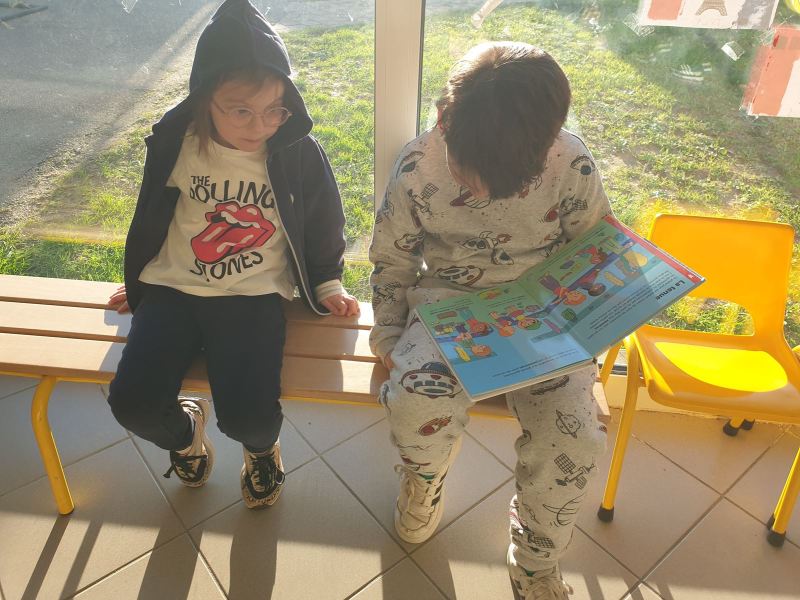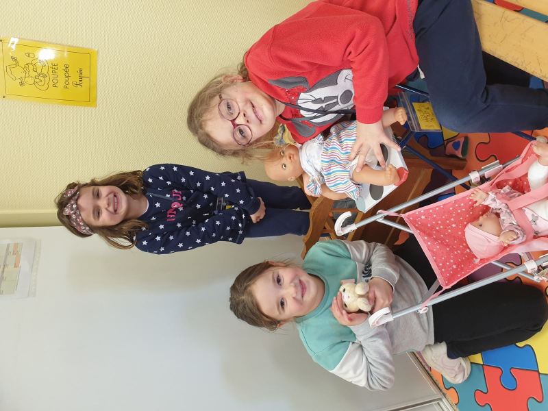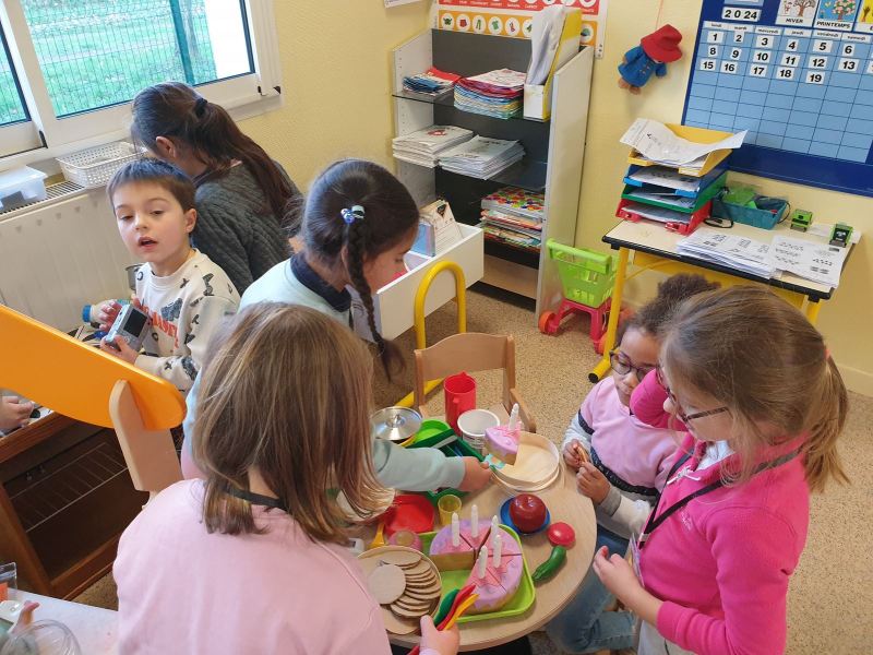 Ce fut l’occasion pour les GS de travailler l’écriture, et pour les CP-CE1 de retomber en « enfance » en jouant dans les coins de la classe des GS, ou en lisant des histoires aux plus petits.