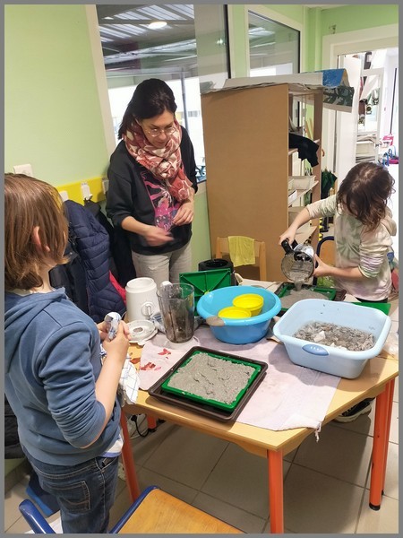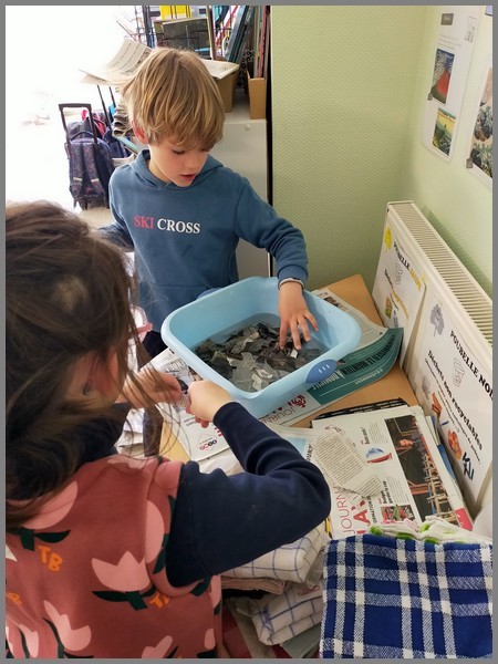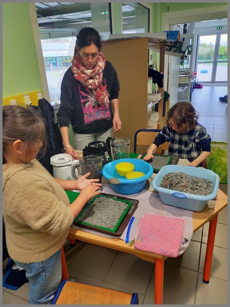 Jeudi après-midi 3 Avril : Second temps de notre activité déchets. Nous avons fabriqué du papier recyclé et des petits objets décoratifs en papier. Découpage, collage et les mains dans la pâte à papier… Bref, le chantier dans la classe, mais c’était super !