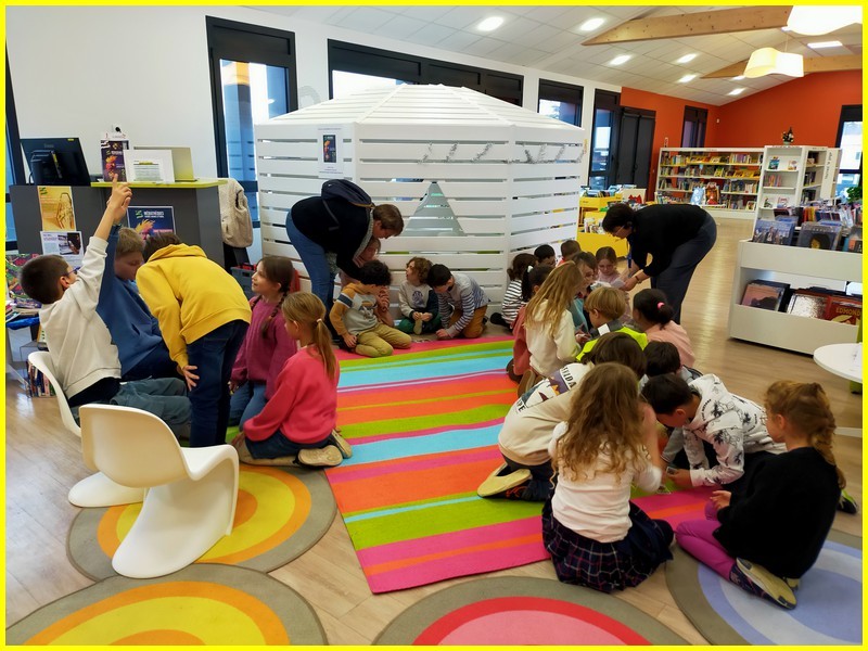 Jeudi 28 Novembre, nous sommes allés à la médiathèque. Sophie nous attendait pour nous faire découvrir le lieu et le classement des livres. Avec elle, nous avons fait un petit jeu pour obtenir des indices et trouver un album caché dans les rayonnages : Forêt des frères. Elle nous l’a lu ensuite sur le tapis. Ce livre nous a permis d’échanger et d’argumenter.