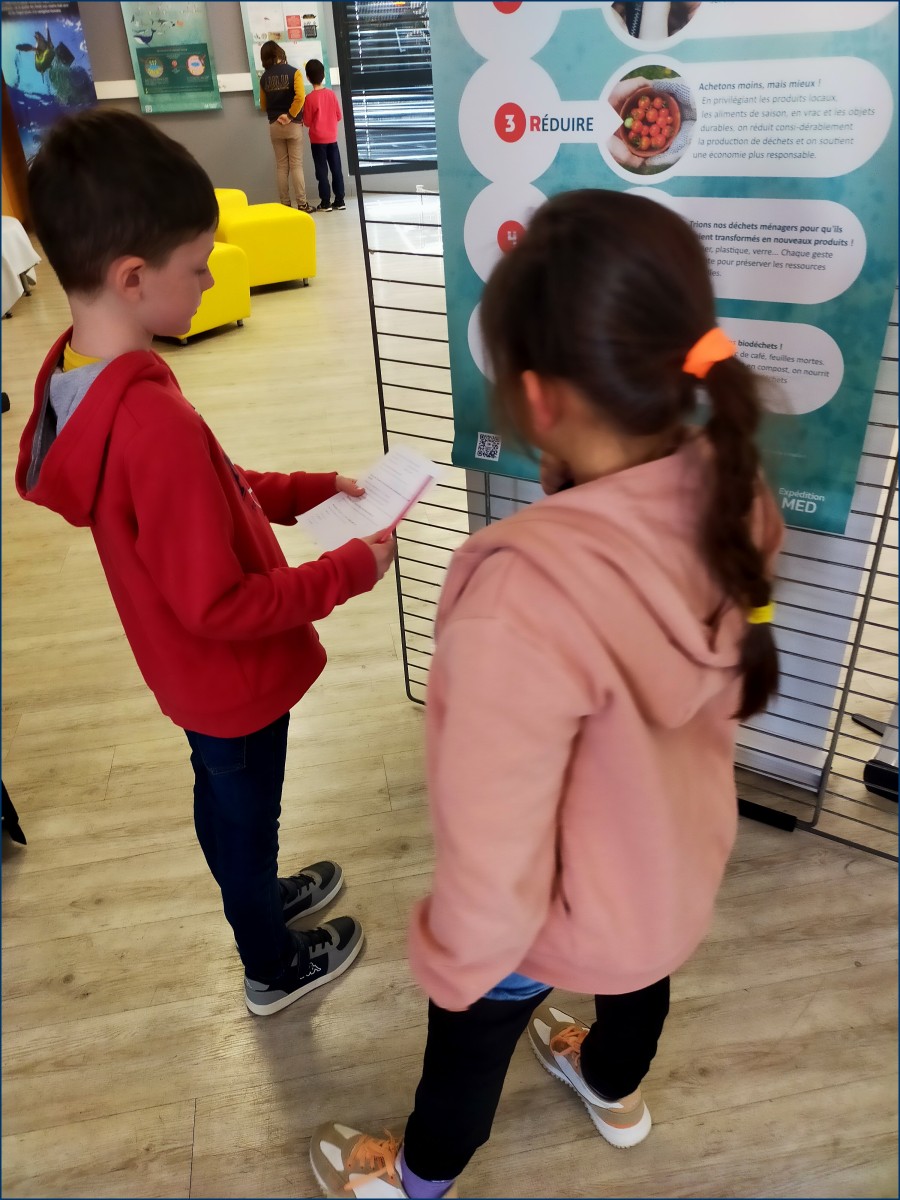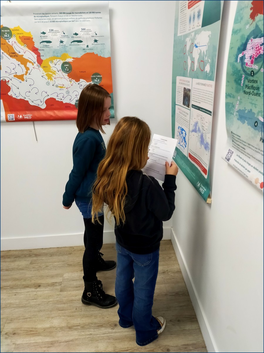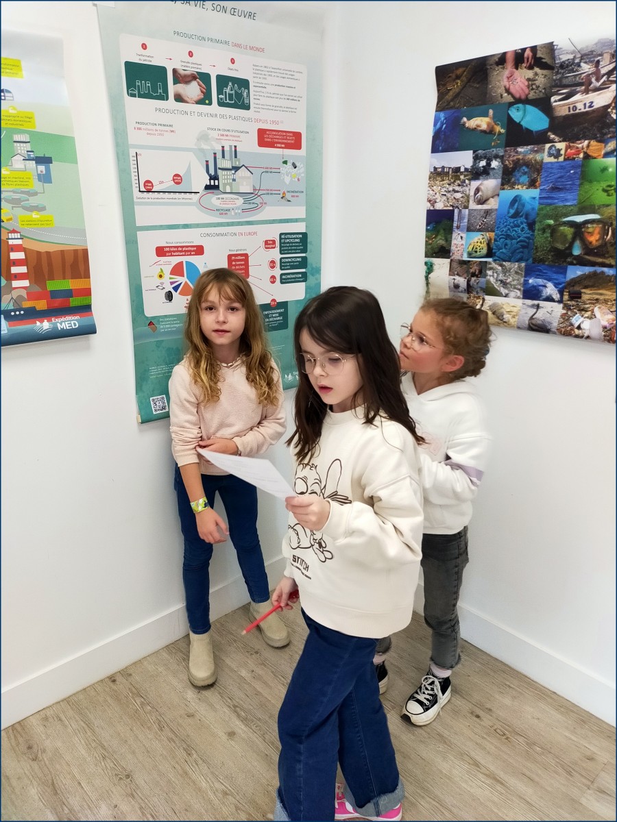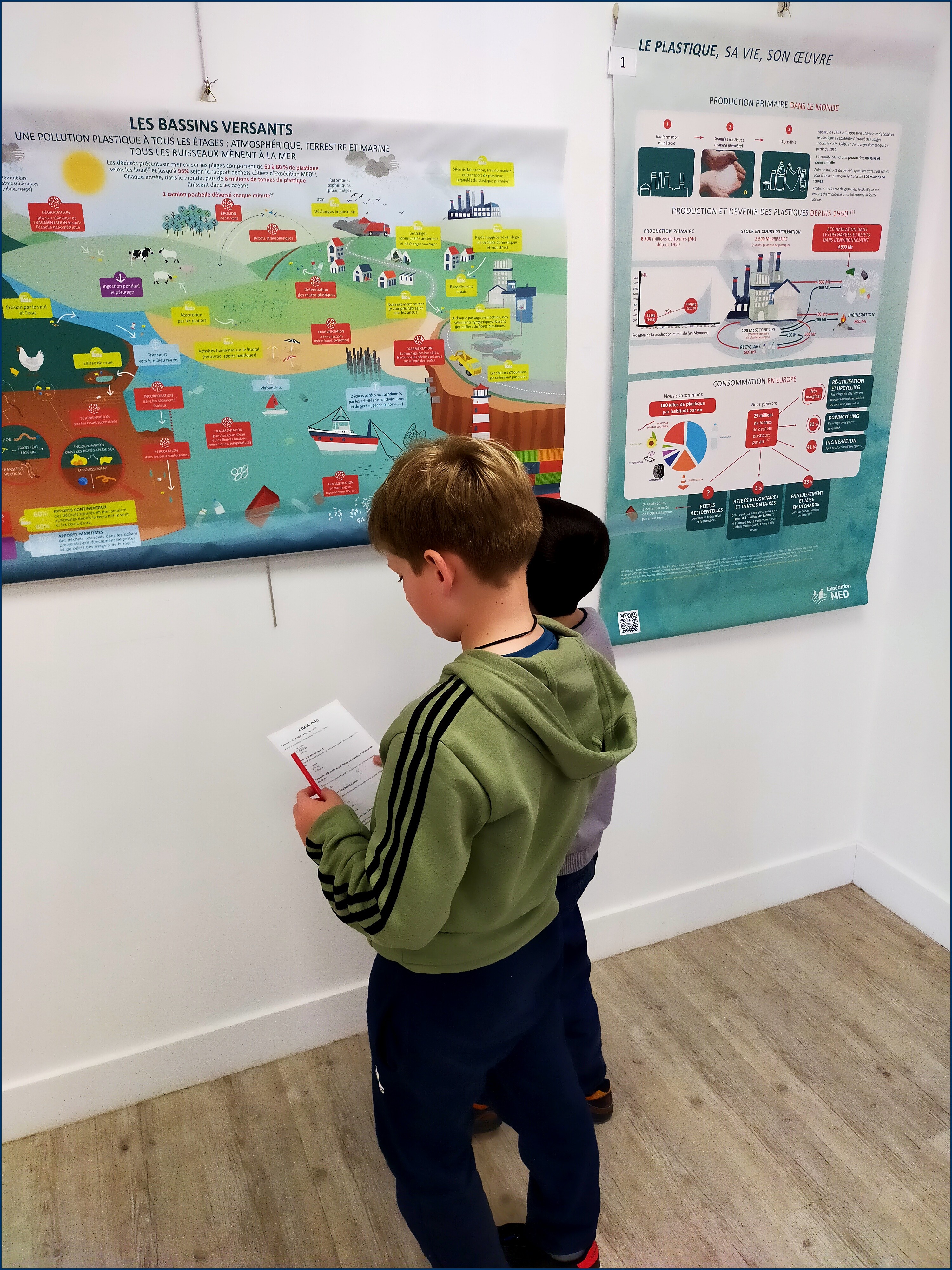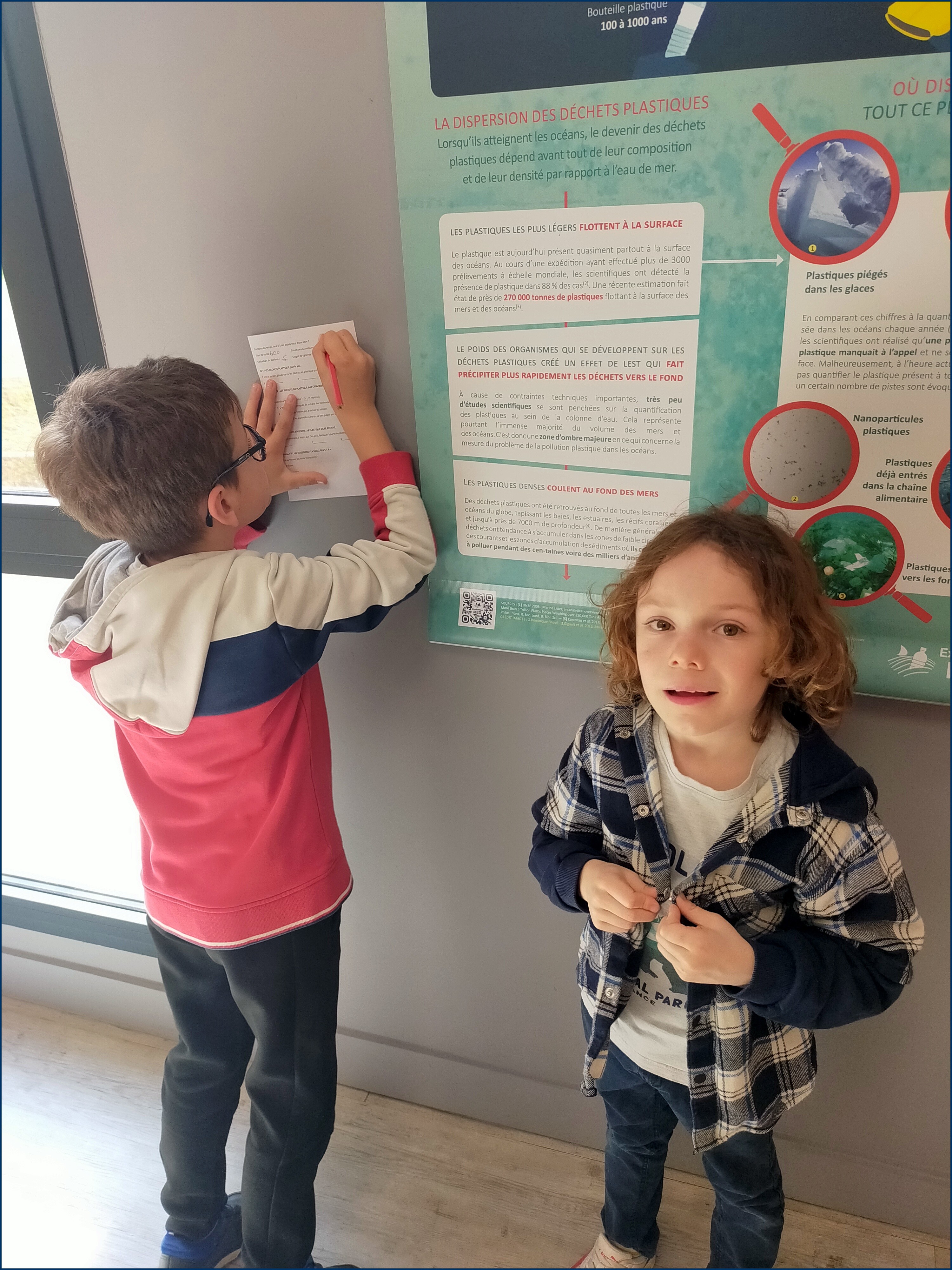 • Un premier groupe a regardé avec elle, l’exposition sur la pollution des océans. Il y avait un petit questionnaire à compléter en cherchant sur les panneaux d’informations.