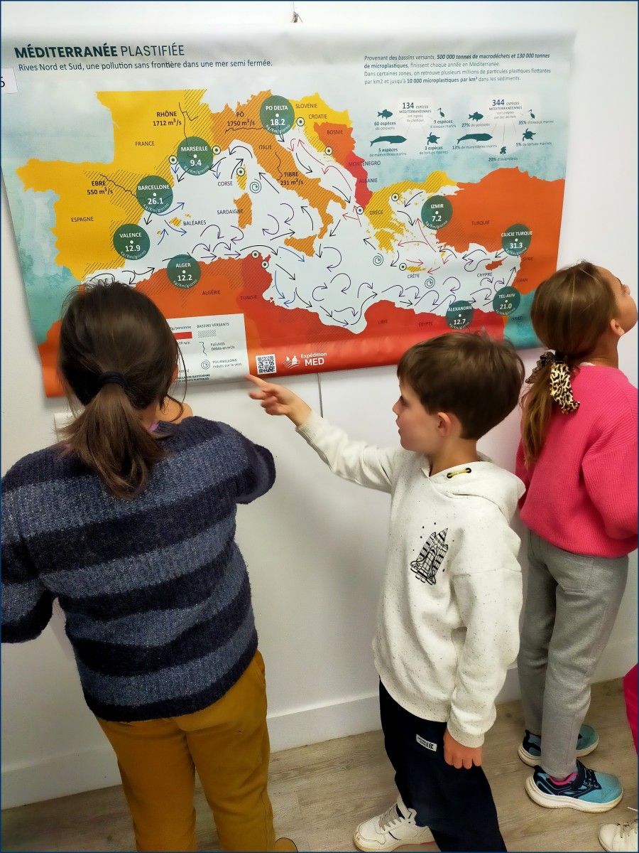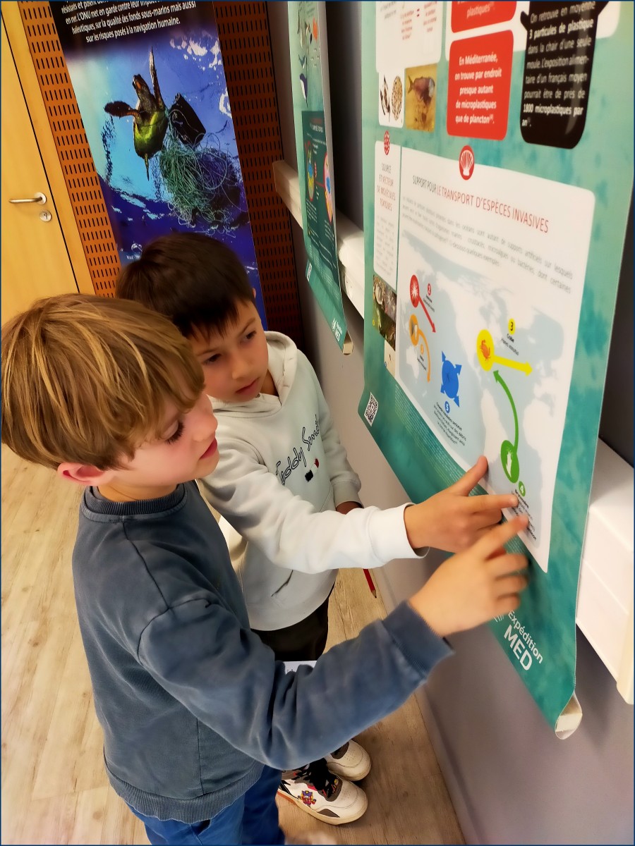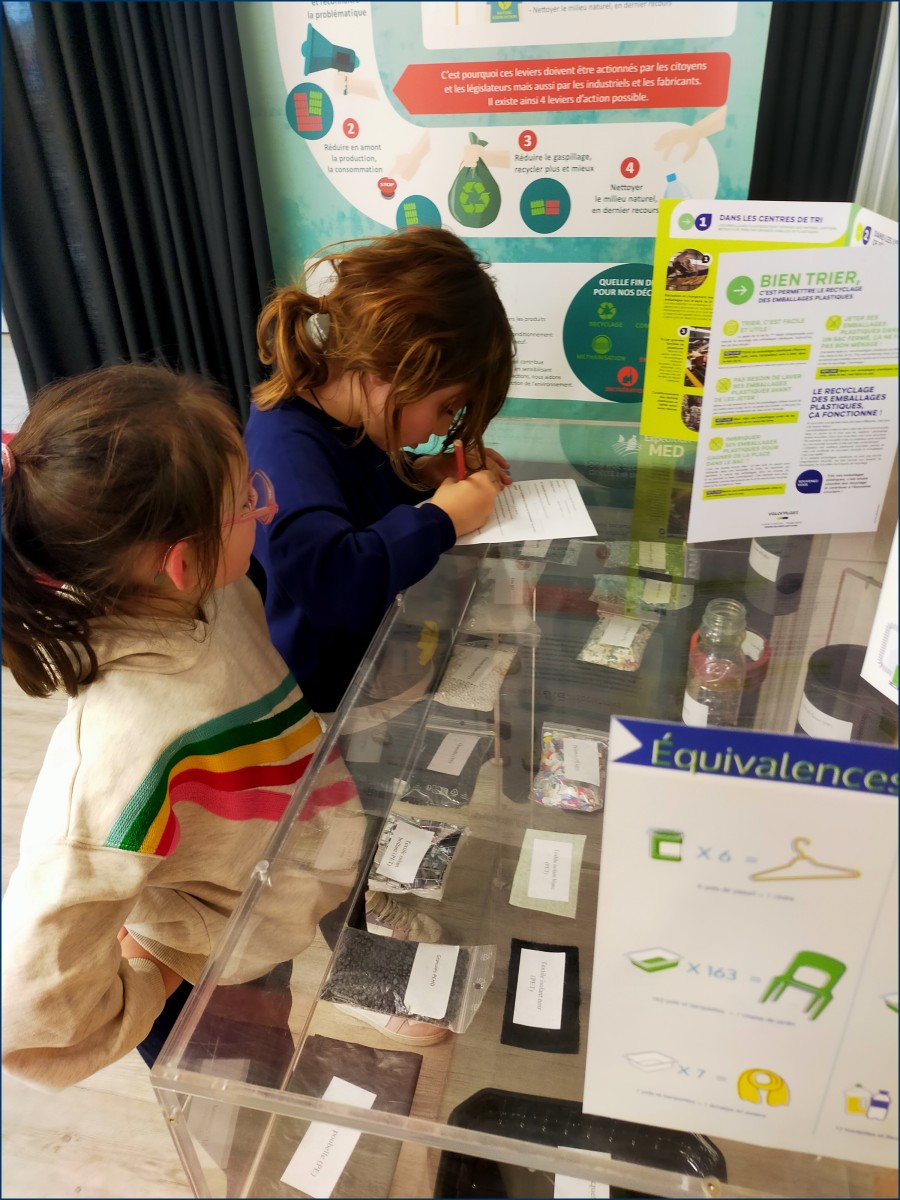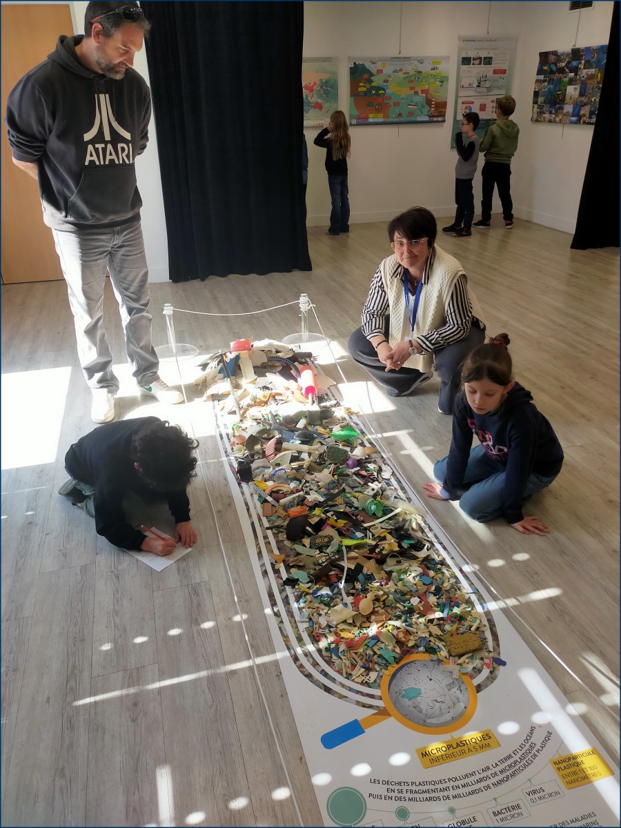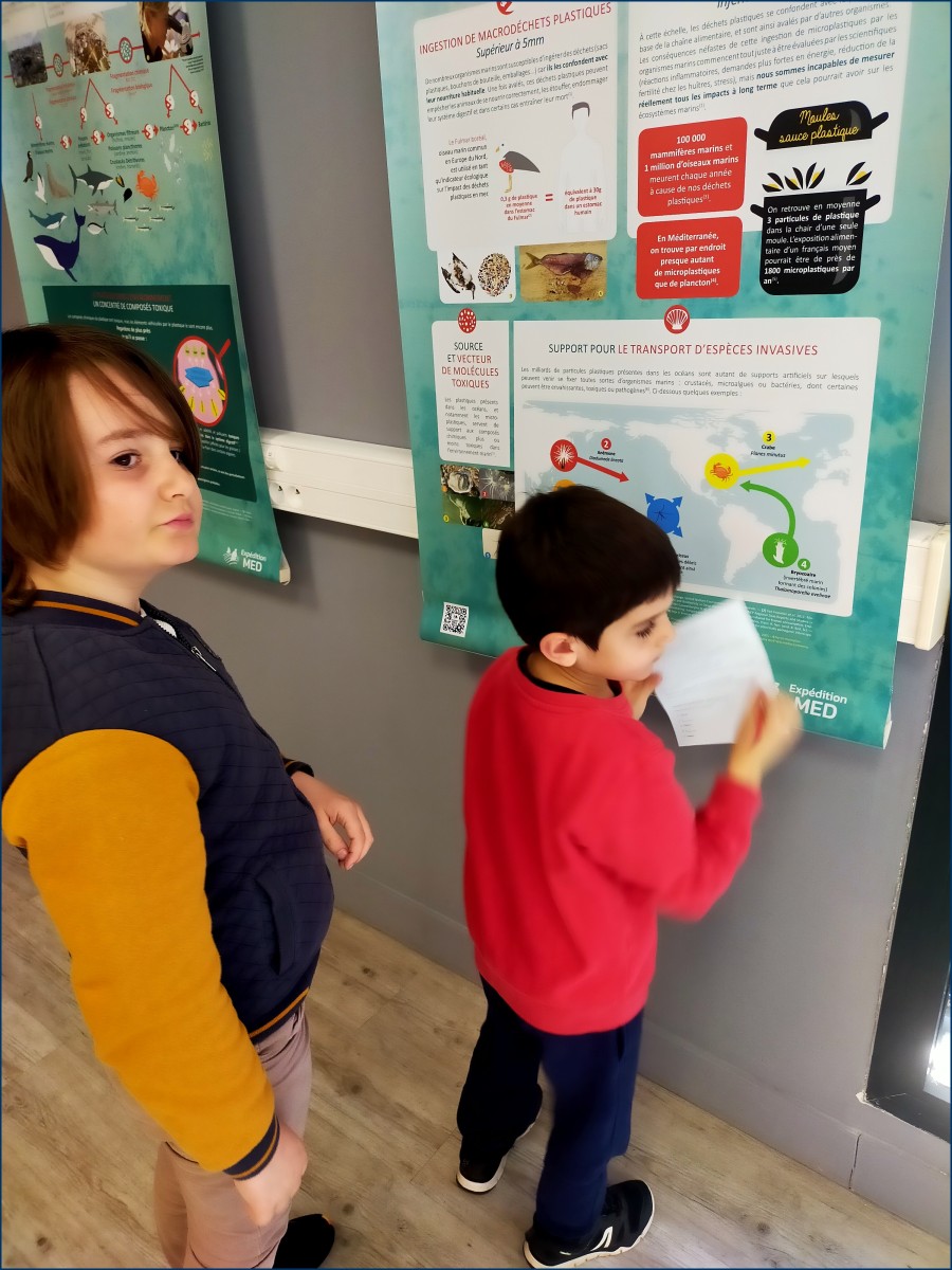 • Un premier groupe a regardé avec elle, l’exposition sur la pollution des océans. Il y avait un petit questionnaire à compléter en cherchant sur les panneaux d’informations.