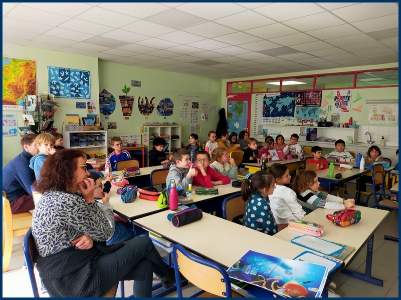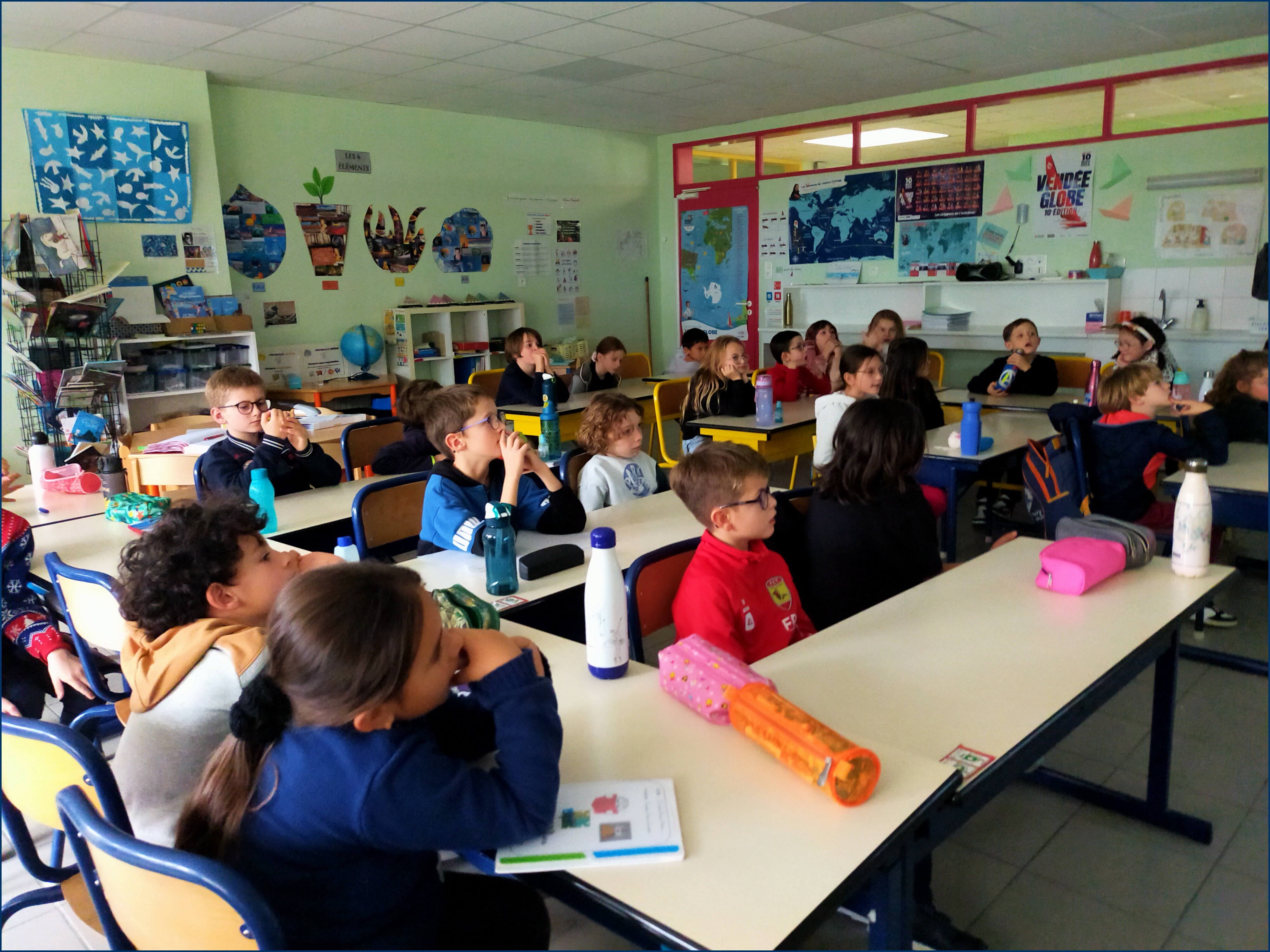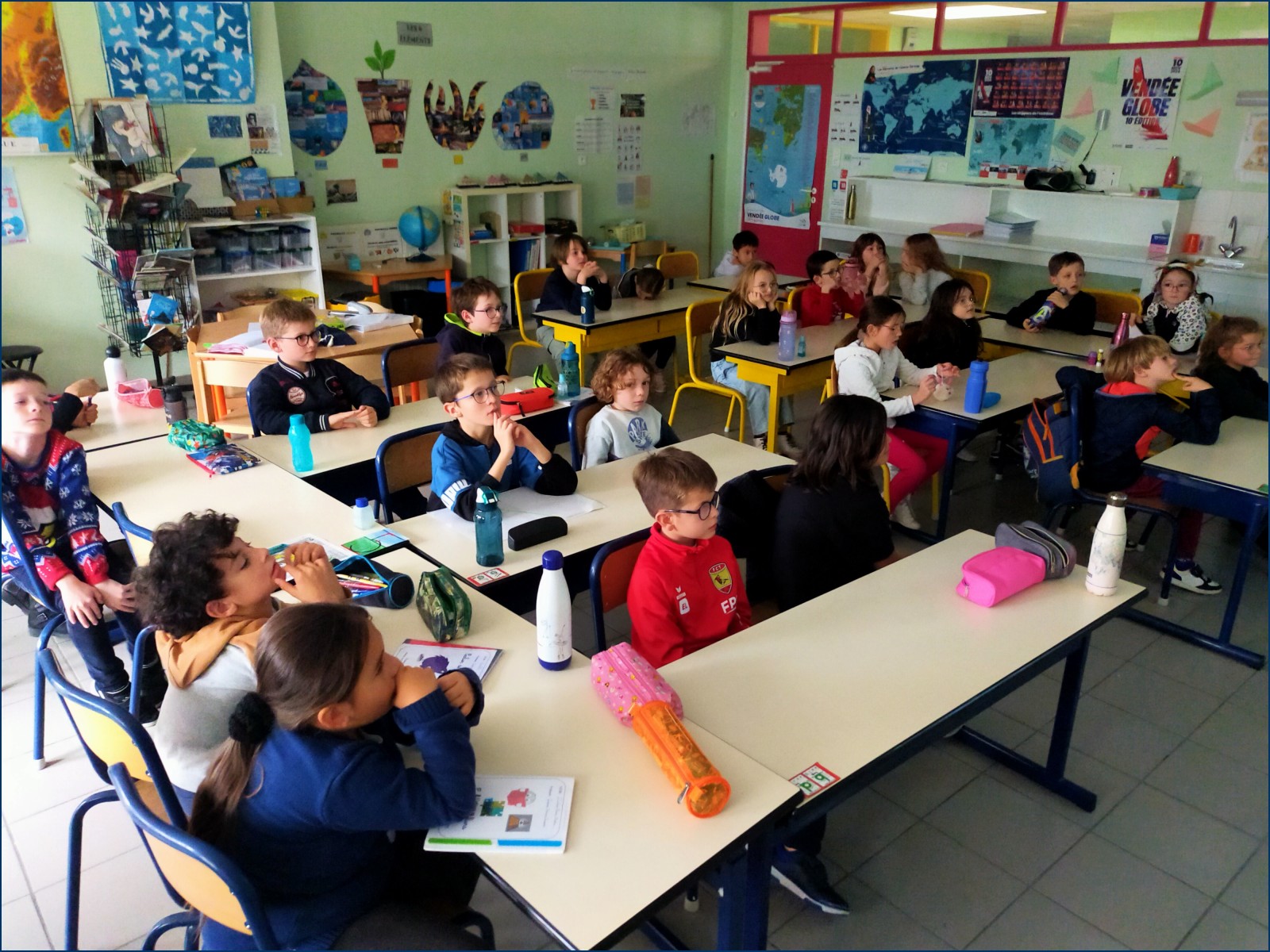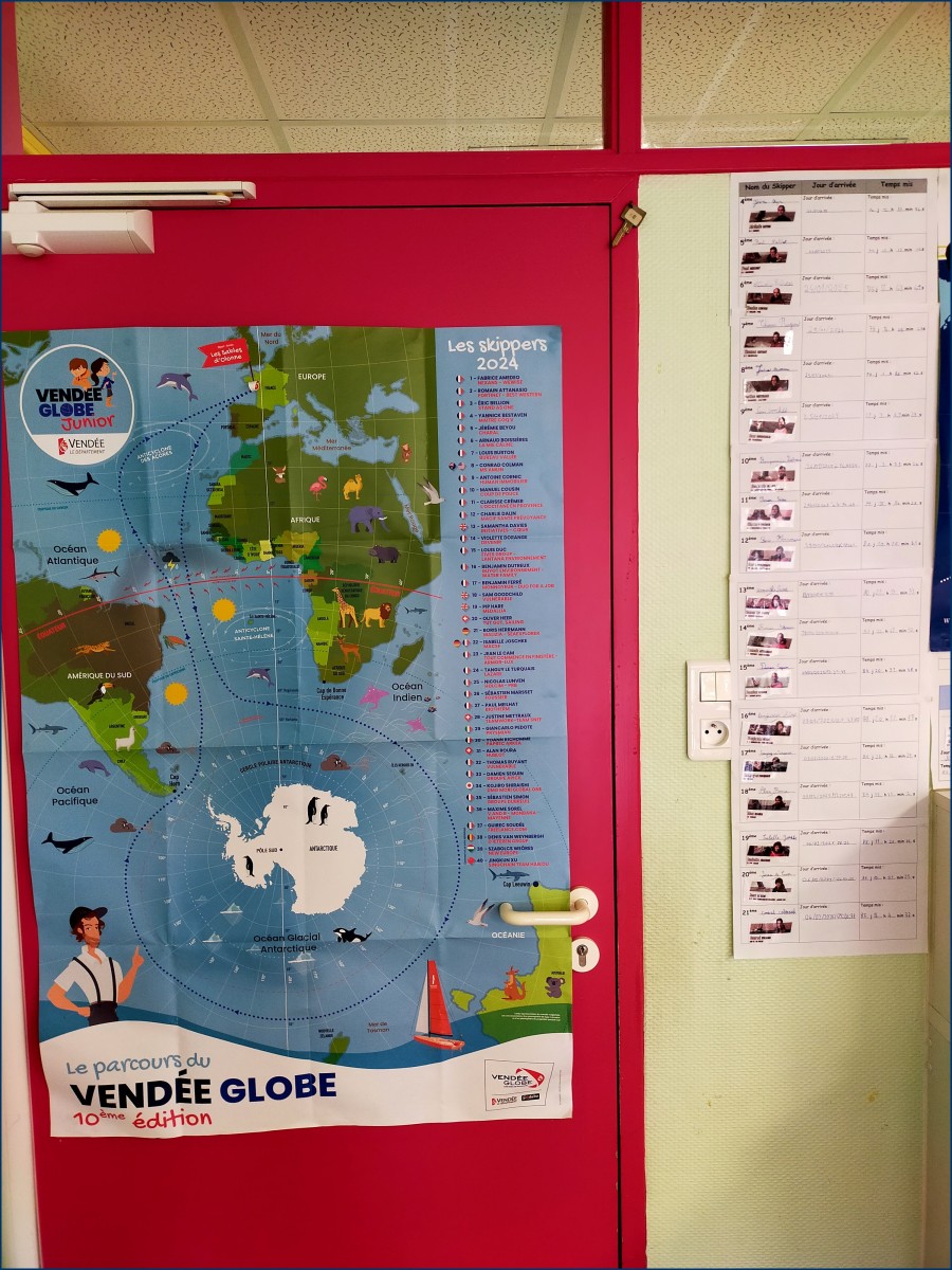 Cette année, nous avons suivi avec beaucoup d’enthousiasme la course du Vendée Globe en classe. Tous les matins, nous mettions à jour le classement, discutions des avaries ou des abandons. Nous avons écouté Benjamin Dutreux nous raconter son aventure en direct et nous avons suivi les arrivées de près.
