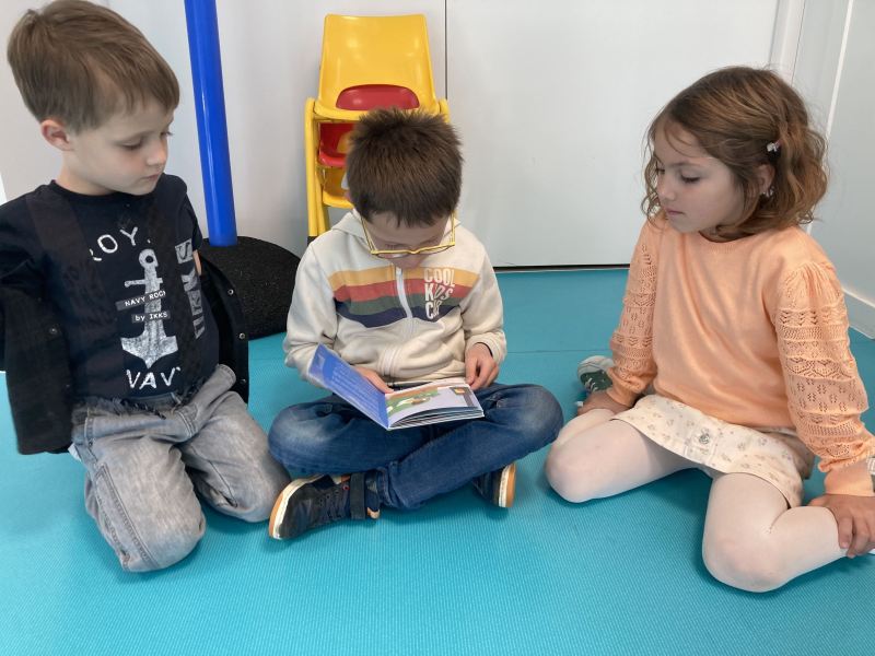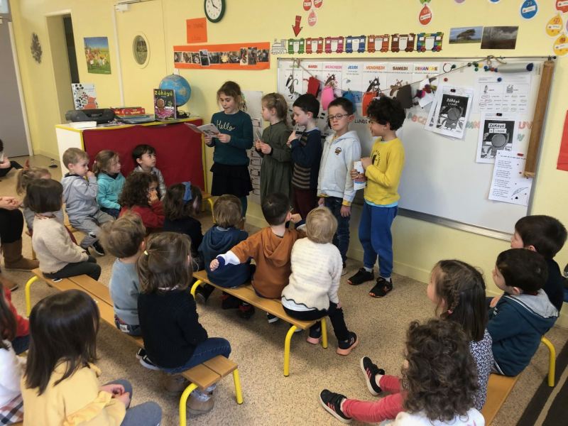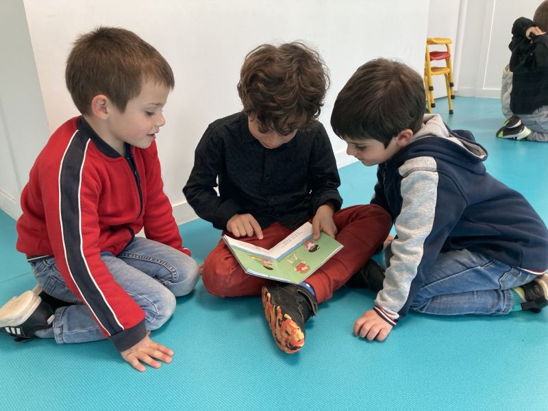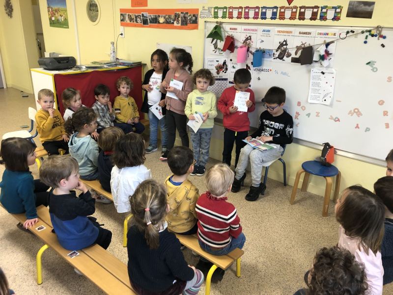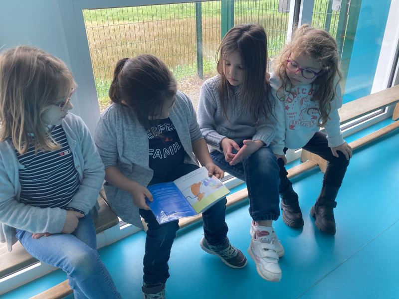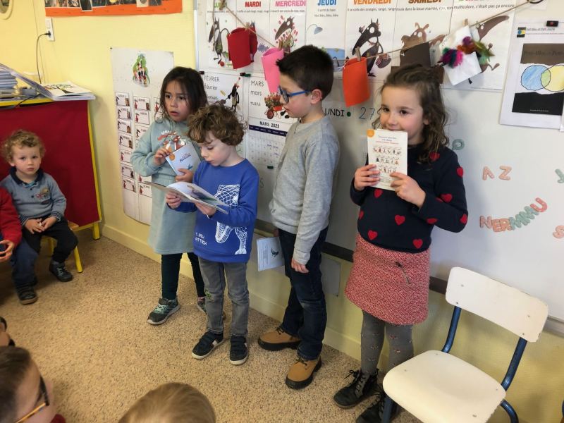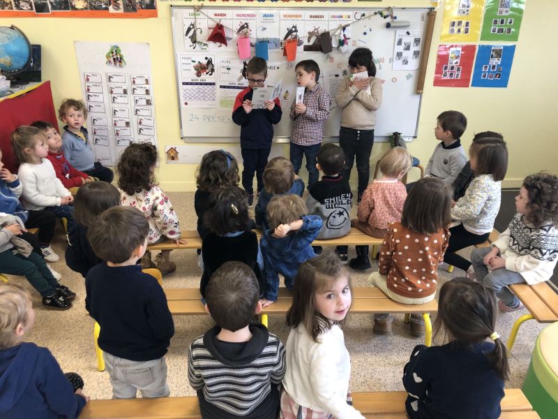 Chaque semaine, les CP choisissent un petit album en classe, ils préparent leur lecture à la maison, puis chaque lundi, direction les classes de Nadège, Fabienne et Laurence/Nathalie, pour un moment de lecture partagé avec les plus petits.