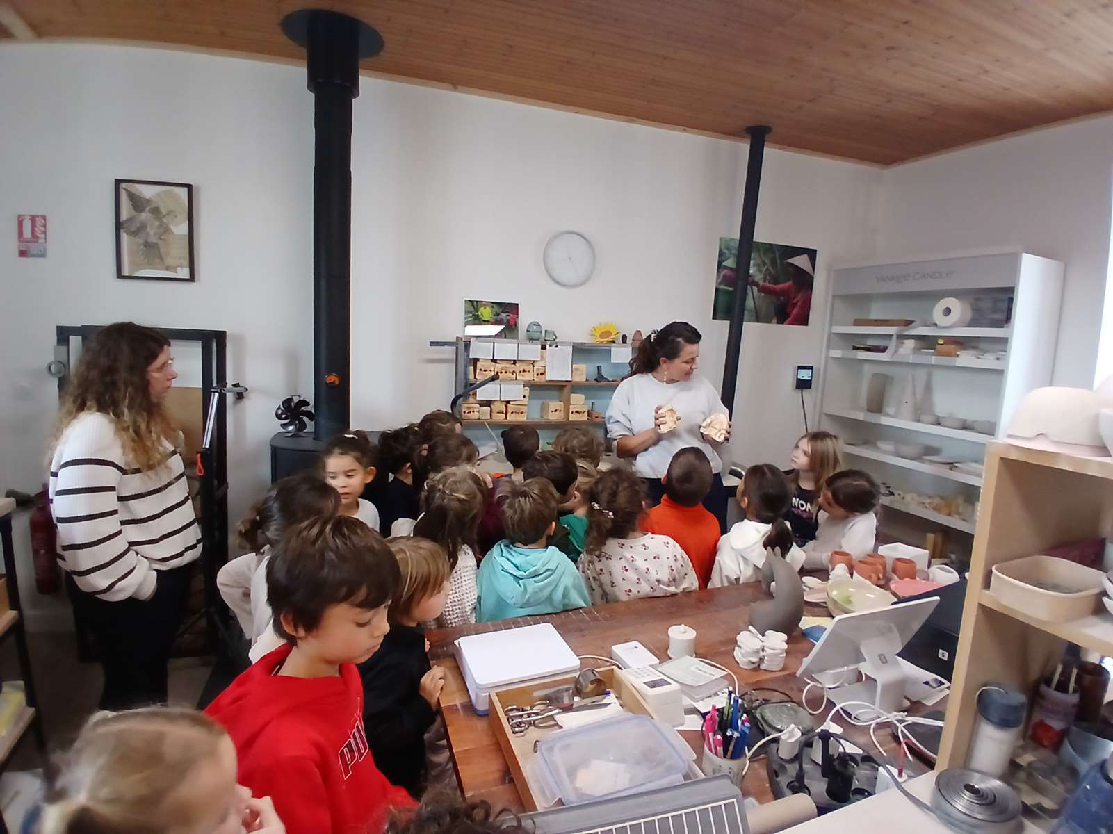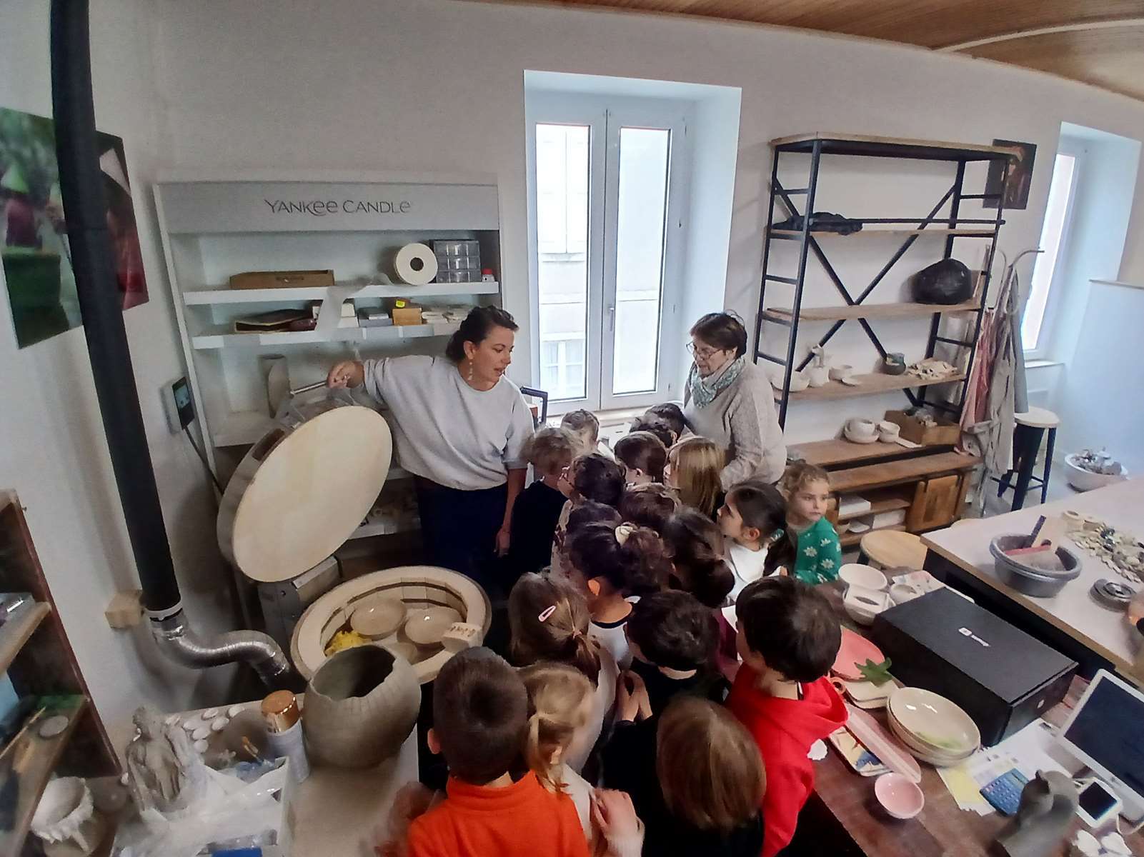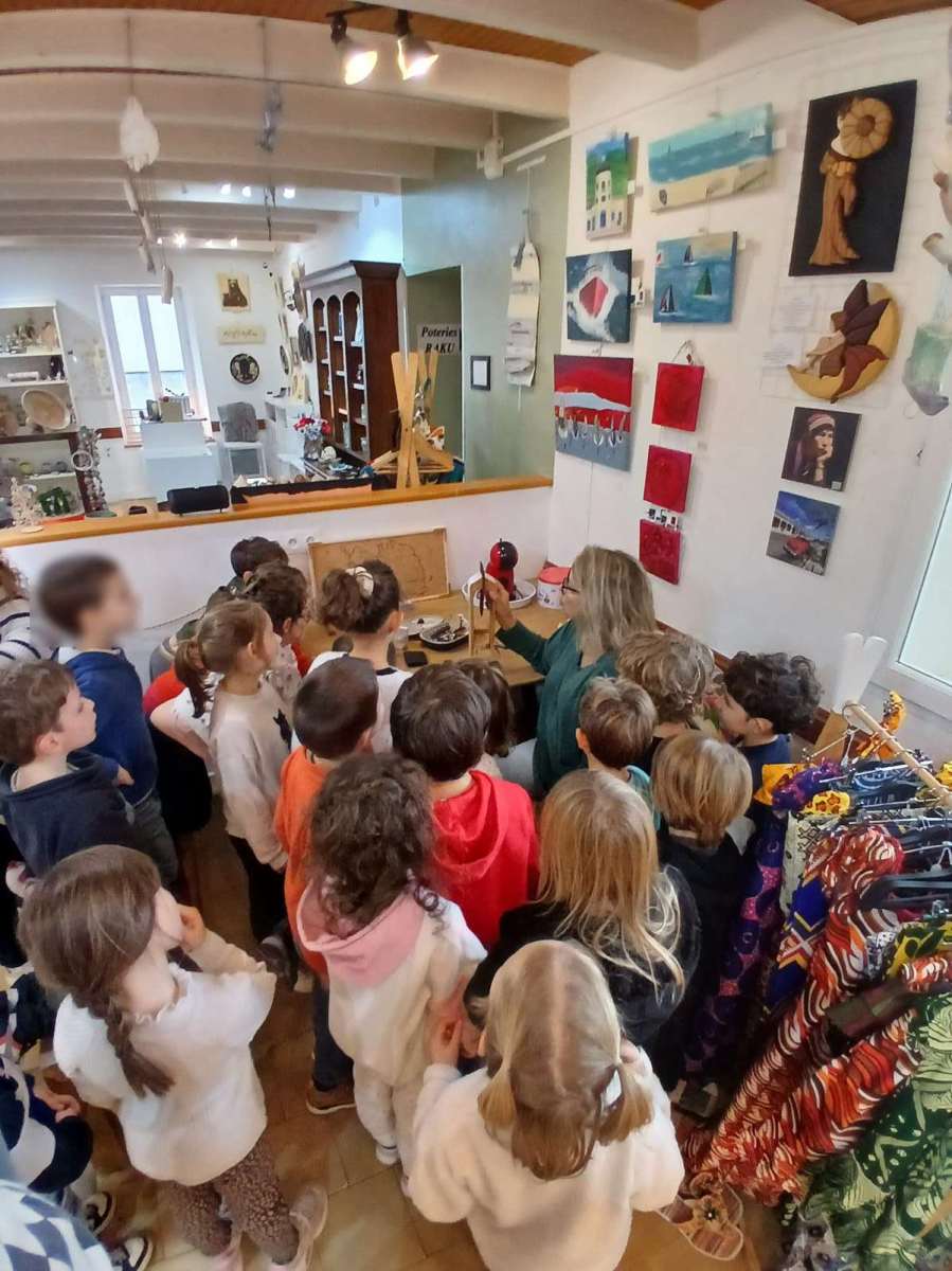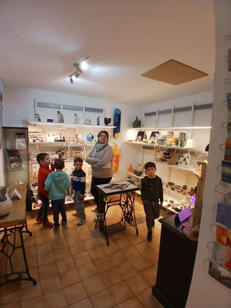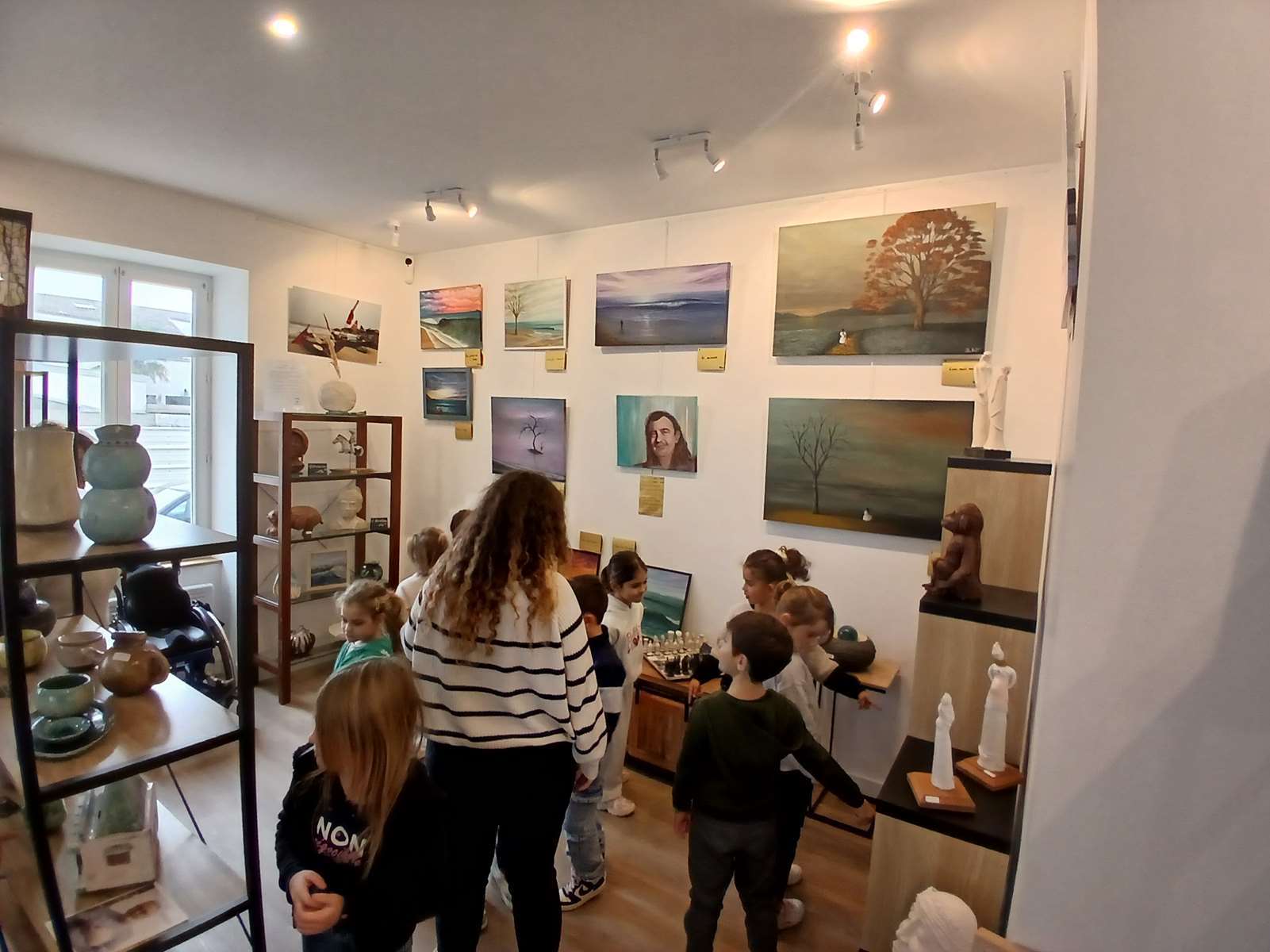 - une galerie où nous avons observé des œuvres : sculptures, photographie, joaillerie, pastels, objets détournés, céramique… Winifred nous a expliqué les différences avec un musée.