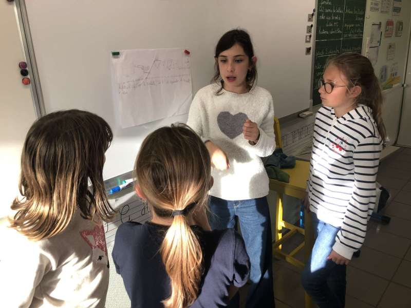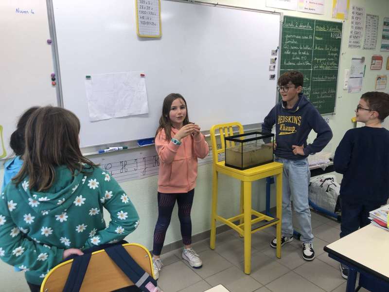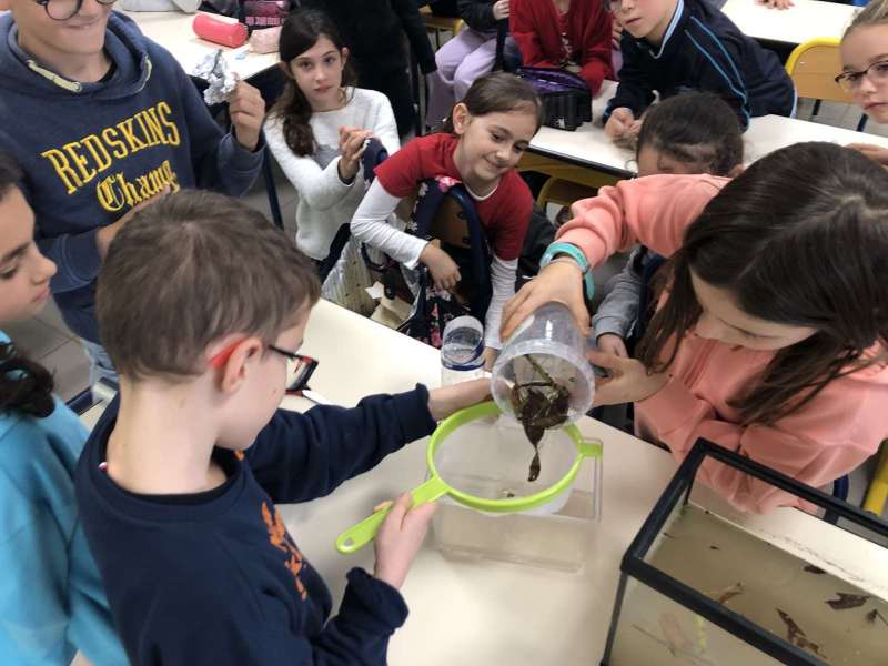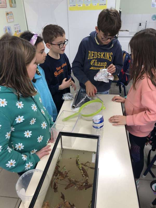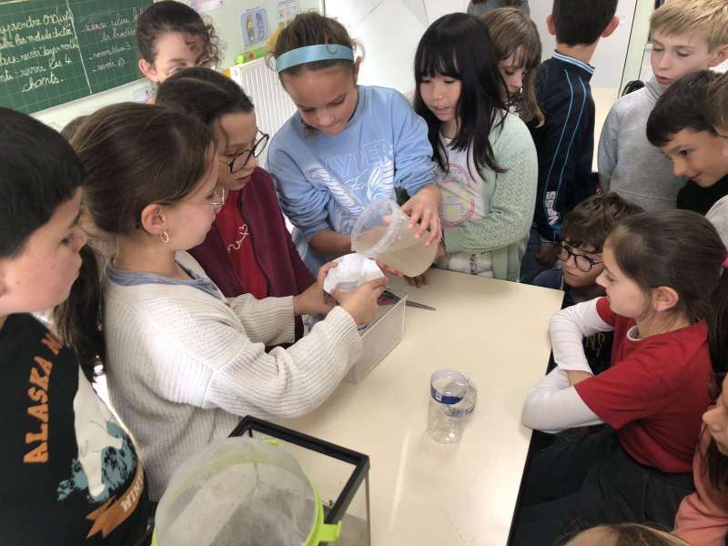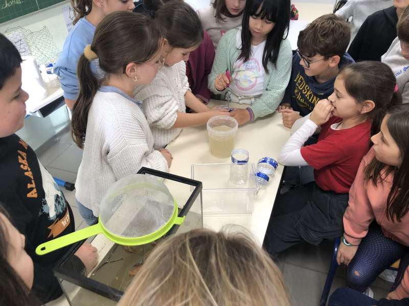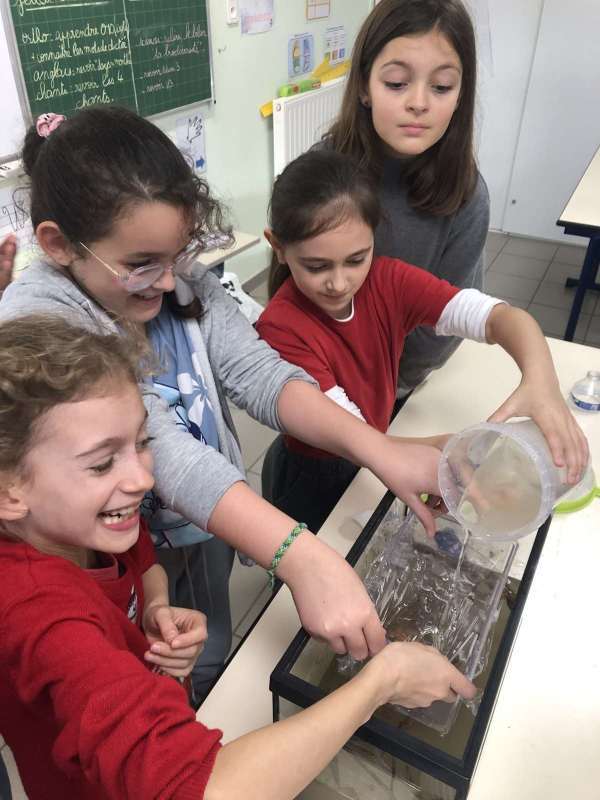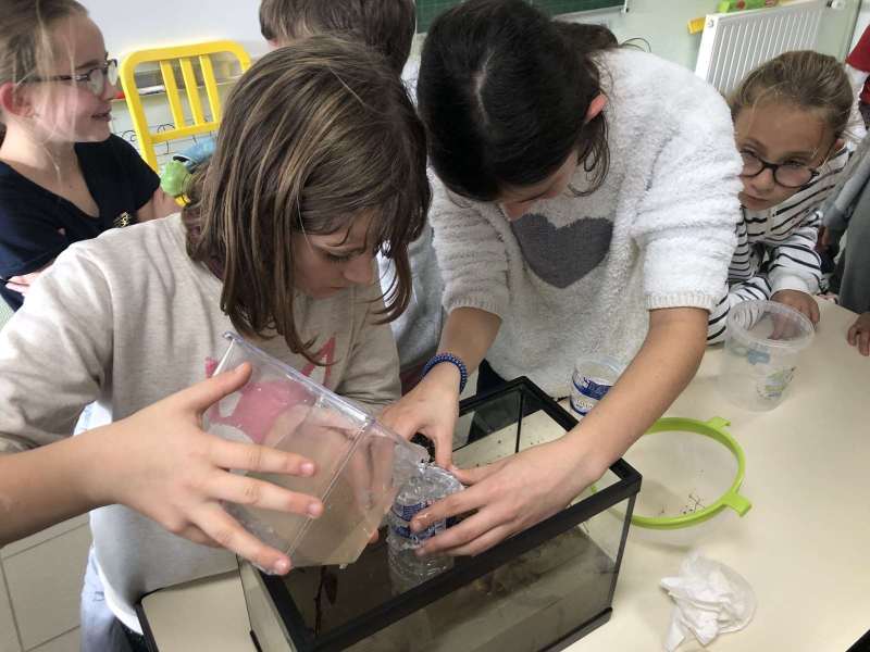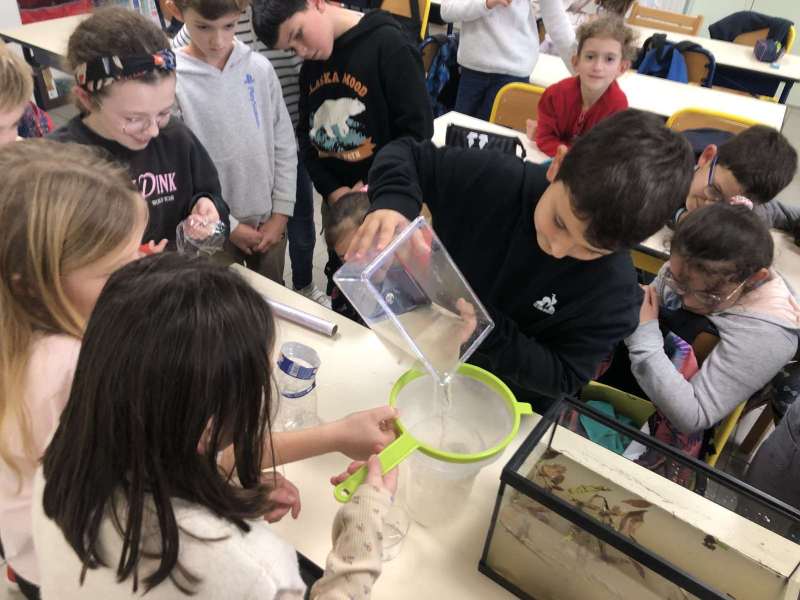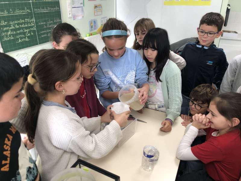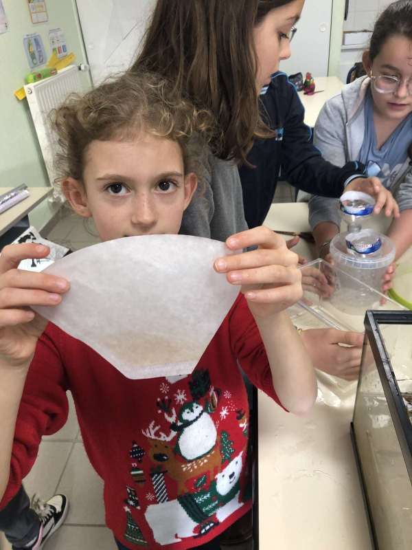 En sciences, nous avons nettoyé l’eau du robinet qui avait été mélangée avec de la terre, des feuilles et des petits cailloux.