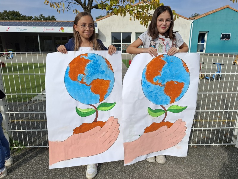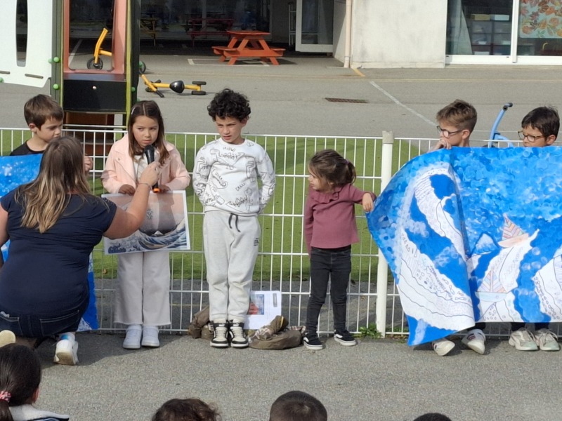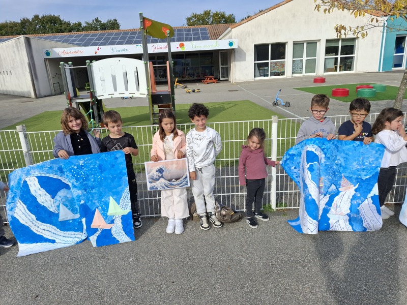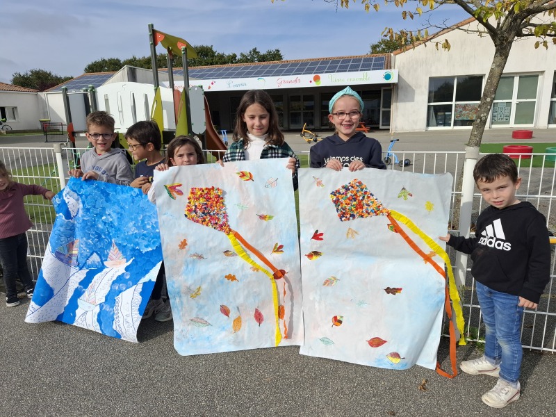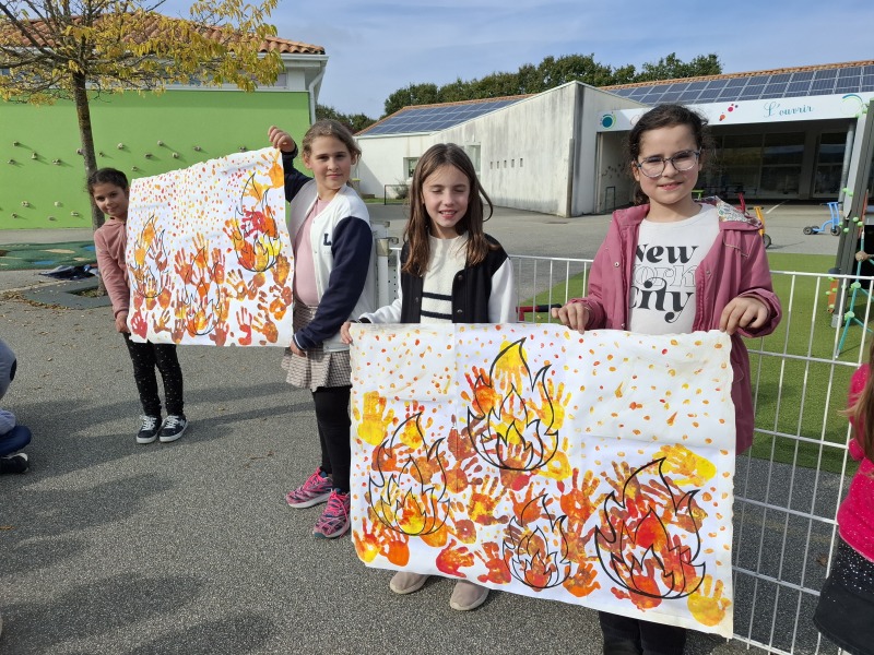 Tous les élèves de l’école, en mélangeant les classes, ont créé de jolis panneaux artistiques sur les 4 éléments de la nature : l’eau, l’air, la terre et le feu.