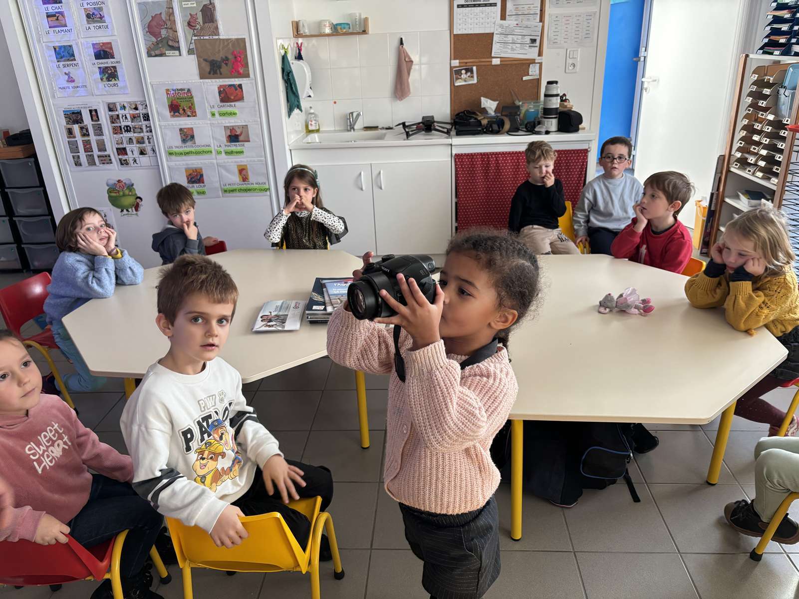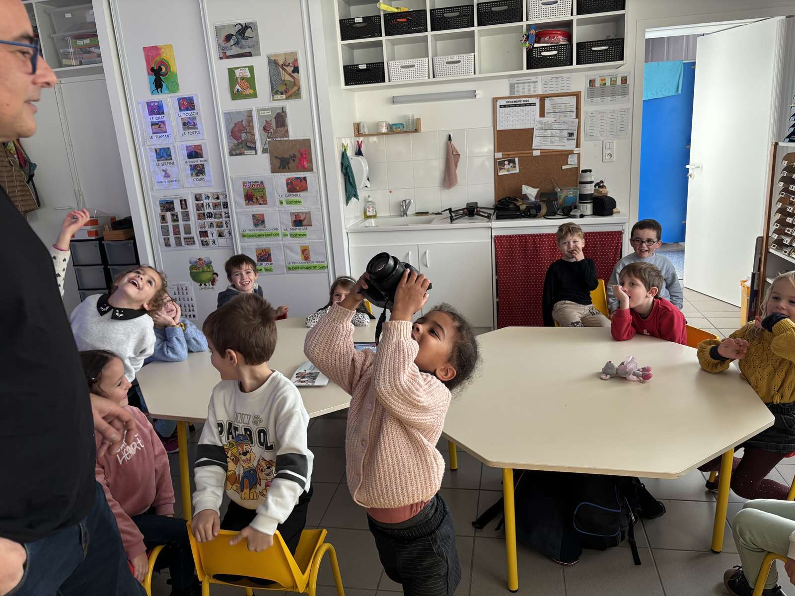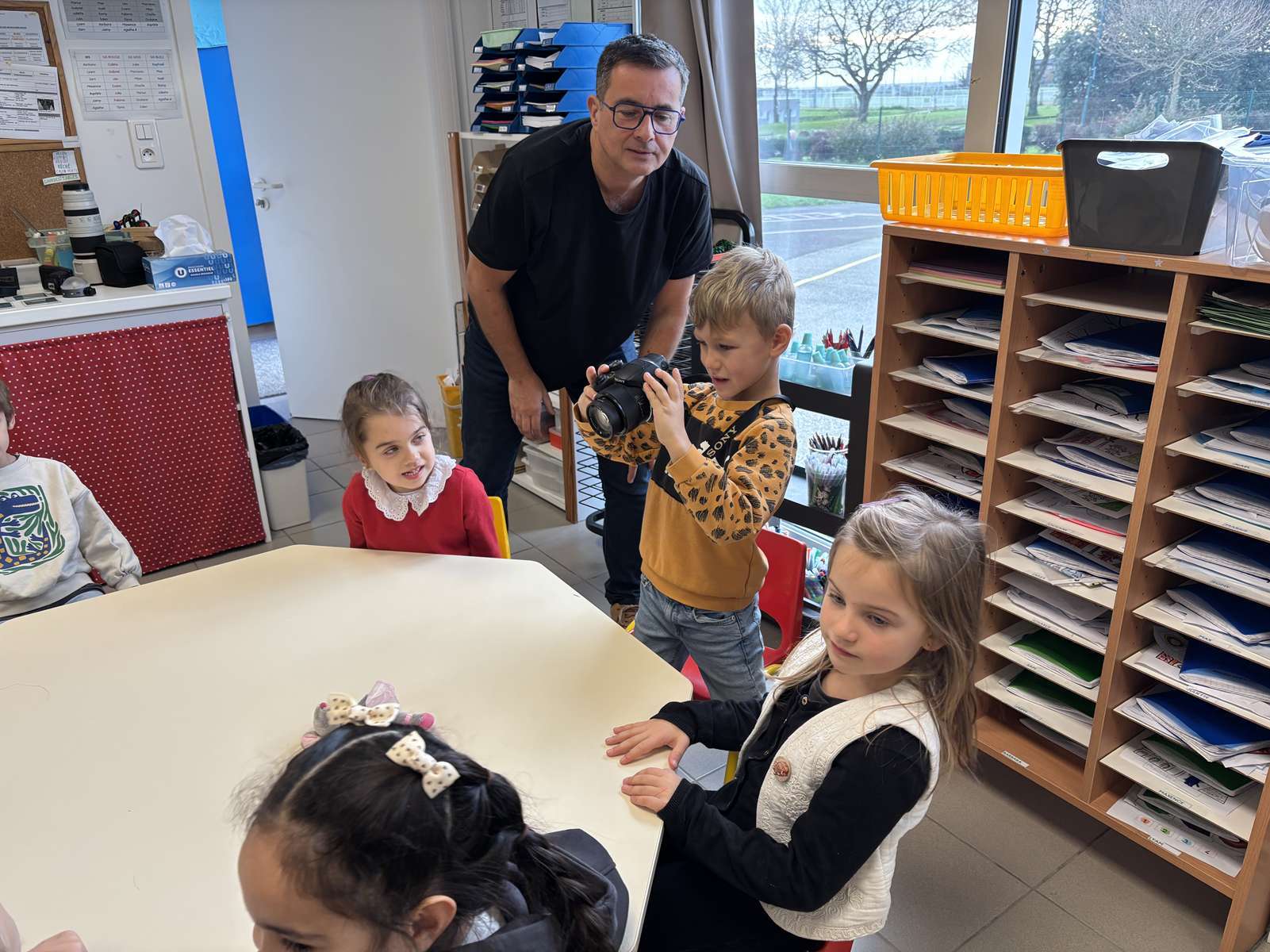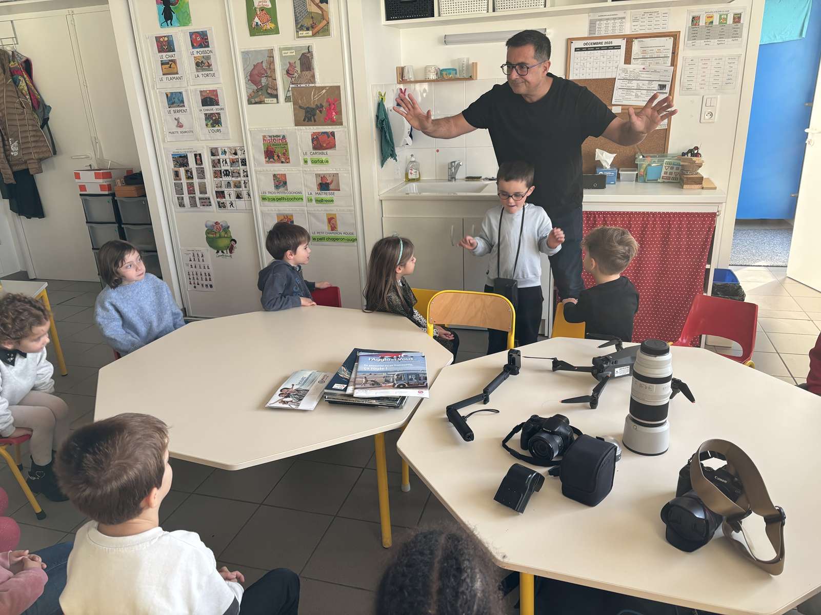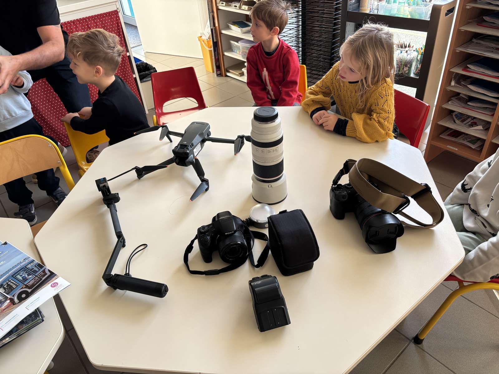 En lien avec notre projet sur l’Art et pour illustrer notre travail sur la photographie, Jean-François Brossier (papy de Romy) est venu nous présenter son métier de photographe. Il est arrivé dans la classe ce matin, le sac chargé de plusieurs appareils photos (polaroïds, numériques, …) , d’une GoPro, d’ un drone et d’énormes zooms. Il nous a expliqué comment utiliser tout ce matériel. Nous avons pu prendre des photos. Nous avons également pris la pause. Il avait aussi apporté de nombreux clichés, fruits de son travail à la mairie des Sables d’Olonne. Nous avons pris beaucoup de plaisir à les regarder. Un grand merci à Jean-François pour cette belle découverte!