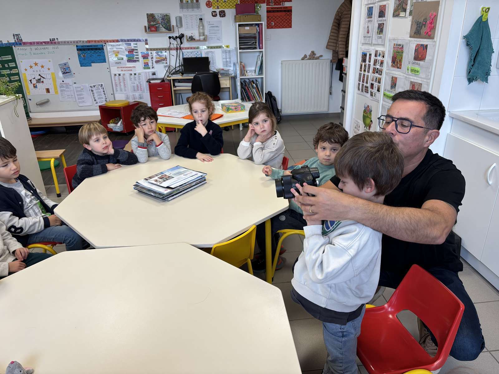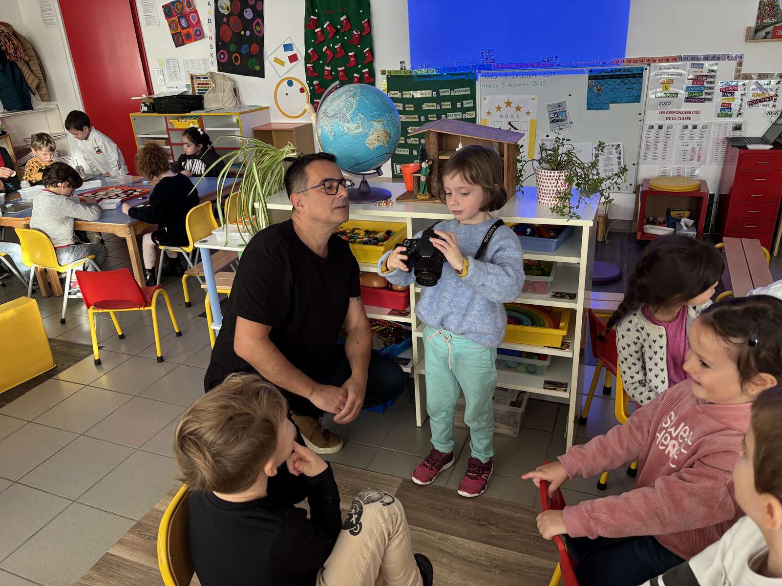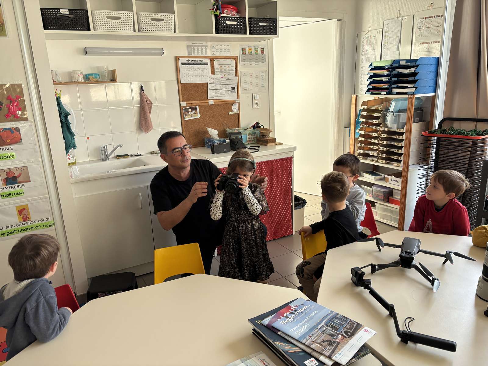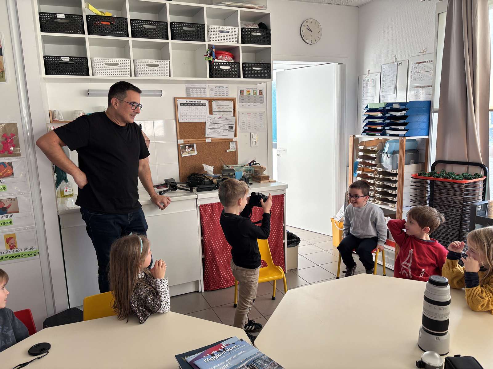 En lien avec notre projet sur l’Art et pour illustrer notre travail sur la photographie, Jean-François Brossier (papy de Romy) est venu nous présenter son métier de photographe. Il est arrivé dans la classe ce matin, le sac chargé de plusieurs appareils photos (polaroïds, numériques, …) , d’une GoPro, d’ un drone et d’énormes zooms. Il nous a expliqué comment utiliser tout ce matériel. Nous avons pu prendre des photos. Nous avons également pris la pause. Il avait aussi apporté de nombreux clichés, fruits de son travail à la mairie des Sables d’Olonne. Nous avons pris beaucoup de plaisir à les regarder. Un grand merci à Jean-François pour cette belle découverte!
