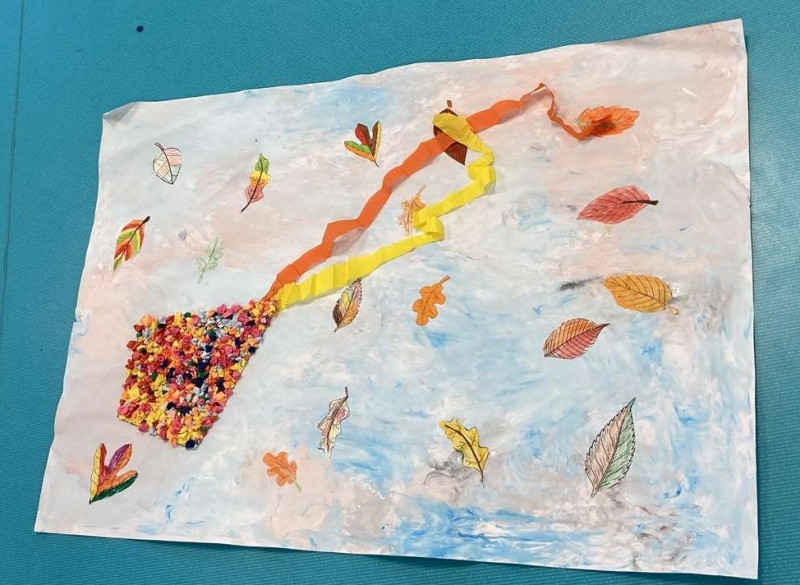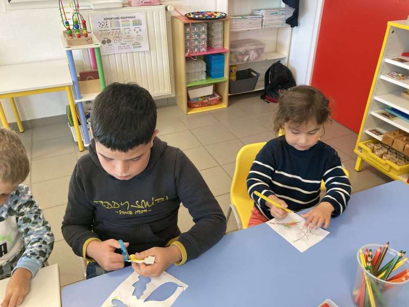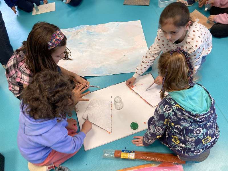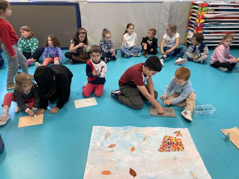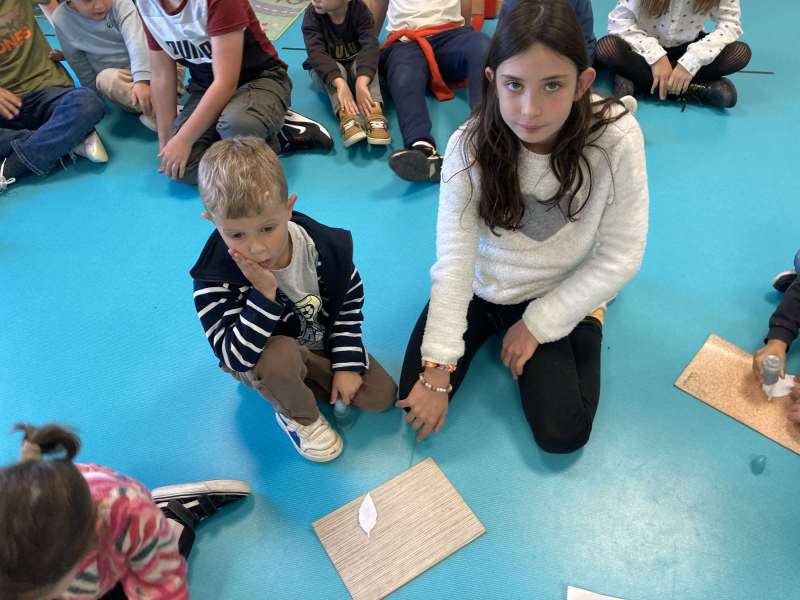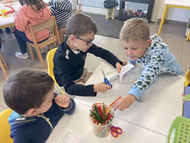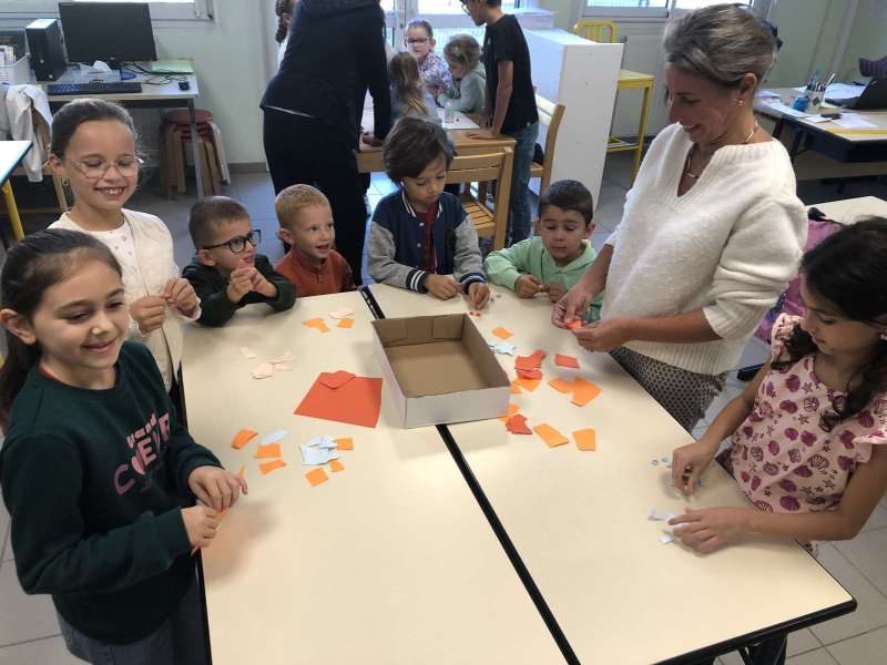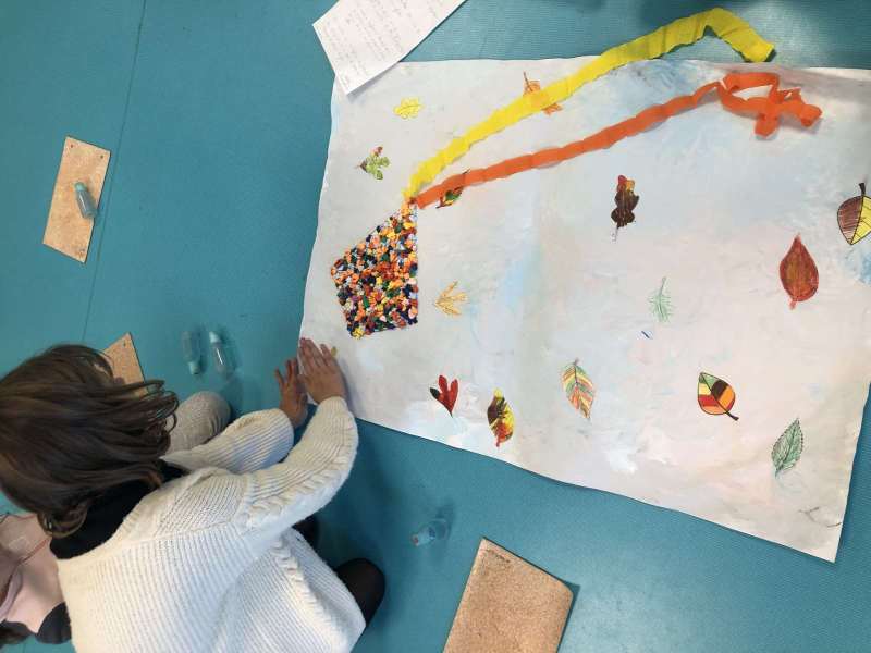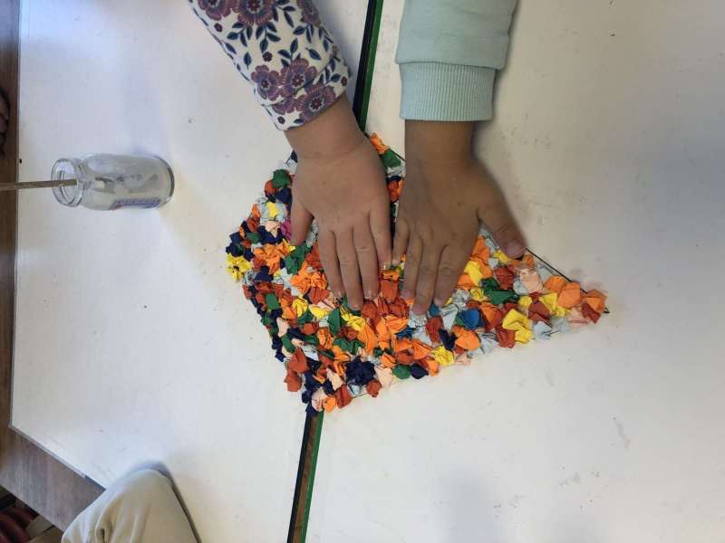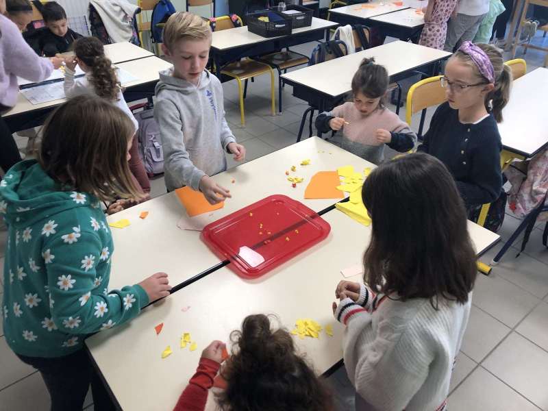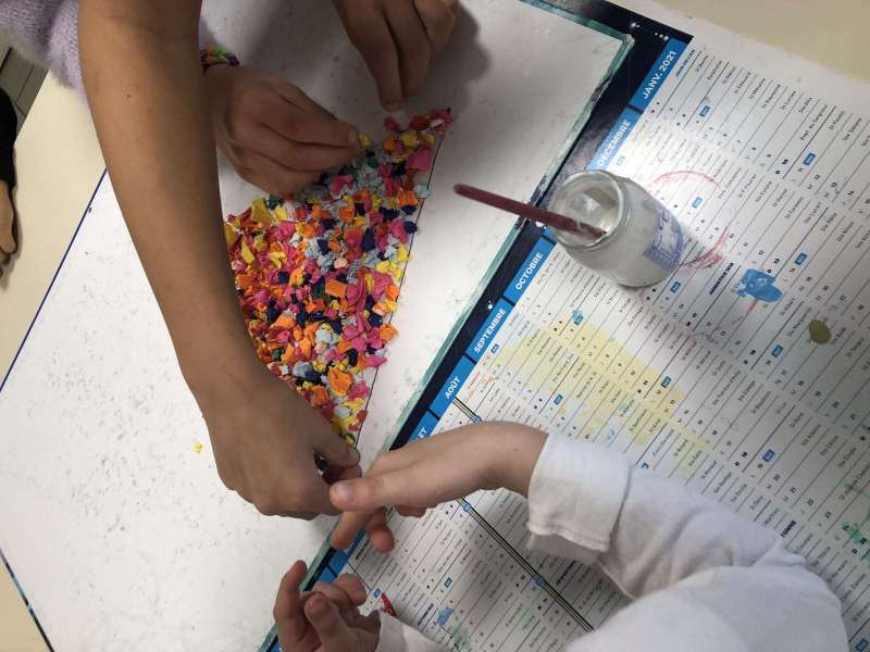 - L’autre moitié a confectionné les cerfs-volants : on a déchiré et roulé des boules de papier que nous avons ensuite collées sur les cerfs-volants.