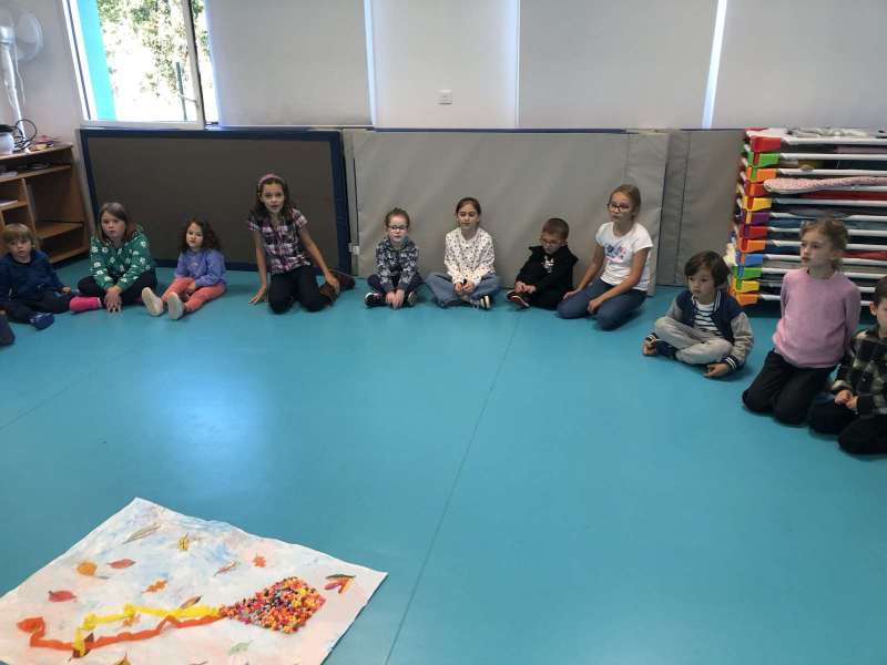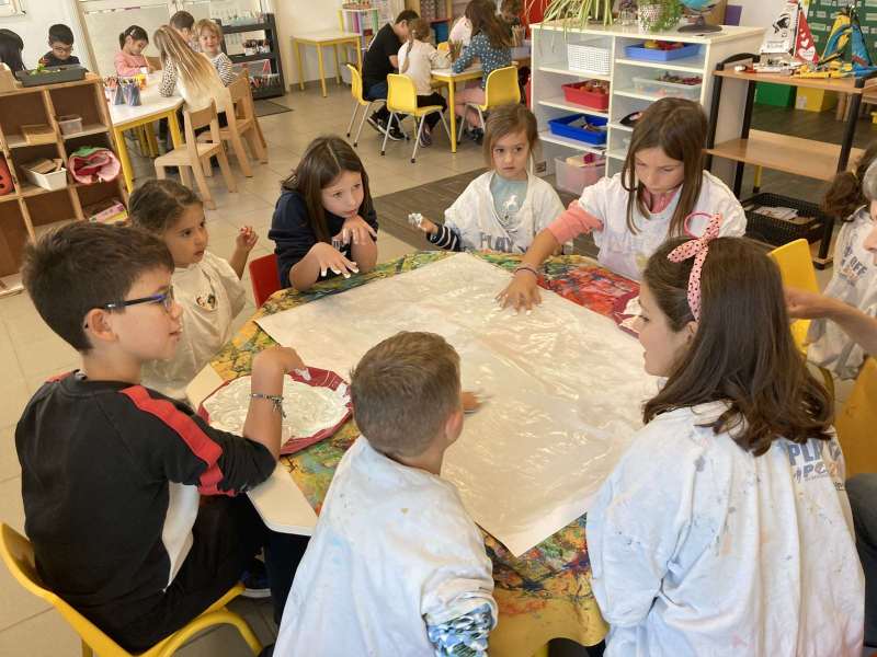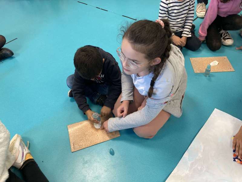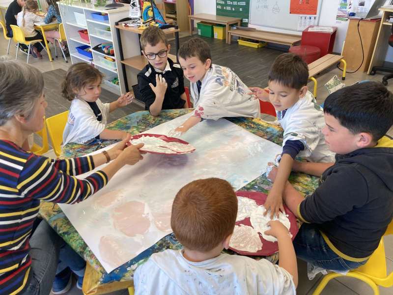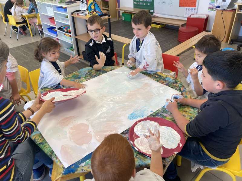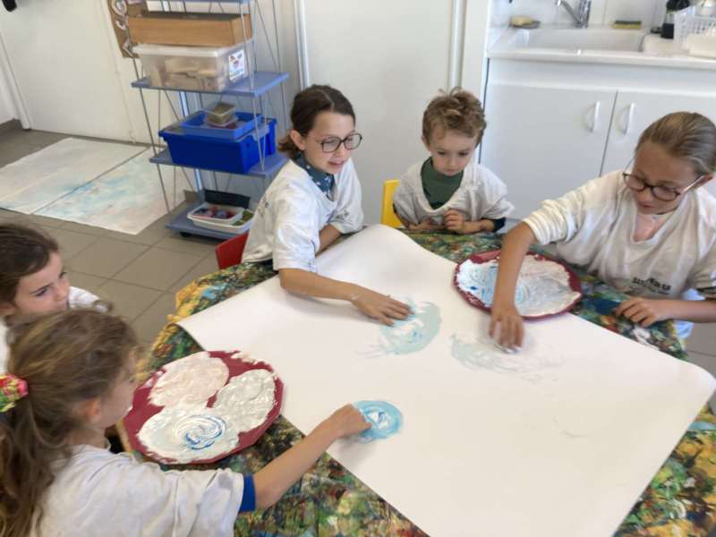 - La moitié du groupe a fait de la peinture: nous avons peint avec les mains du bleu, du rouge, du gris et du blanc.