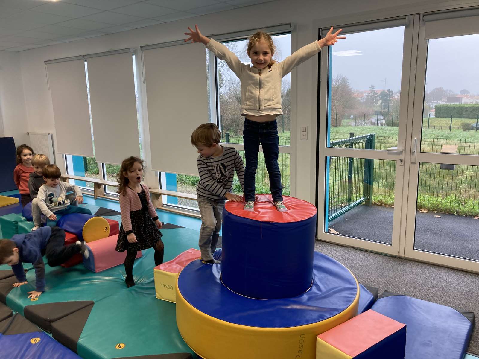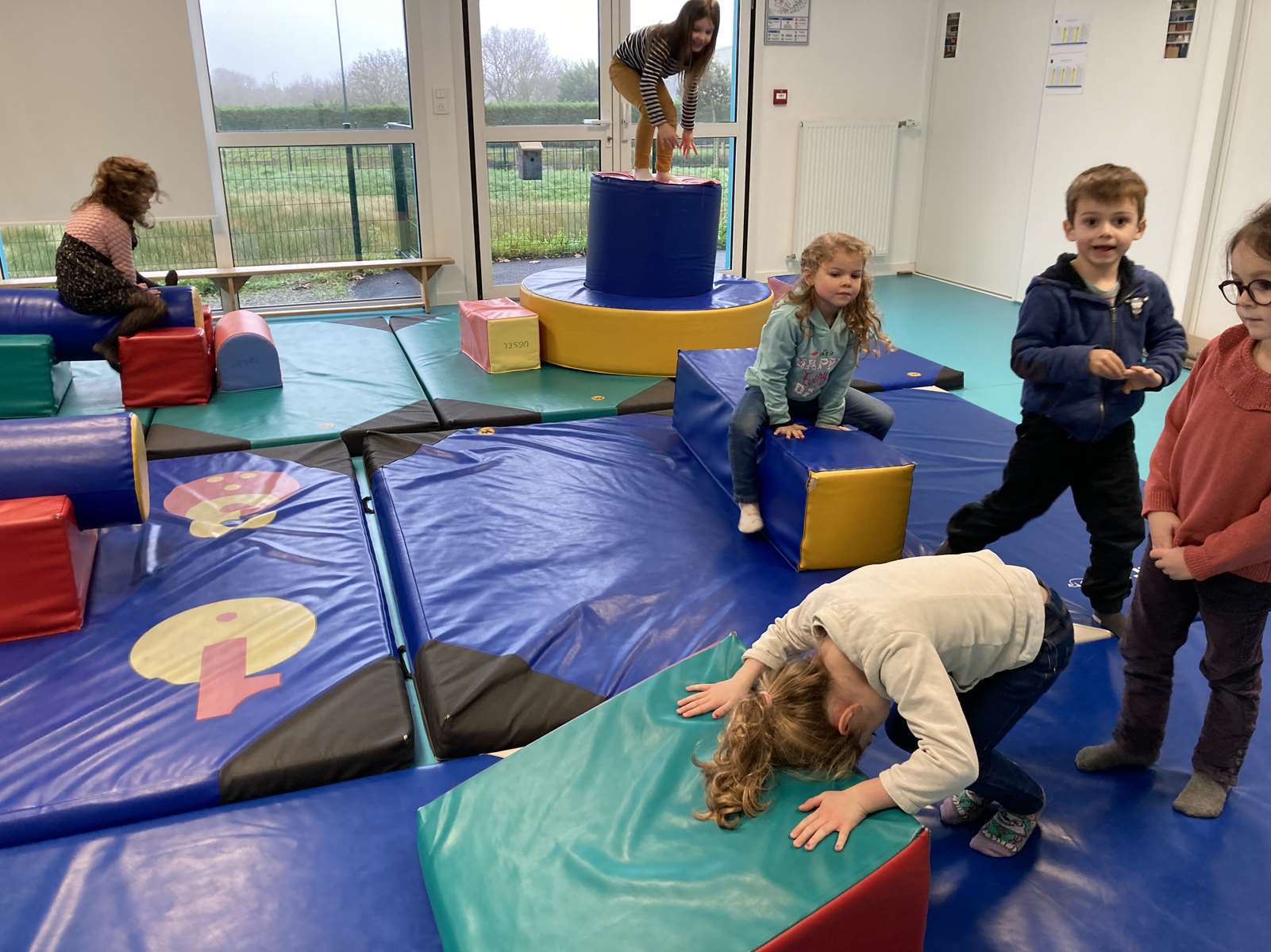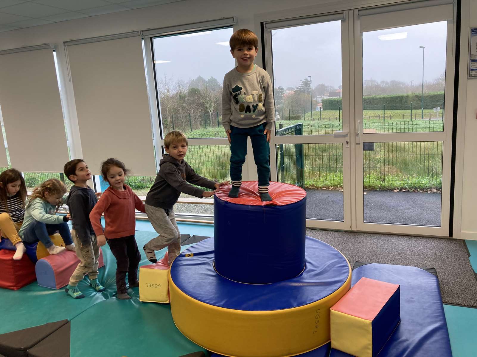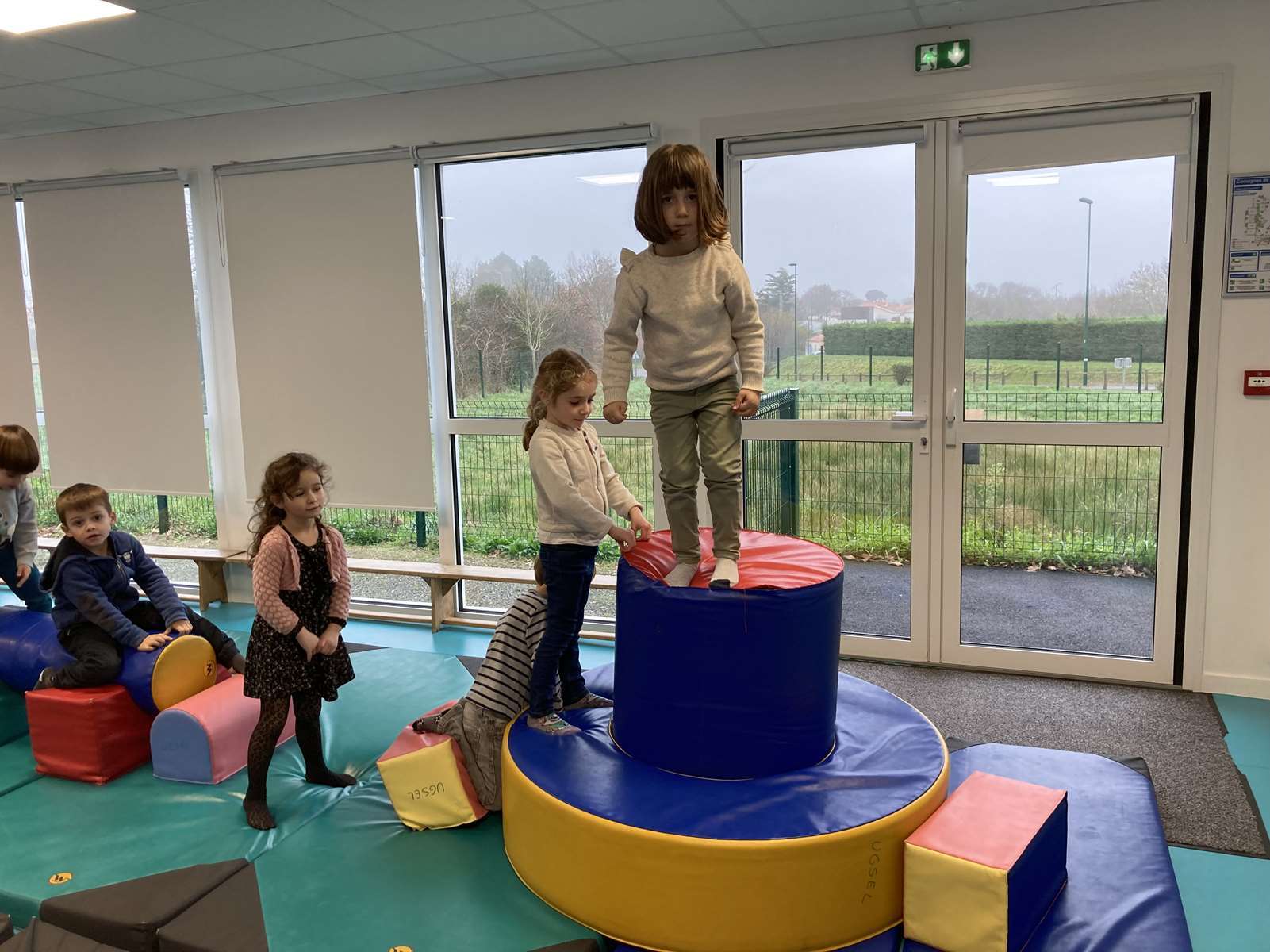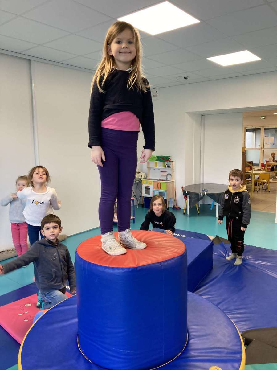 A l’école, dans la salle de motricité, avec les gros modules prêtés par l’UGSEL.