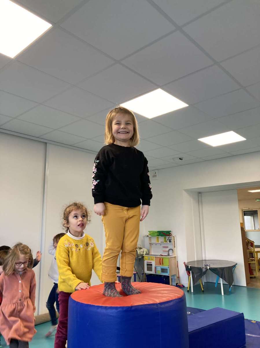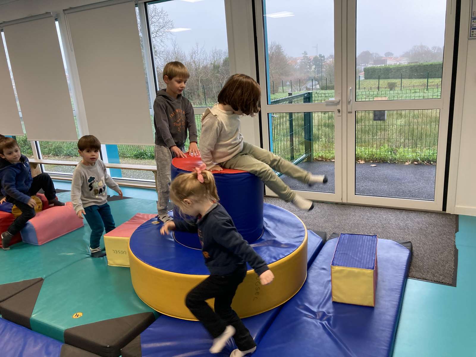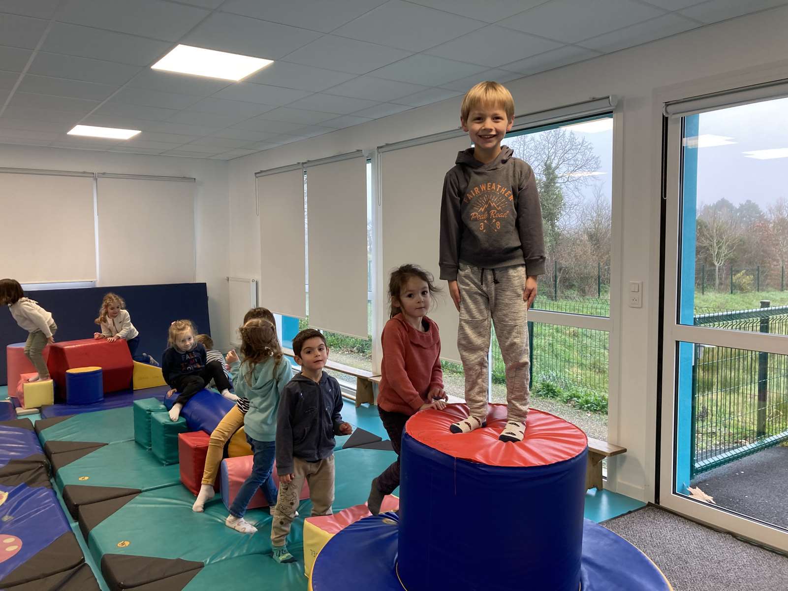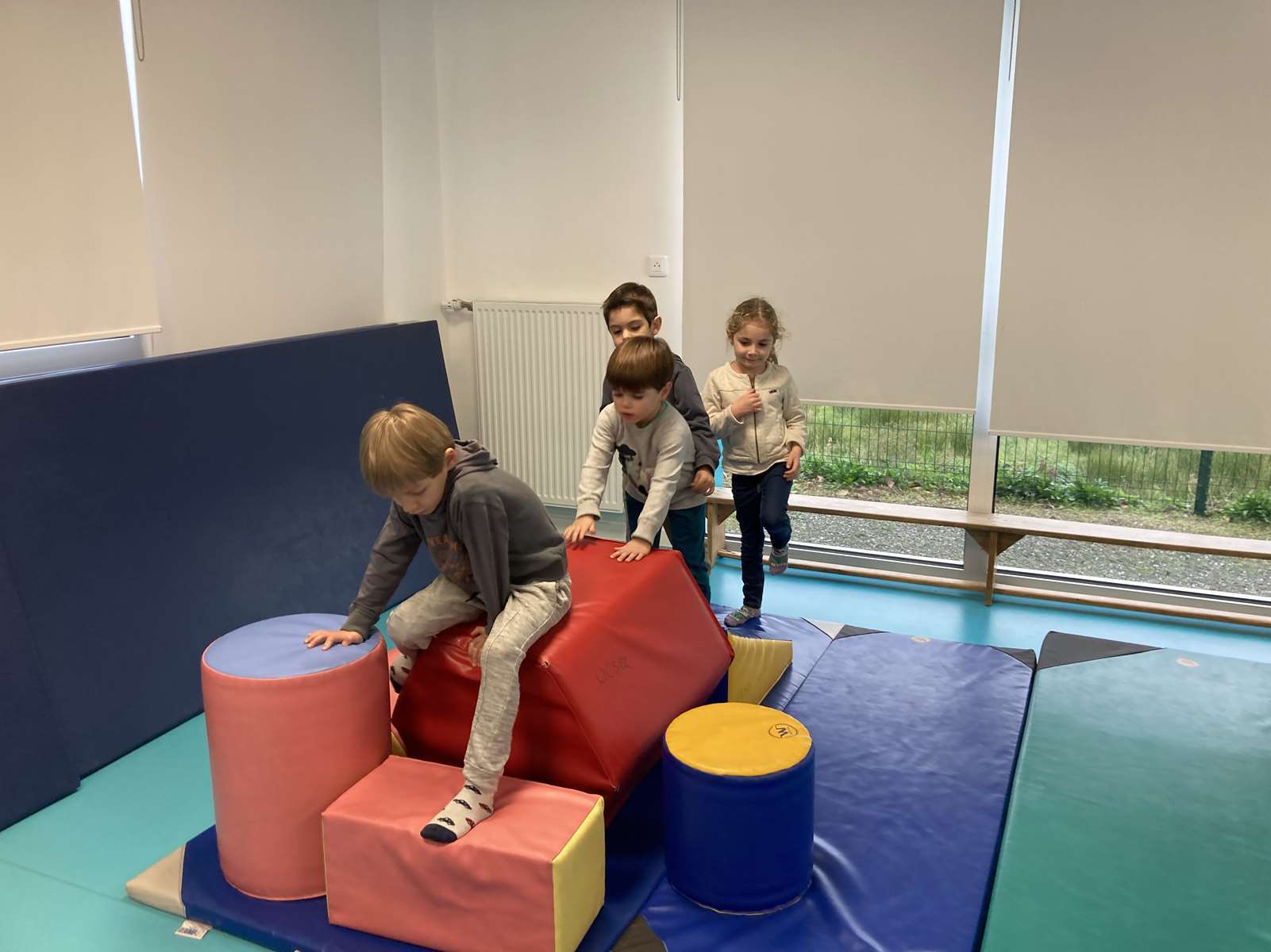 A l’école, dans la salle de motricité, avec les gros modules prêtés par l’UGSEL.