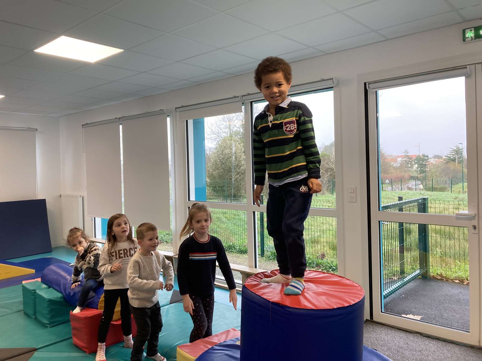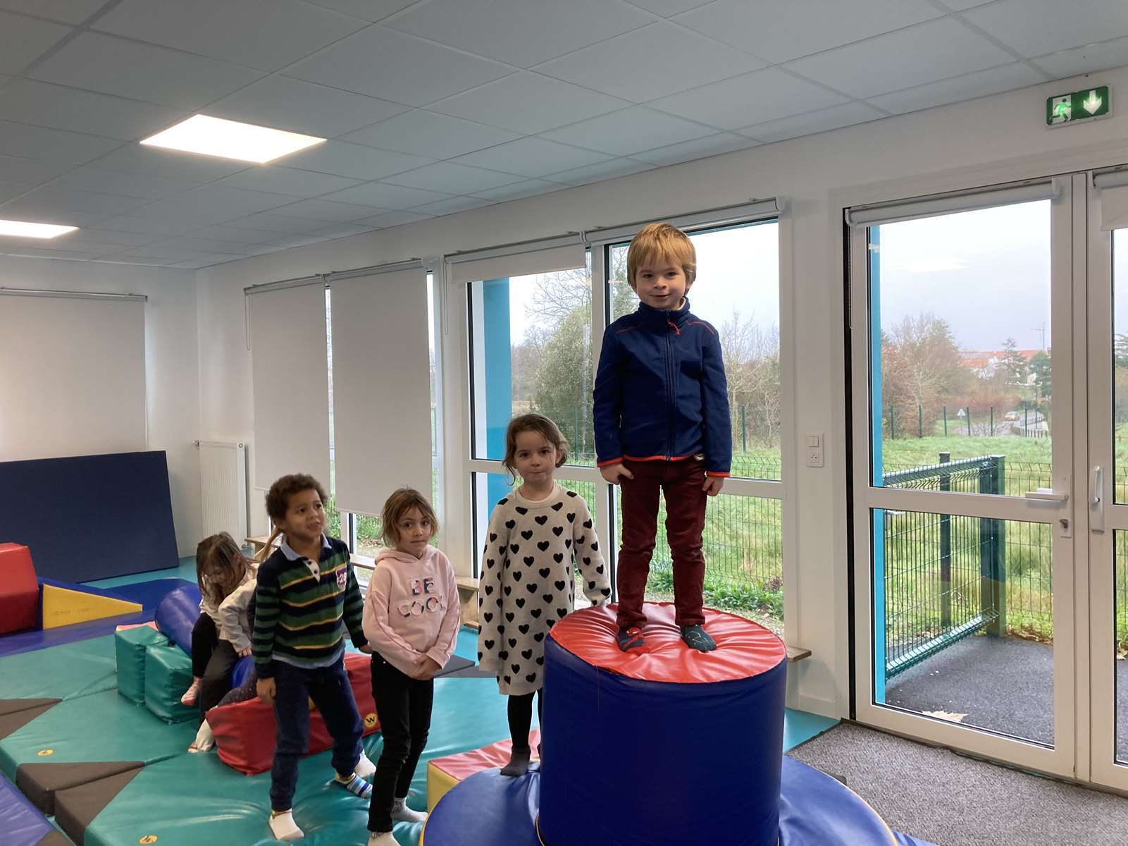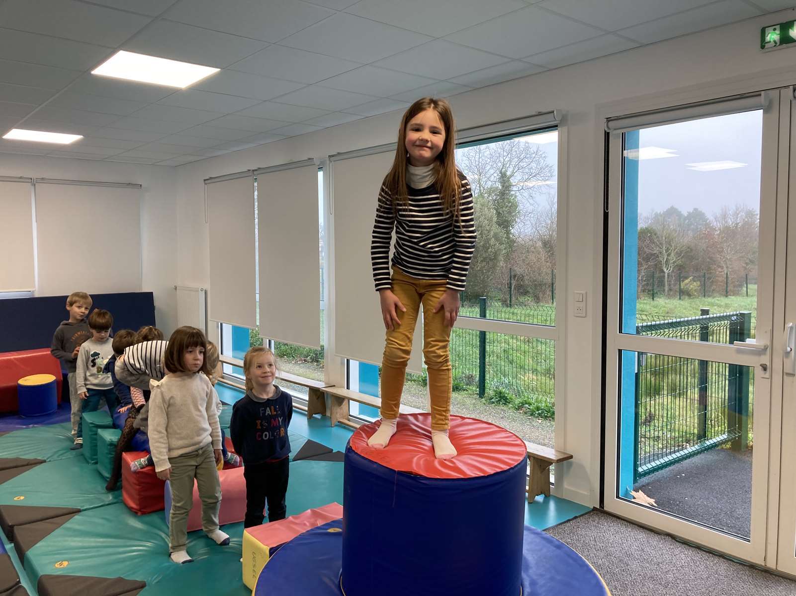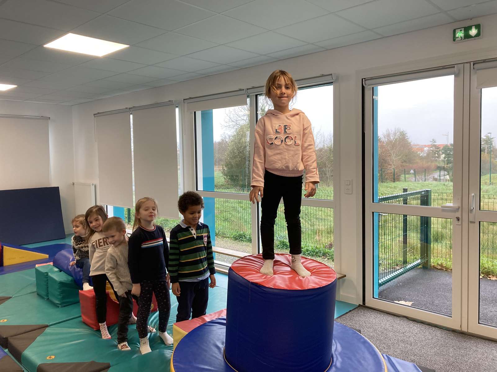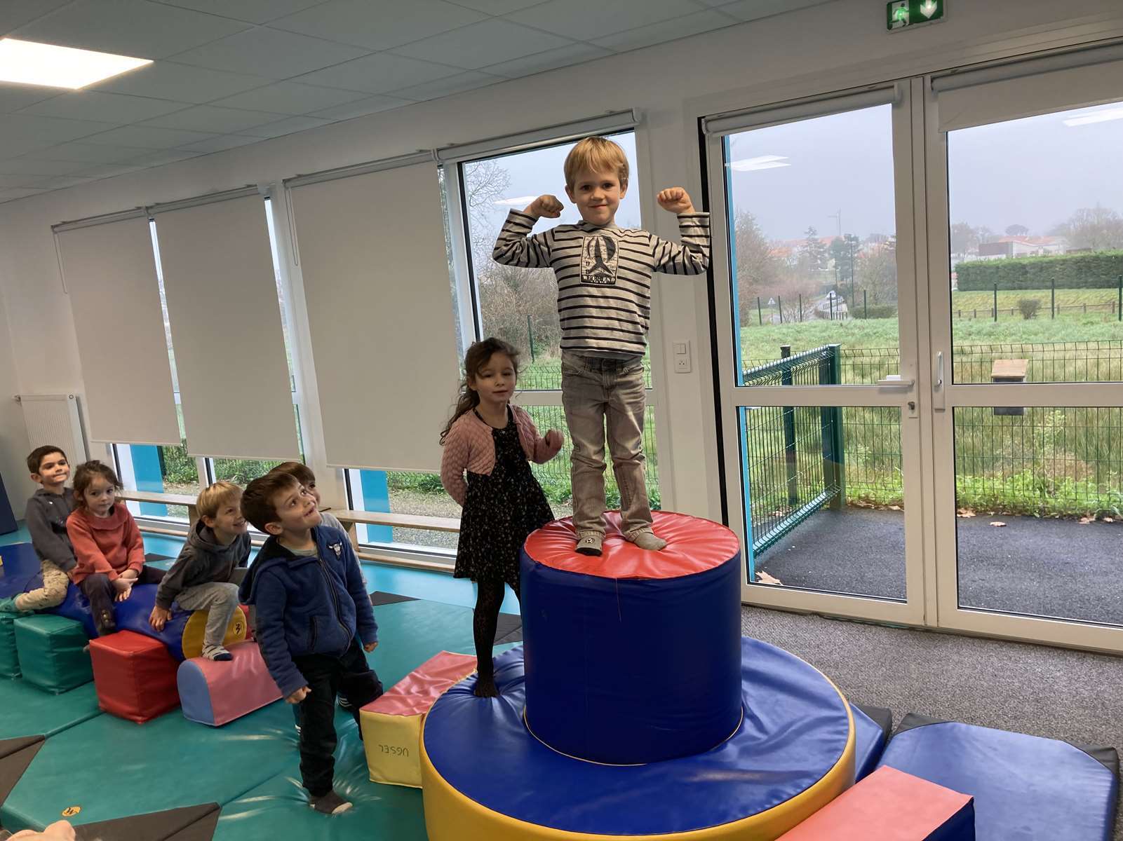A l’école, dans la salle de motricité, avec les gros modules prêtés par l’UGSEL.