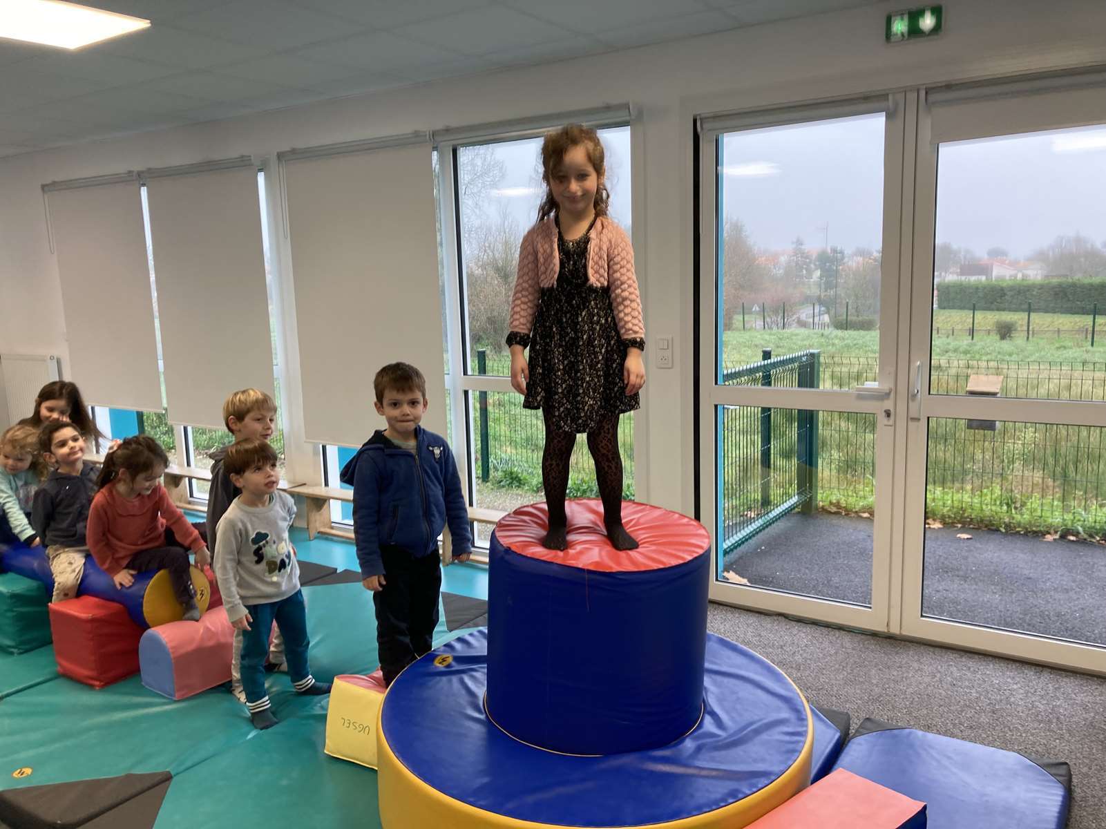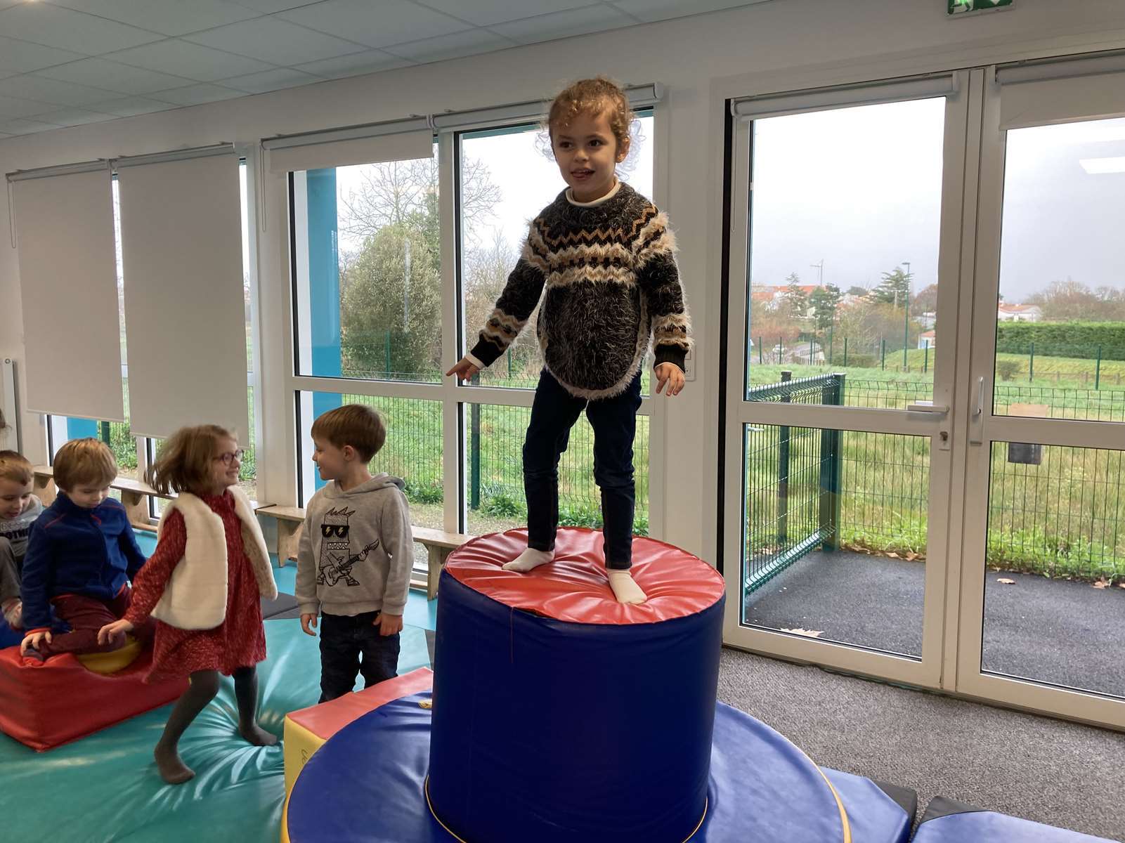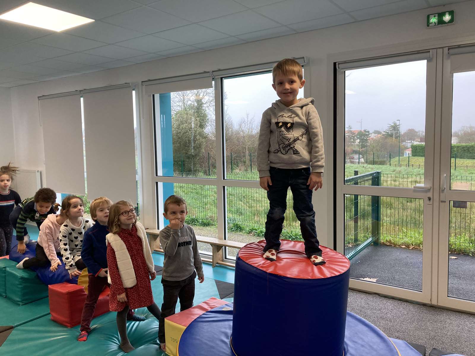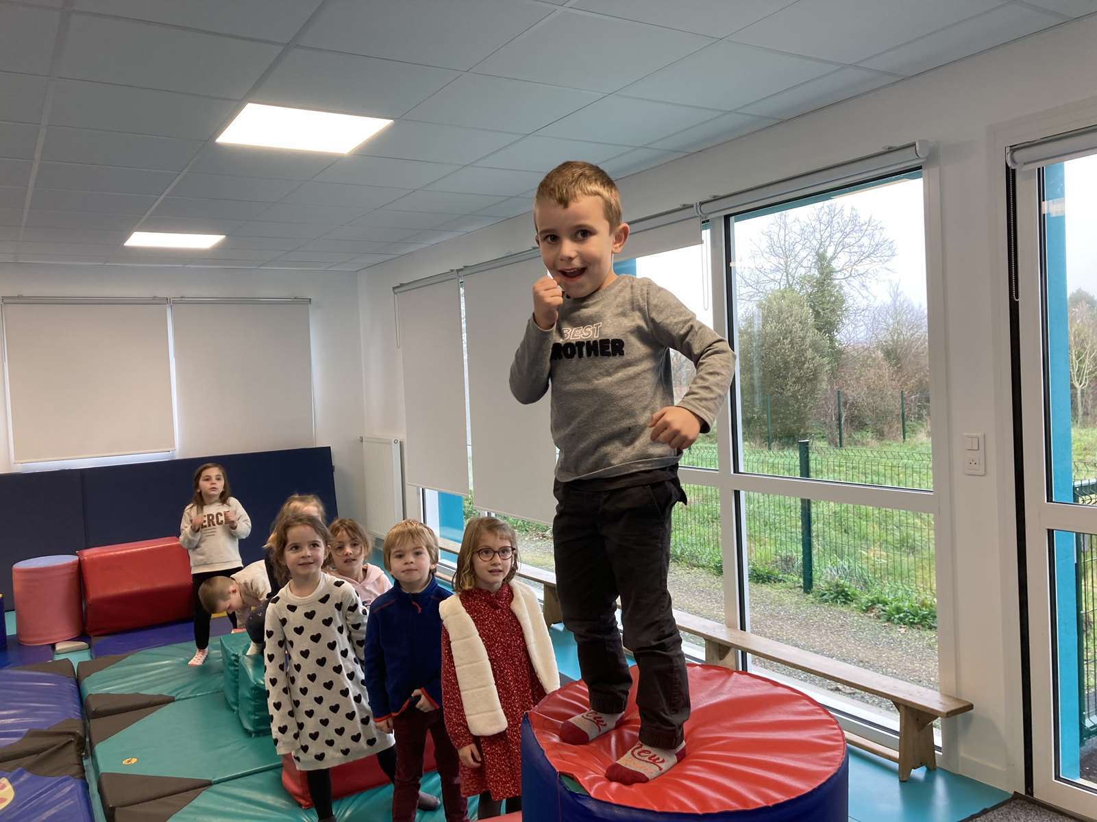 A l’école, dans la salle de motricité, avec les gros modules prêtés par l’UGSEL.