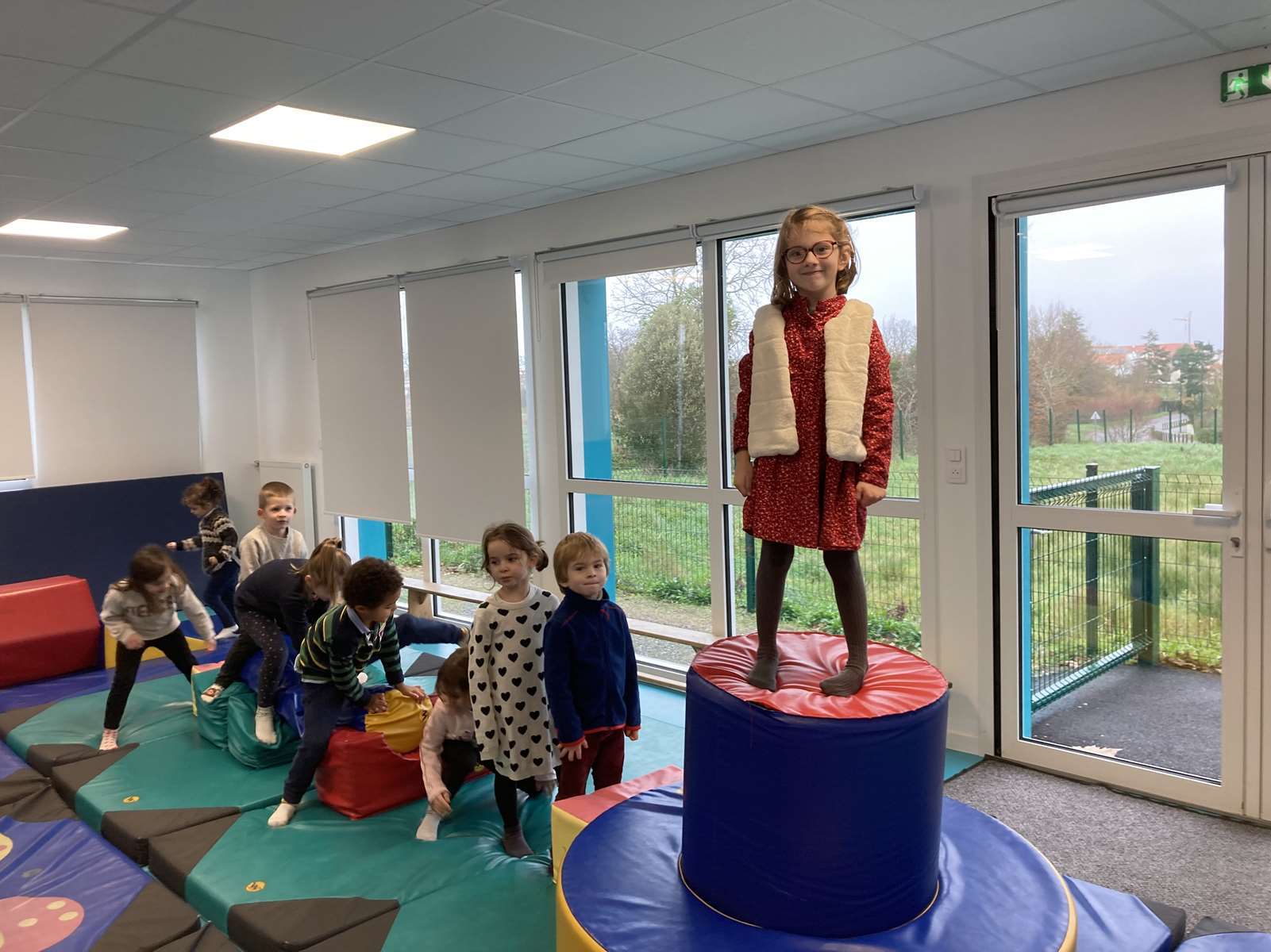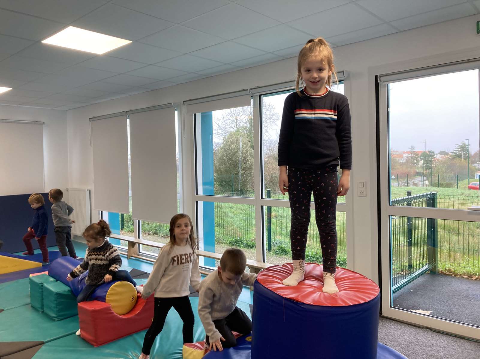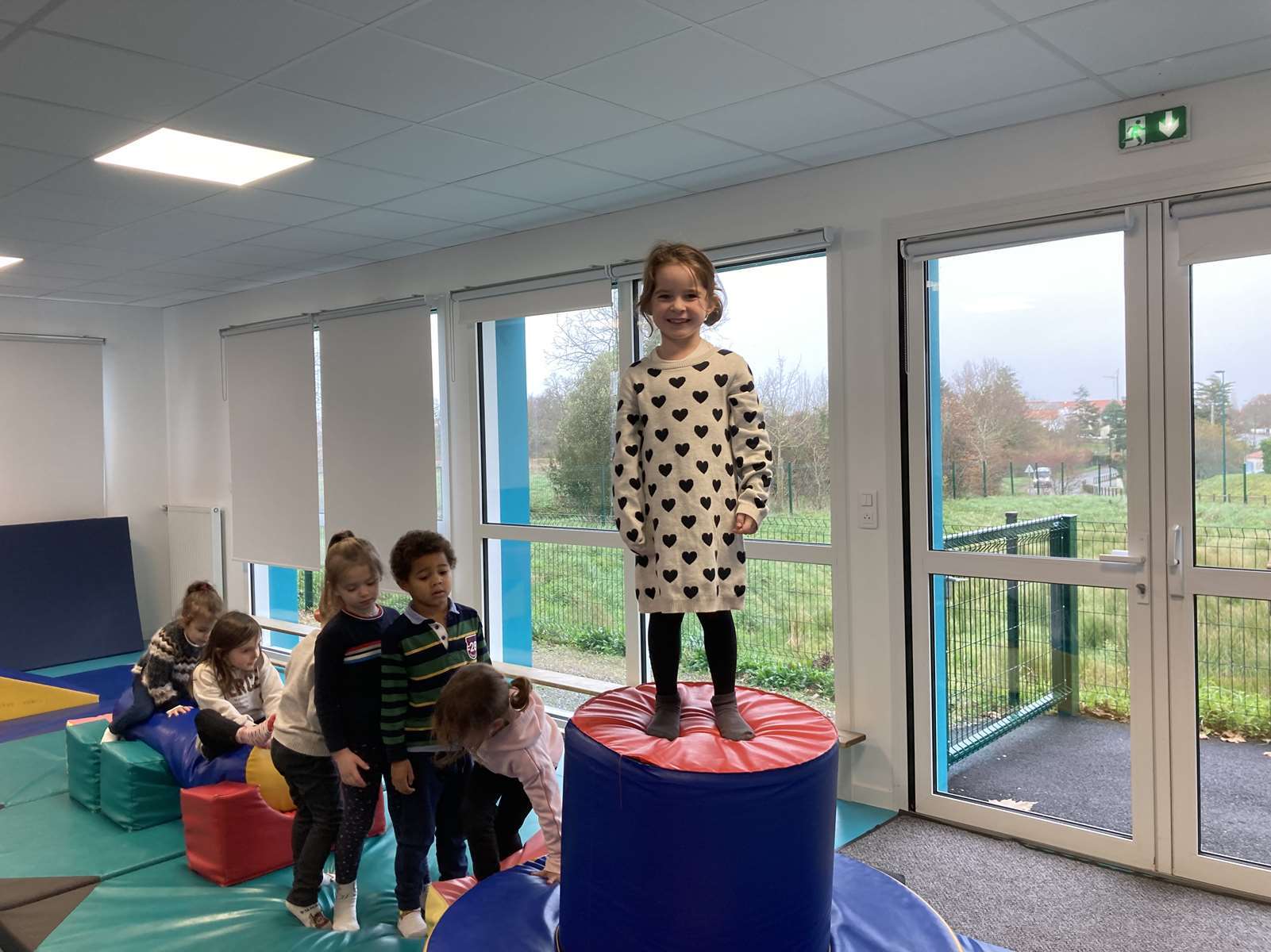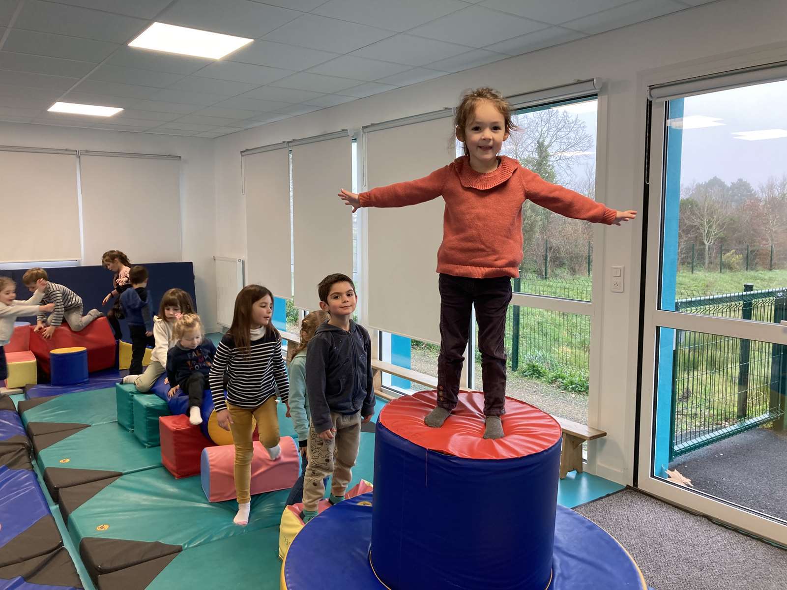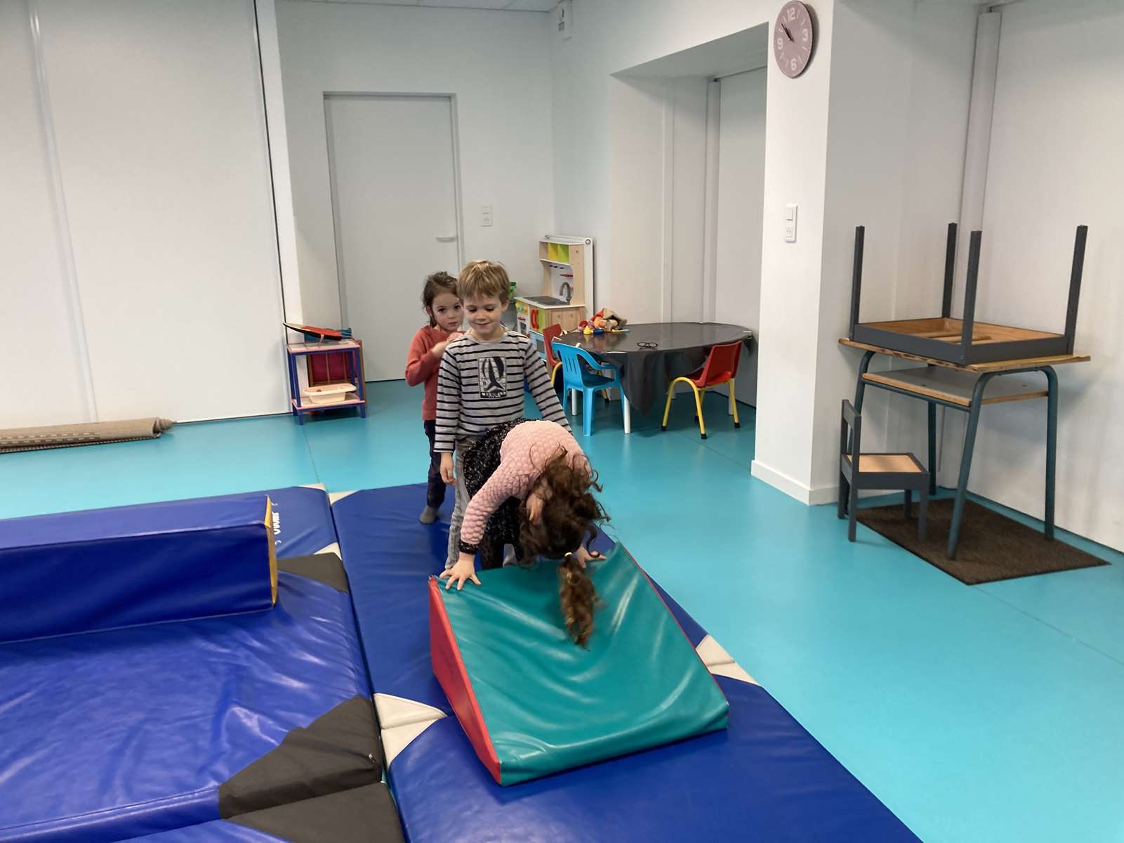 A l’école, dans la salle de motricité, avec les gros modules prêtés par l’UGSEL.