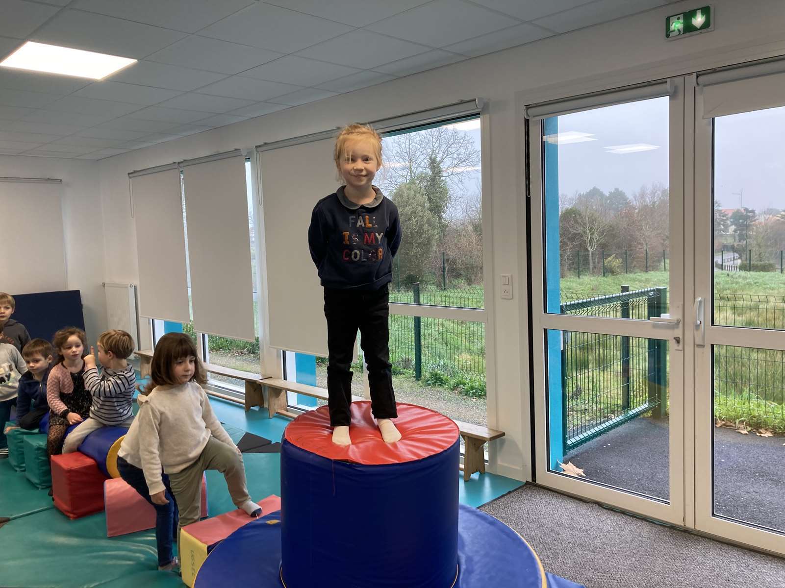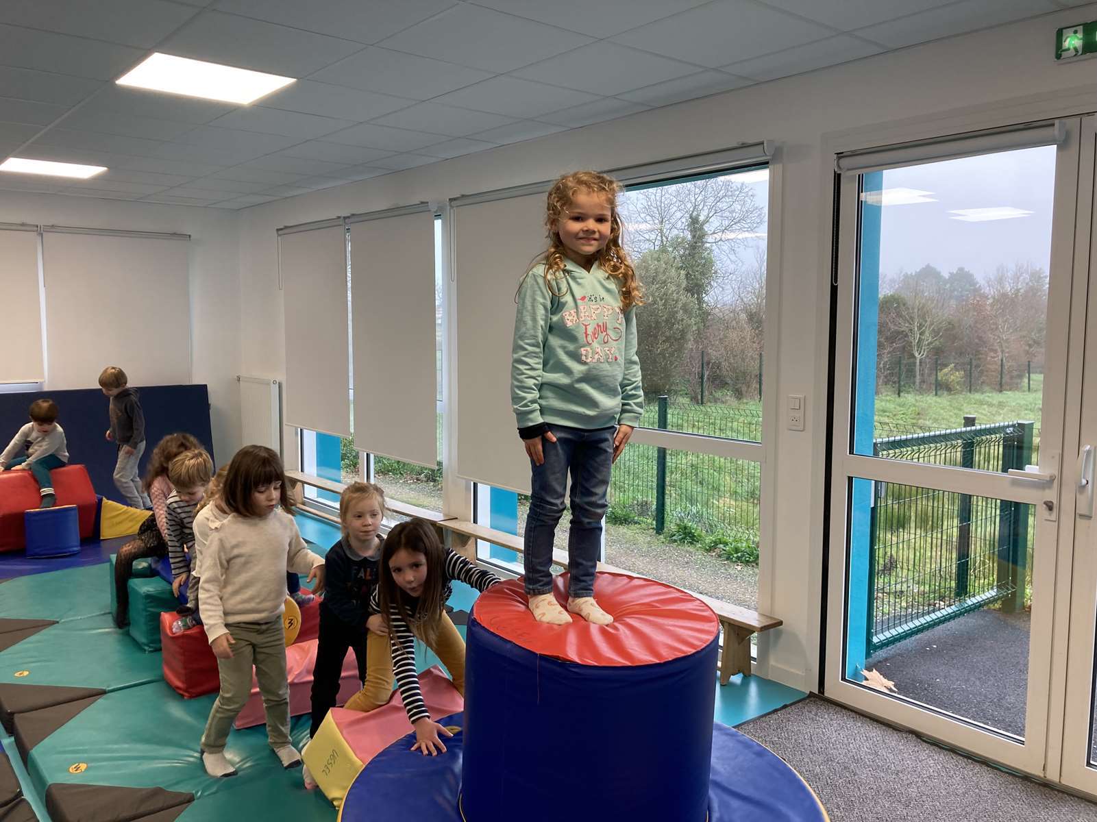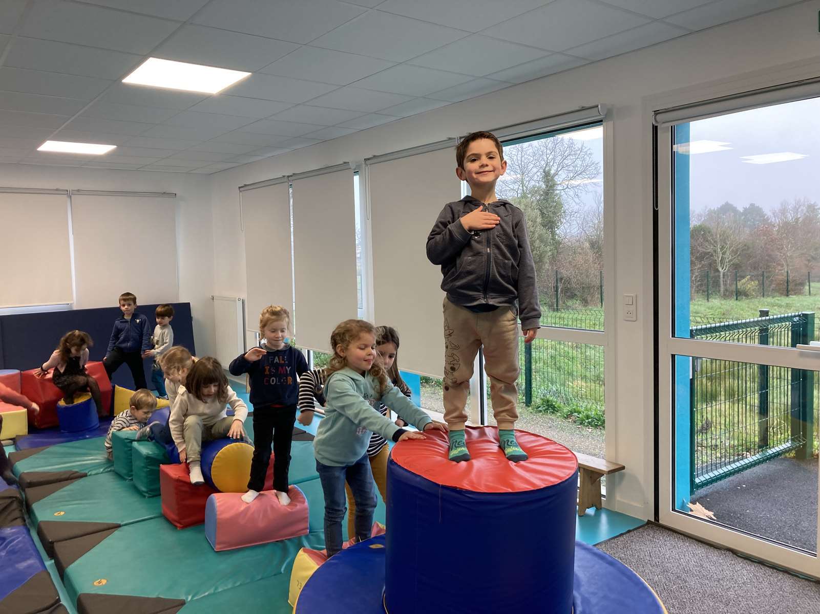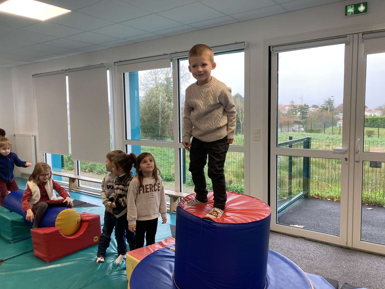 A l’école, dans la salle de motricité, avec les gros modules prêtés par l’UGSEL.