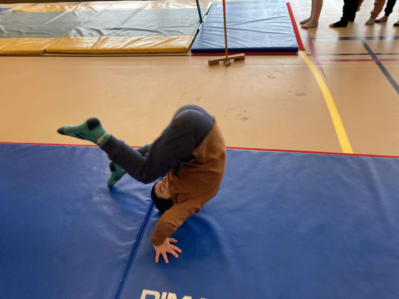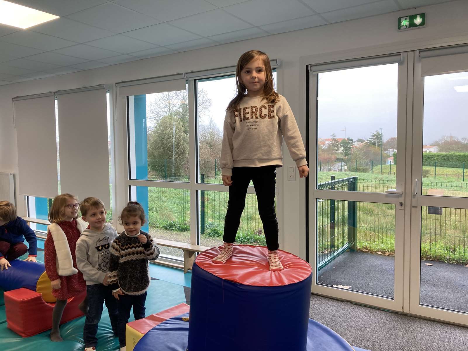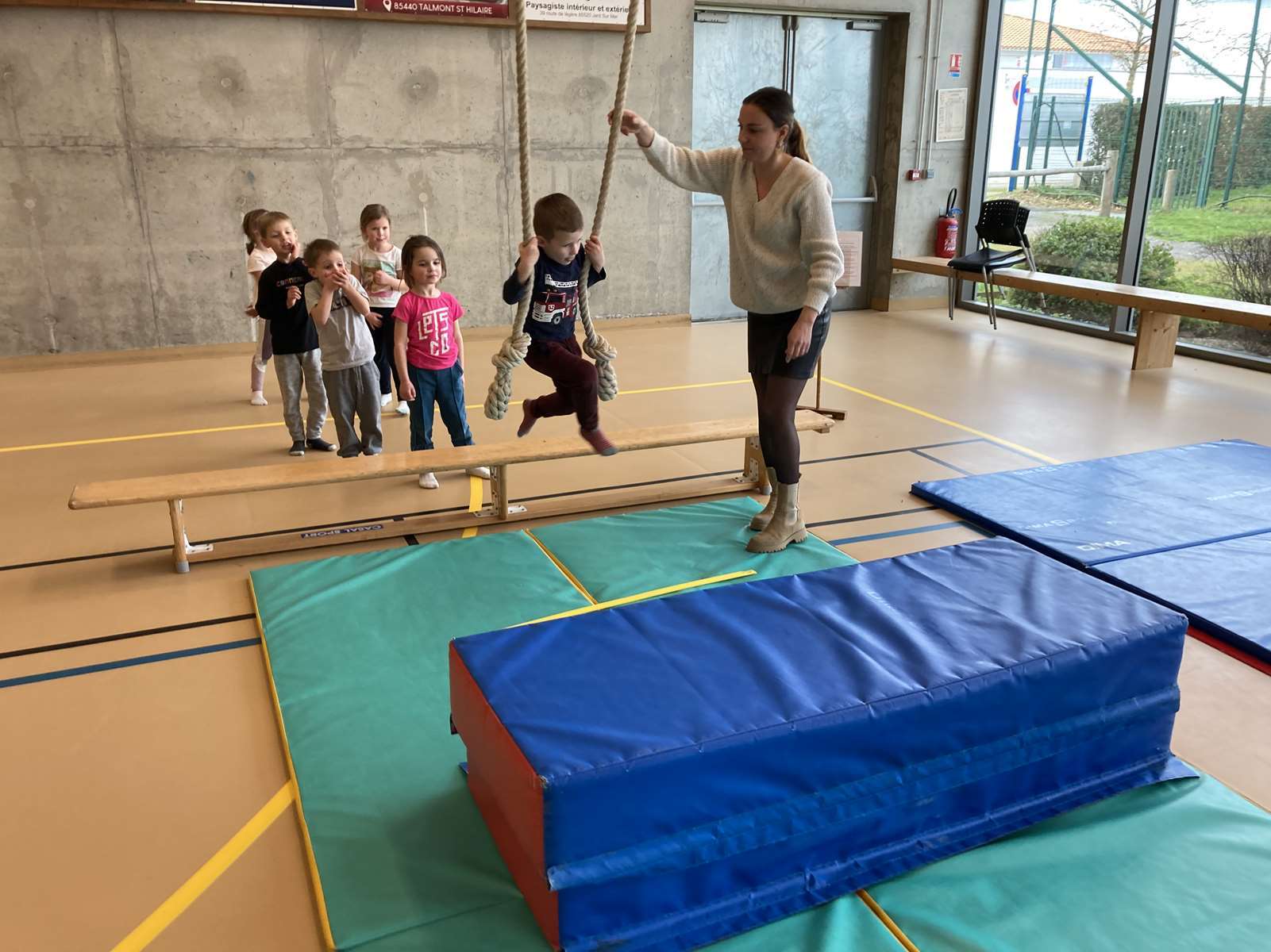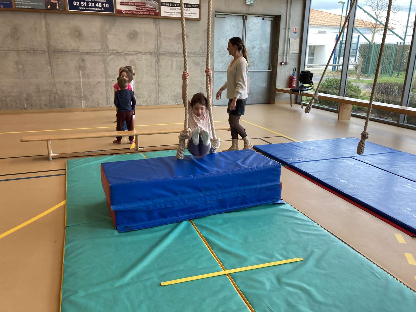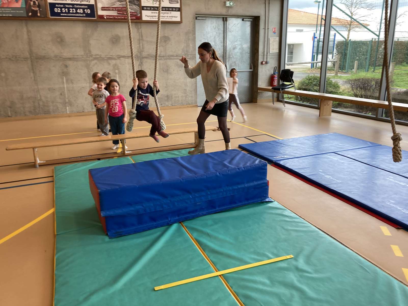 A l’école, dans la salle de motricité, avec les gros modules prêtés par l’UGSEL.