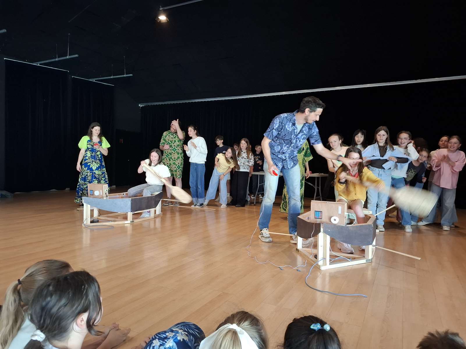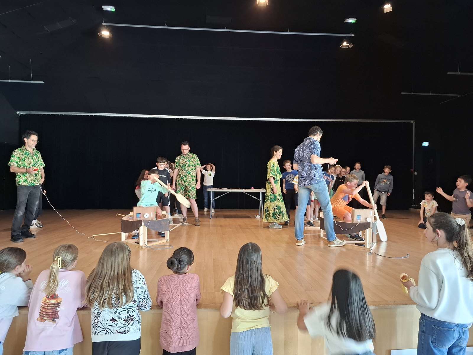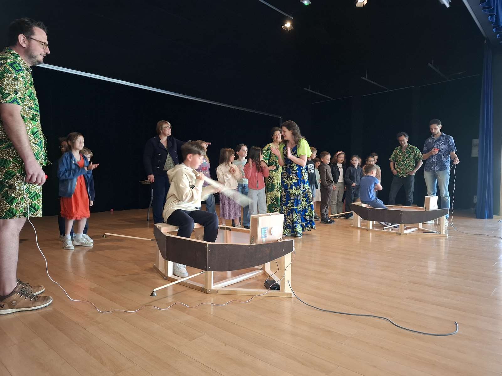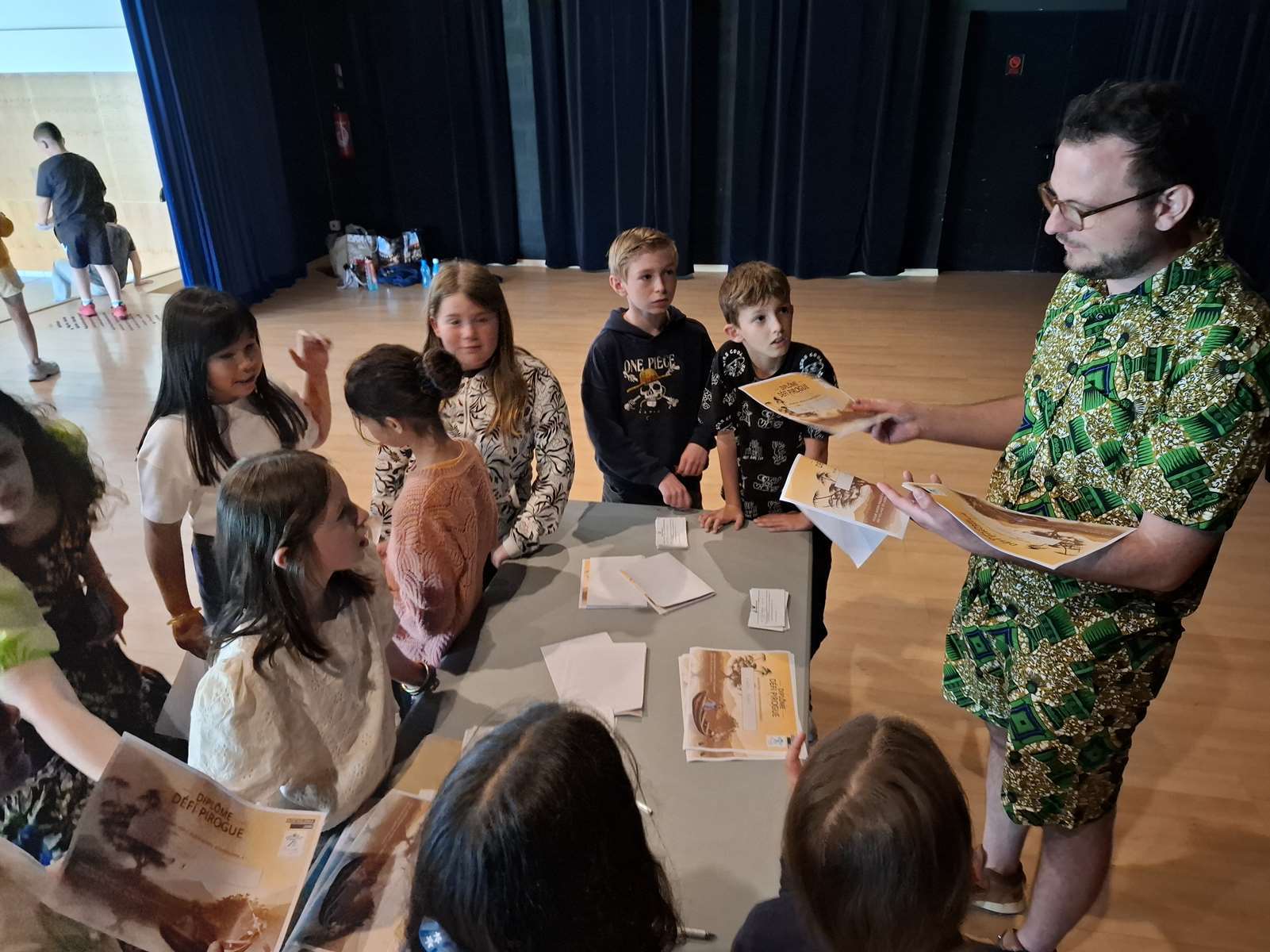 Dans la salle des Ribandeaux, les membres de Bonvolema avaient installé deux maquettes de « pirogue », pour nous permettre de relever un défi : pagayer le plus vite possible en un temps donné. Ce défi nous a beaucoup plus. Chaque enfant a reçu un petit diplôme du défi pirogue.