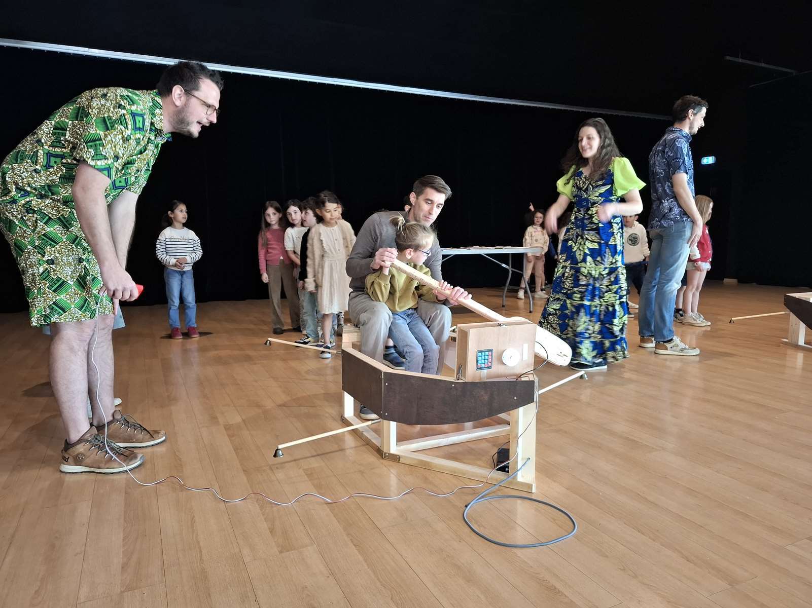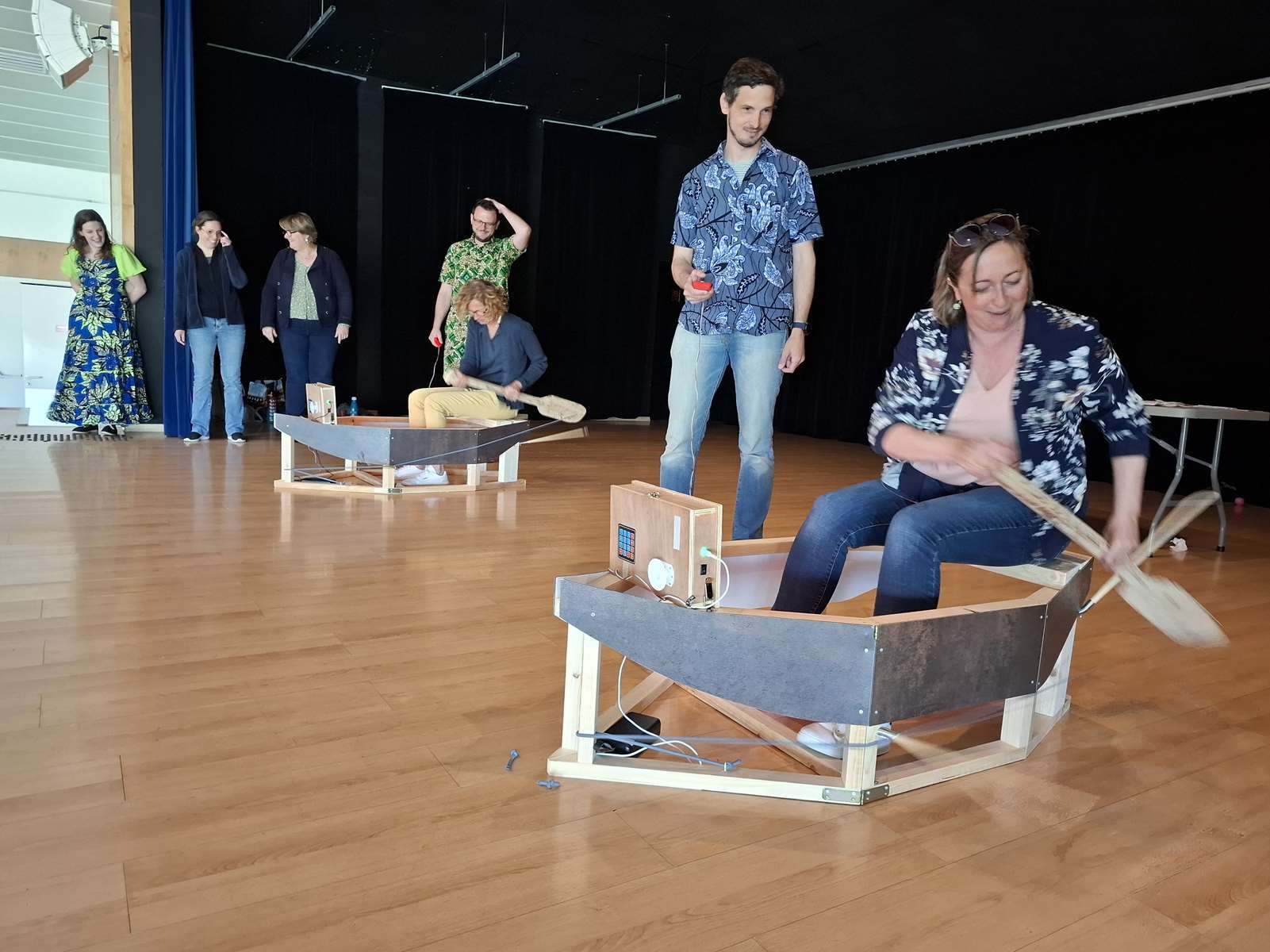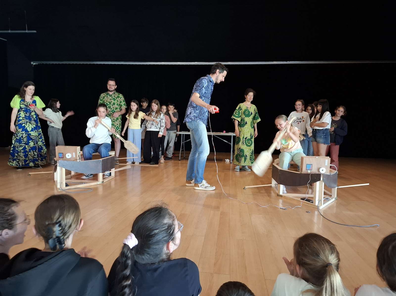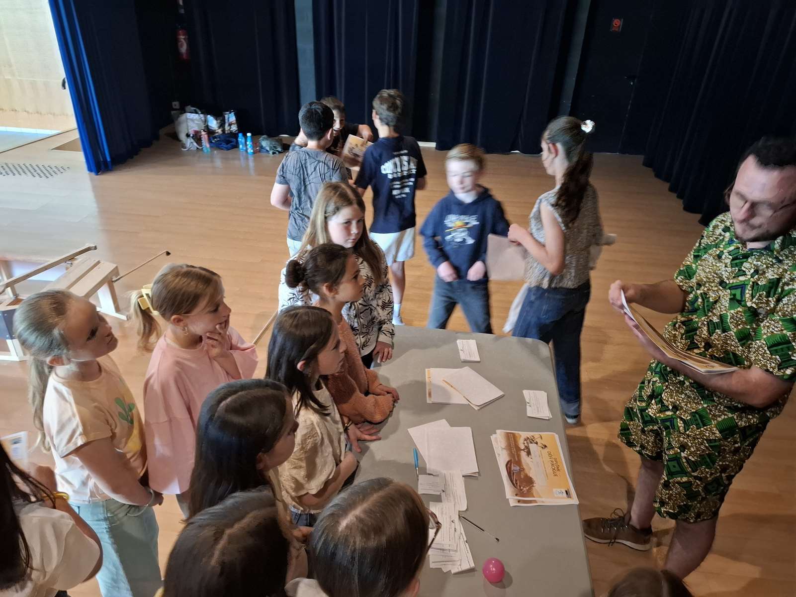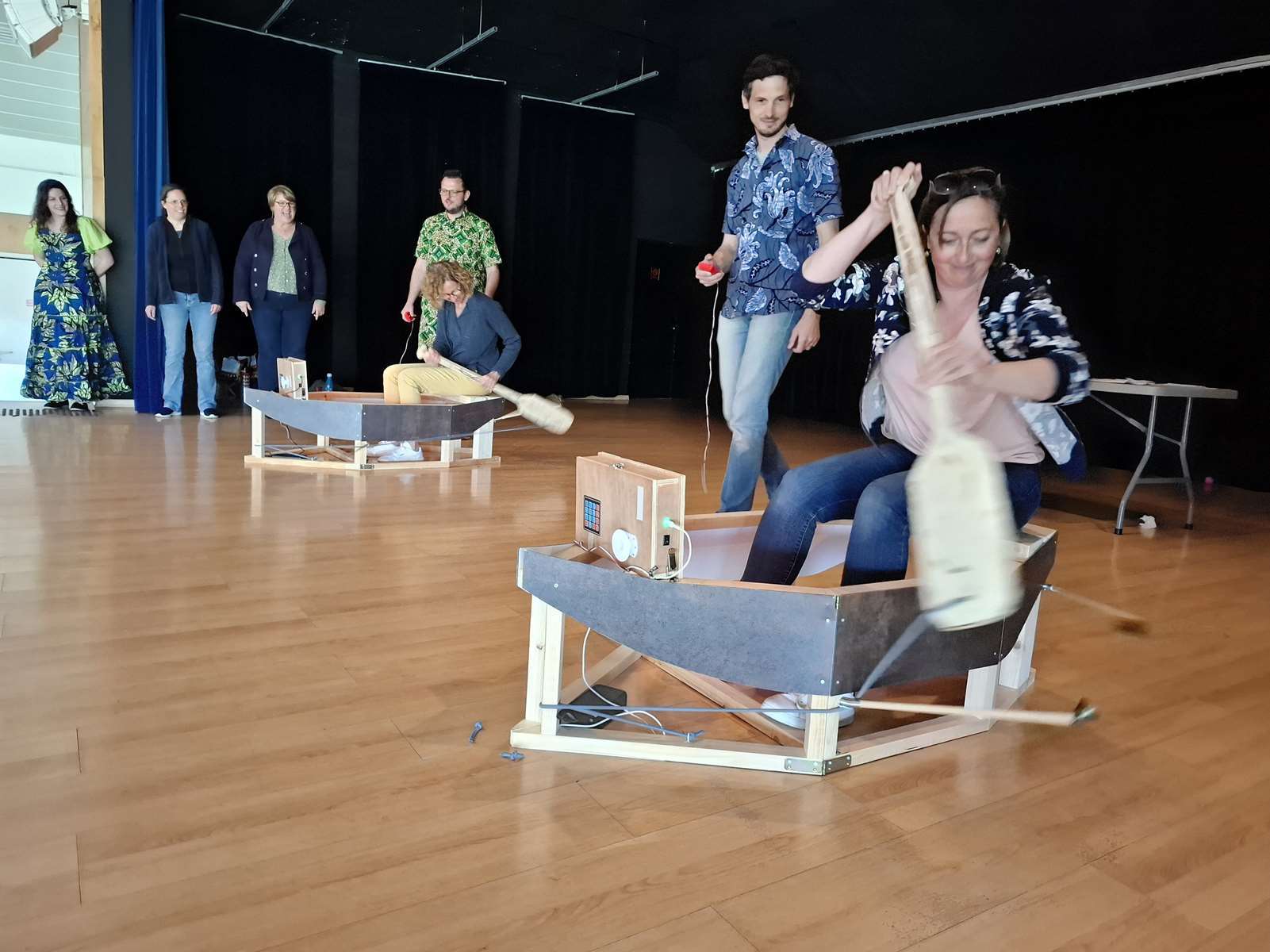 Dans la salle des Ribandeaux, les membres de Bonvolema avaient installé deux maquettes de « pirogue », pour nous permettre de relever un défi : pagayer le plus vite possible en un temps donné. Ce défi nous a beaucoup plus. Chaque enfant a reçu un petit diplôme du défi pirogue.