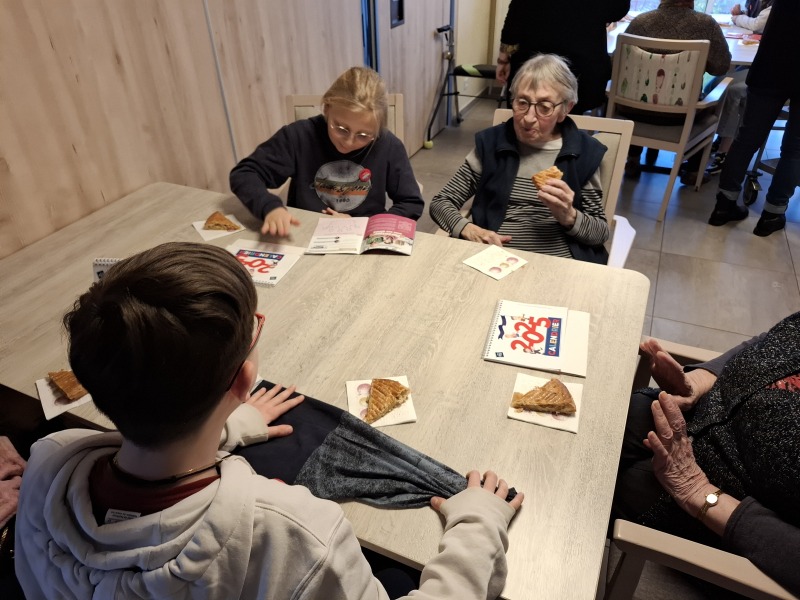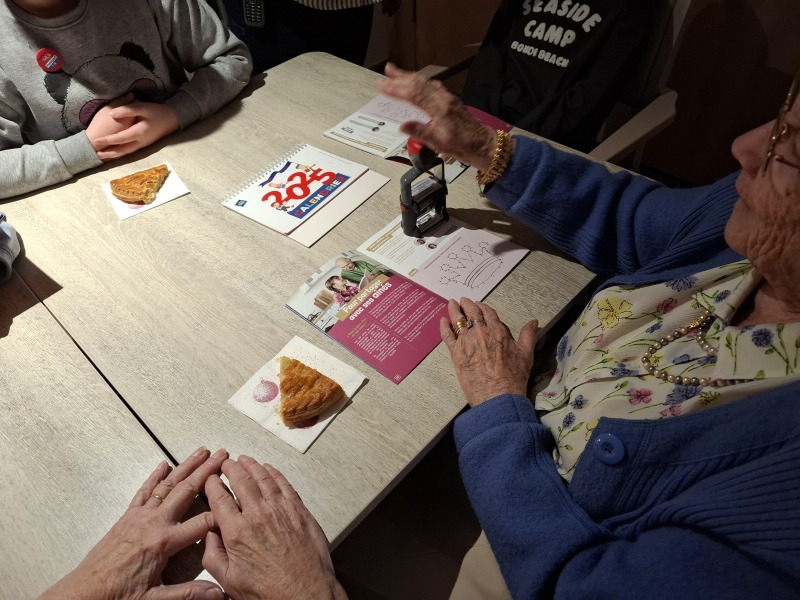 Enfin, les résidents ont validé symboliquement cette étape du Passeport, en tamponnant la page 11 du livret 2024-2025. La galette des rois a été partagée entre jeunes élèves et résidents, en guise de goûter, avant le retour à l’école.