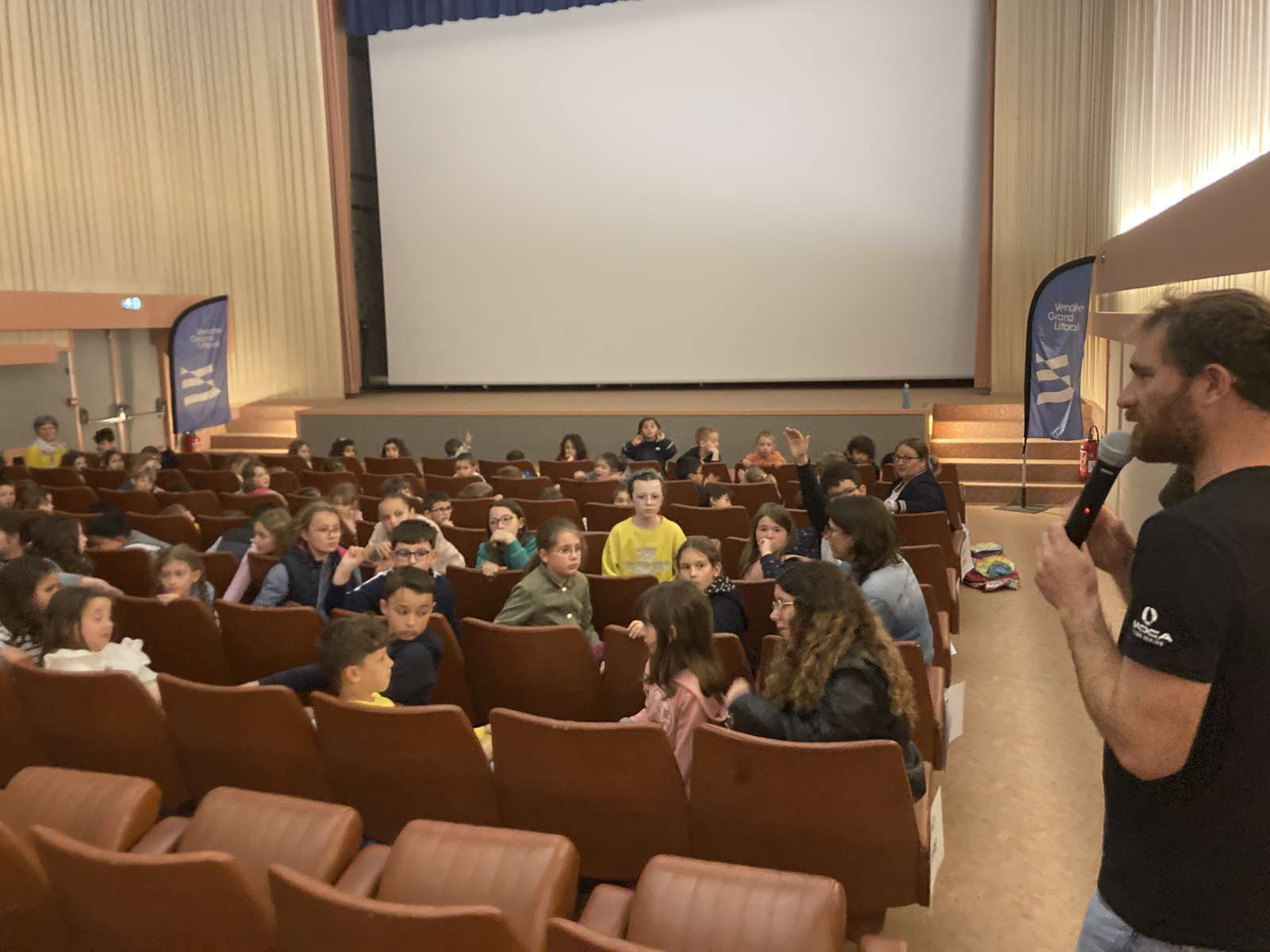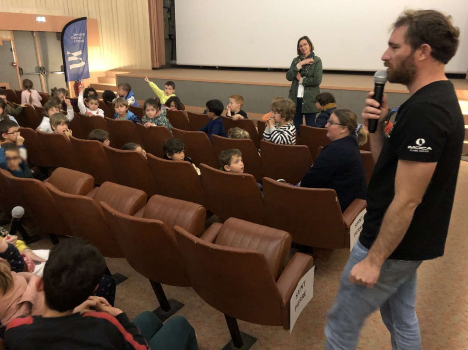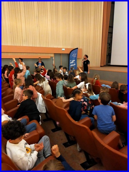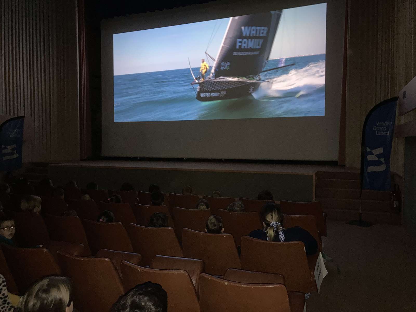 Aujourd’hui, lundi 28 avril, nous sommes allés au cinéma « Le Manoir » à Talmont-saint-Hilaire avec des élèves d’autres écoles de la communauté de communes pour regarder le film dans lequel Benjamin Dutreux présente son deuxième Vendée Globe.