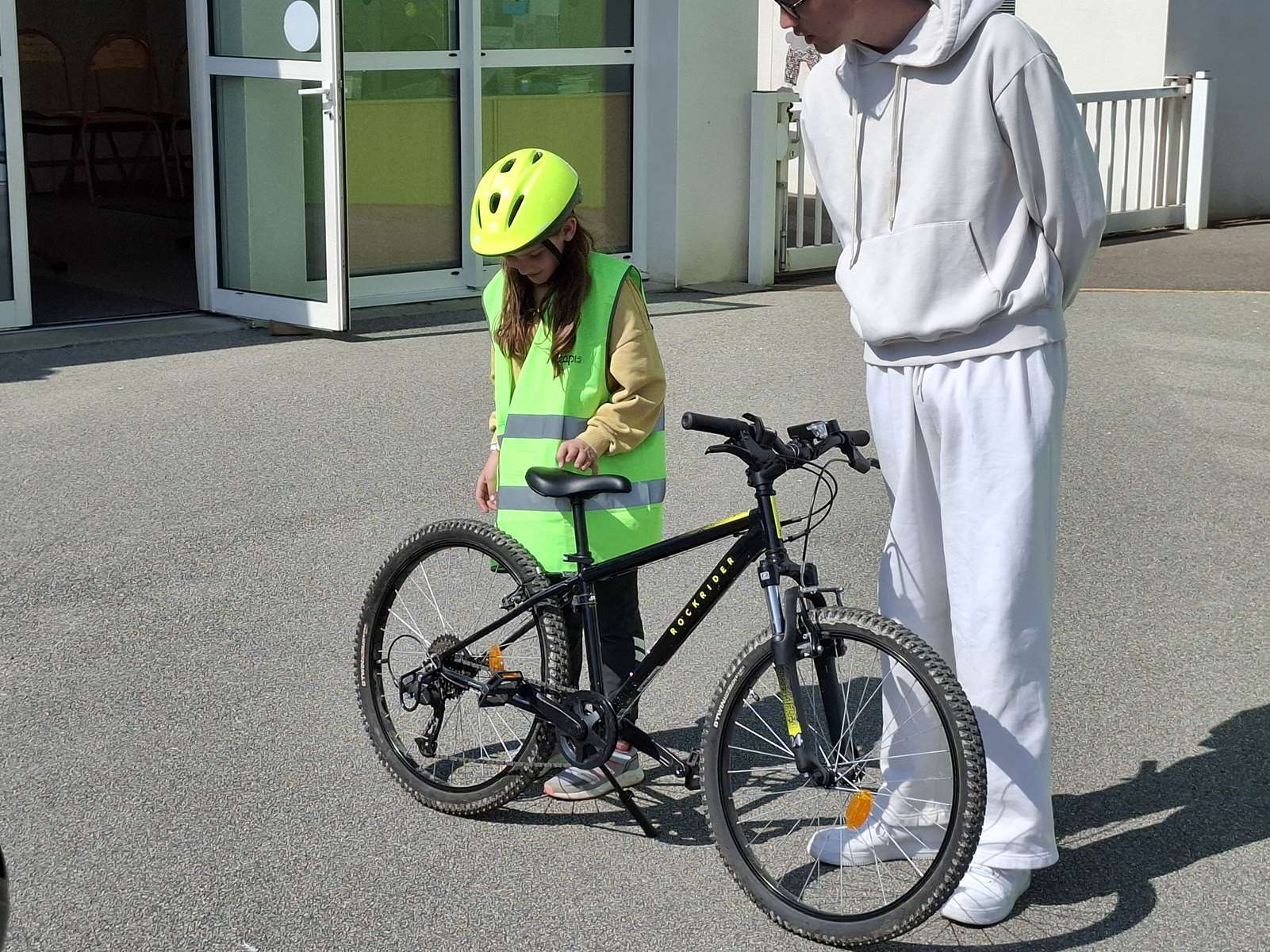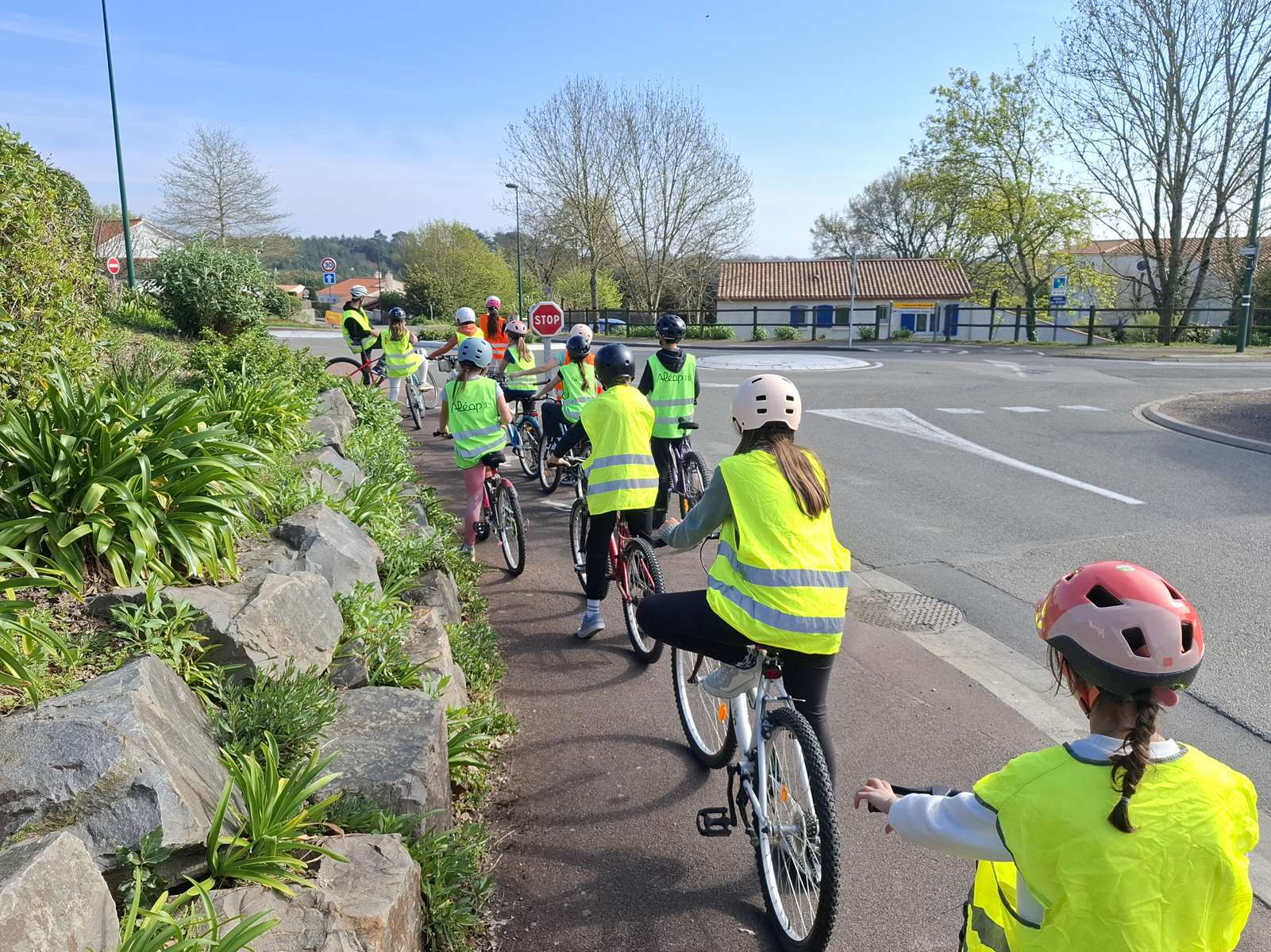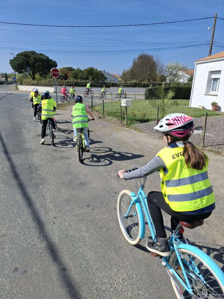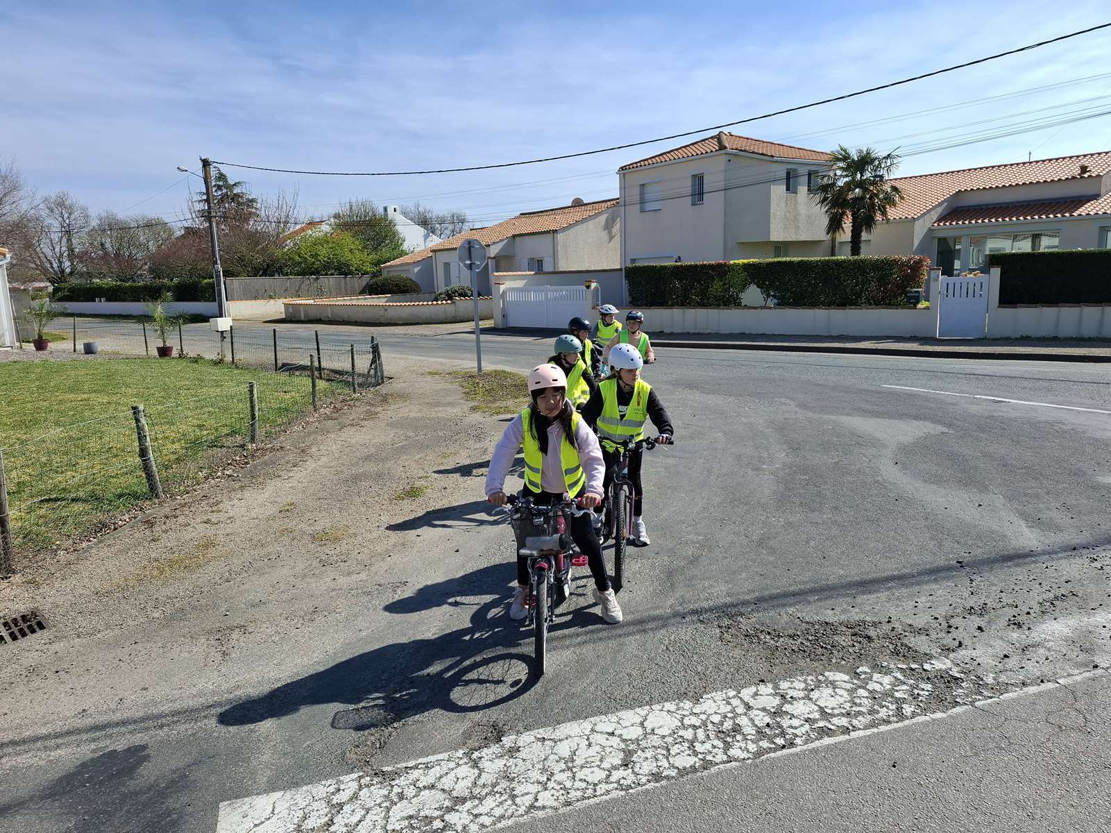Damien, lui, a emmené l’autre demi-groupe rouler dans Talmont St Hilaire, accompagné d’un enseignant. Observer son environnement, prendre les pistes cyclables, tenir sa droite, mettre les bras pour tourner, prendre un rond-point, respecter les panneaux du code la route … Voici quelques objectifs de travail, en situation réelle, en ville, pour aussi se sentir en sécurité.