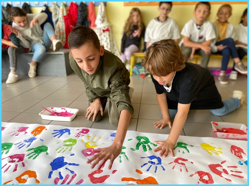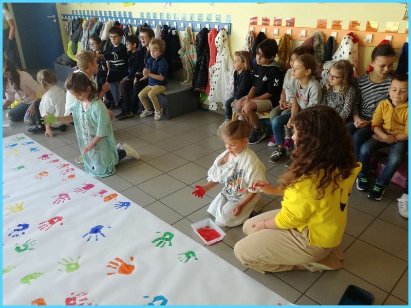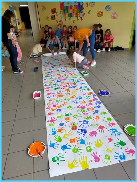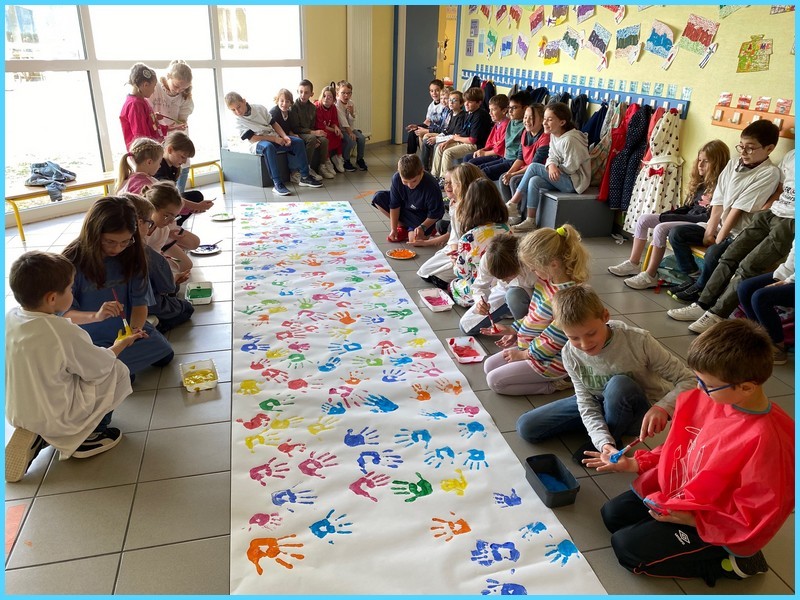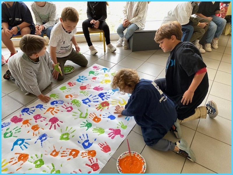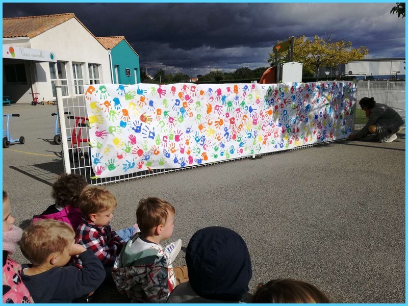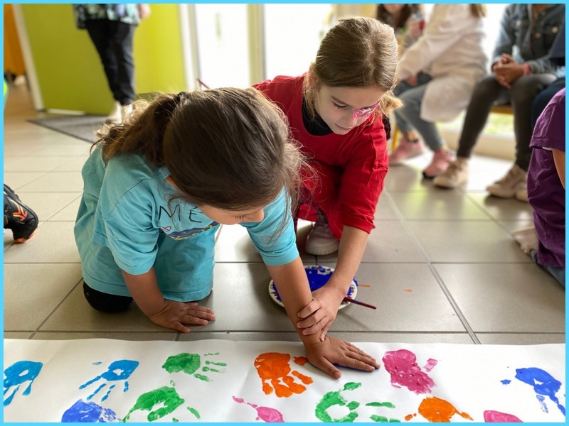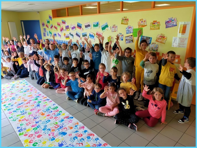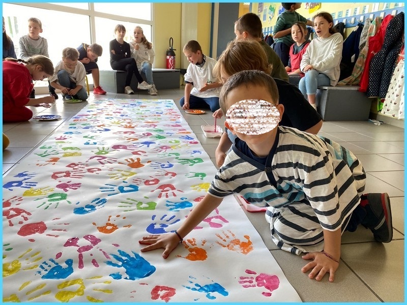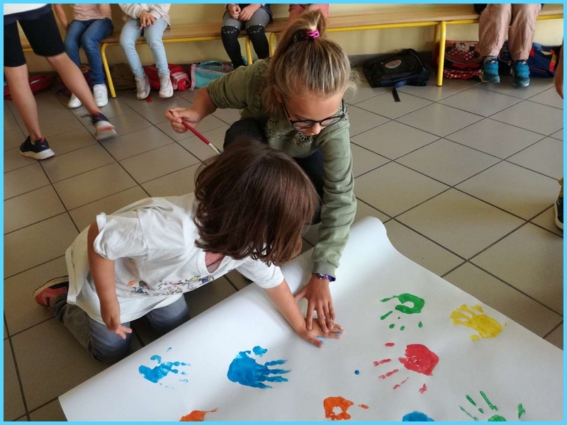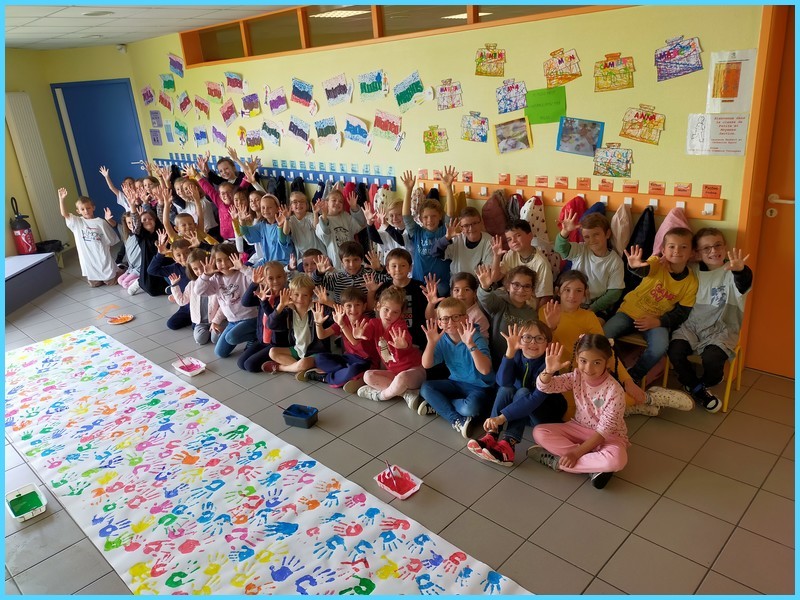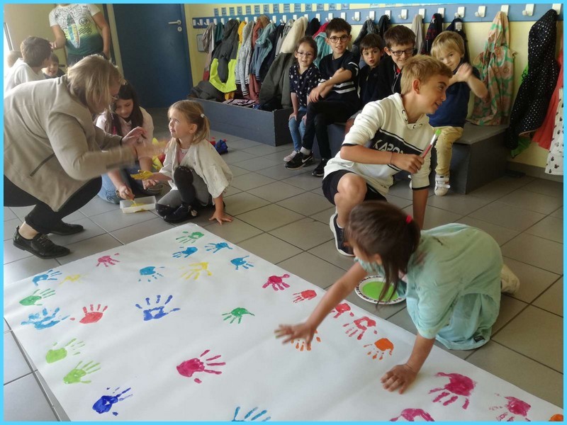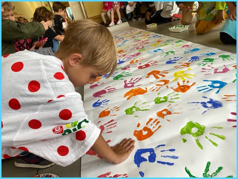 Cette année, toutes les classes de l’école St Pierre ont choisi de travailler autour d’un projet commun : l’acceptation des différences quelles qu’elles soient. Pour lancer ce projet, Jeudi 29 Septembre dernier, chaque enfant et adulte de l’école a posé son empreinte de main afin de réaliser une grande fresque collective. Nous avons pu admirer l’œuvre en fin d’après-midi autour d’un chant commun : Moi, je suis comme ça et alors ?