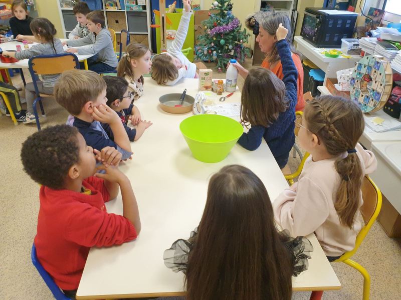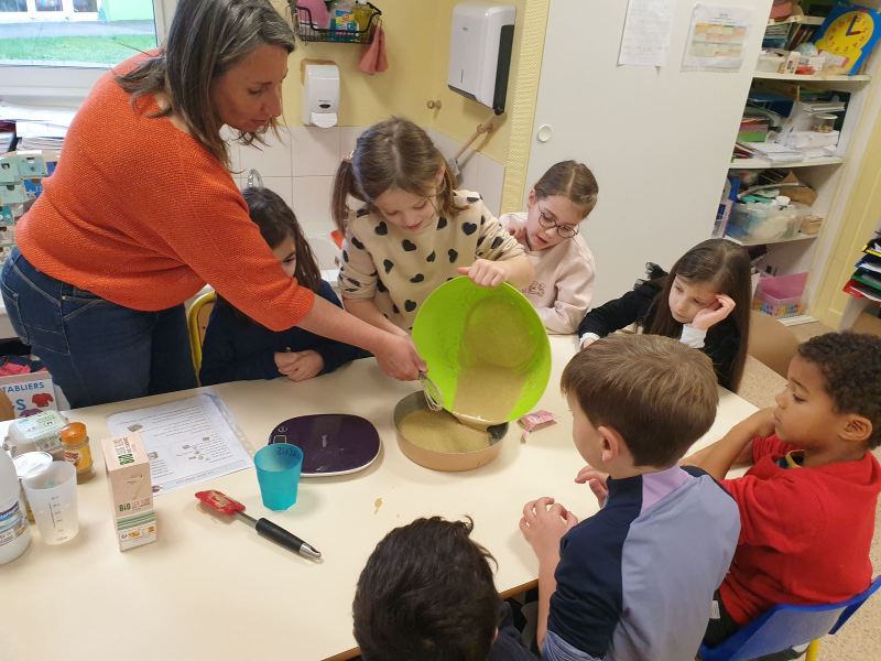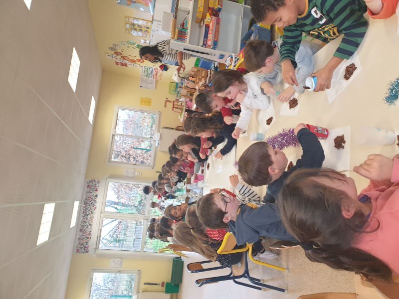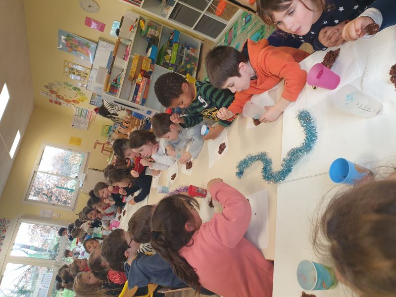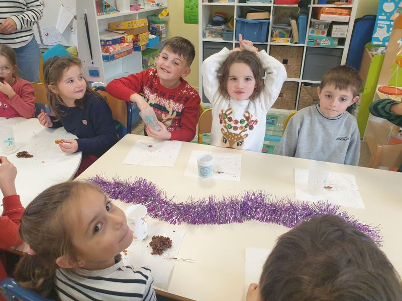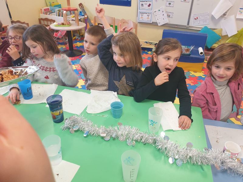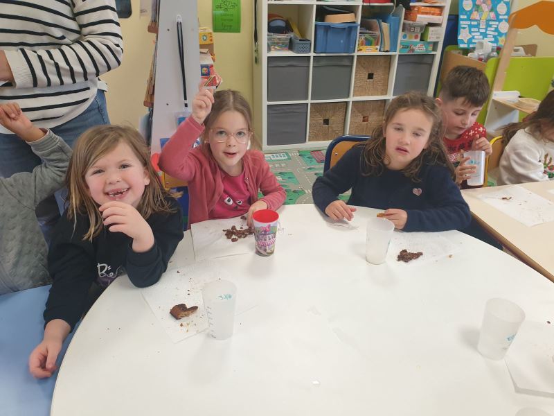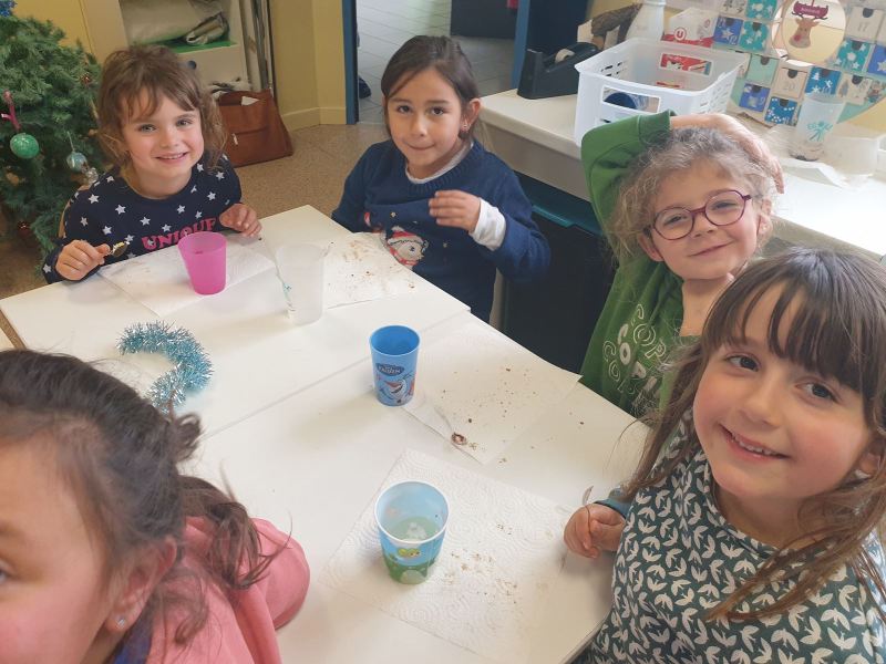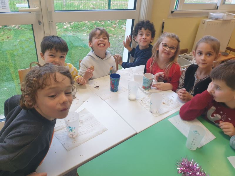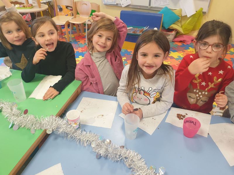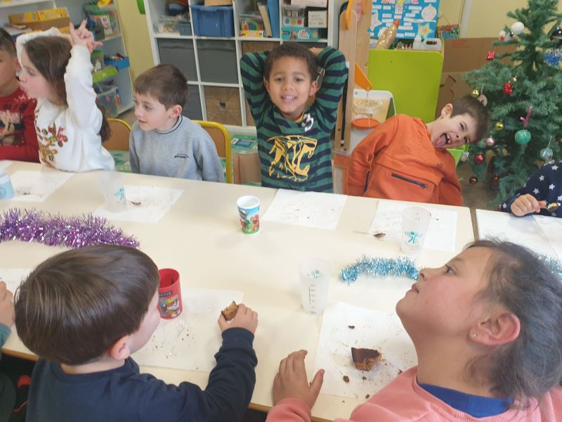 Nous avons terminé ces temps par partager un goûter géant entre les GS et les CP-CE1. Nous avons cuisiné des pains d’épices, des cuillères en chocolat et des roses des sables. Un vrai délice !