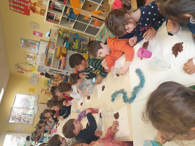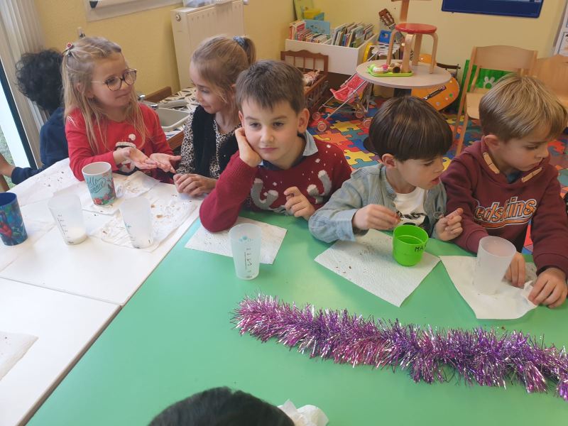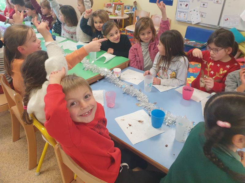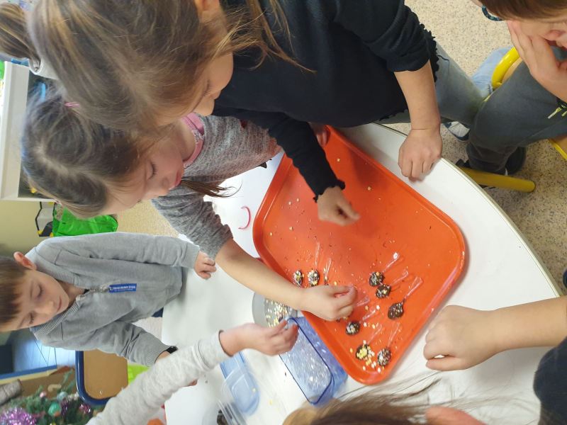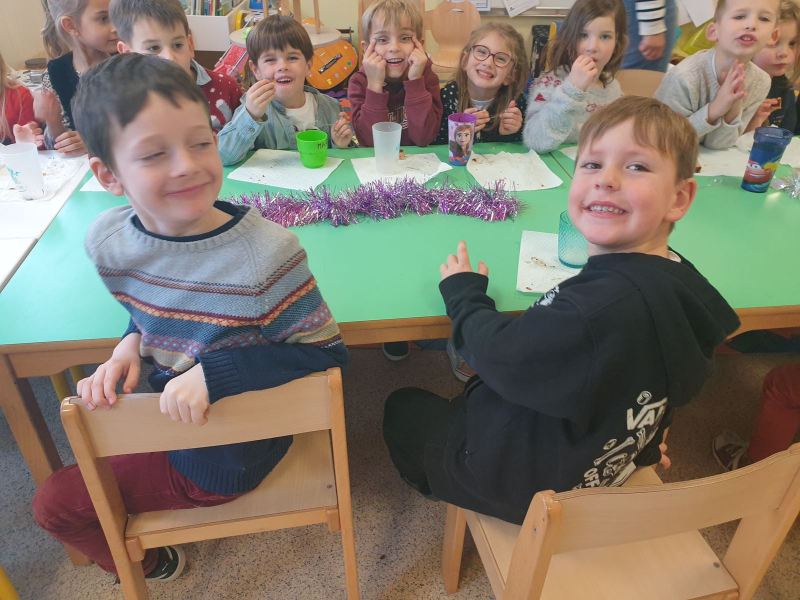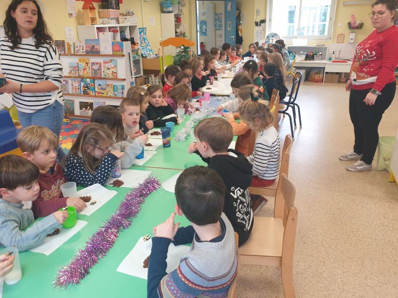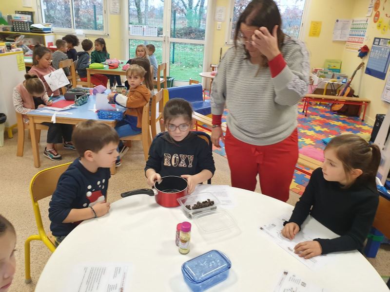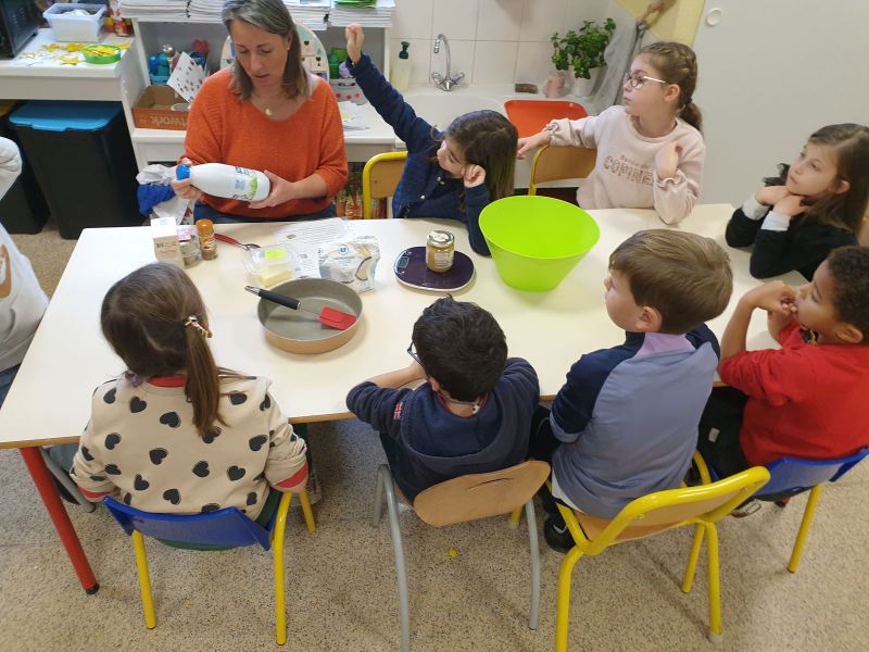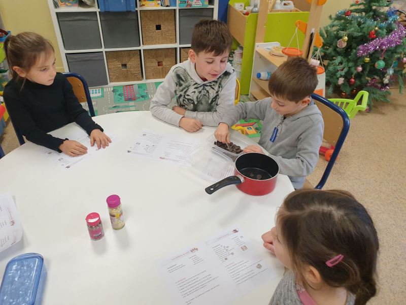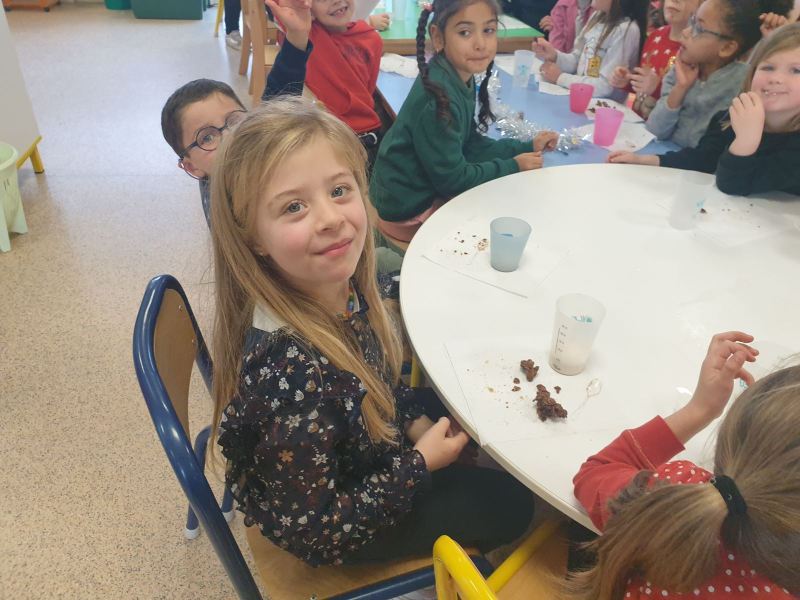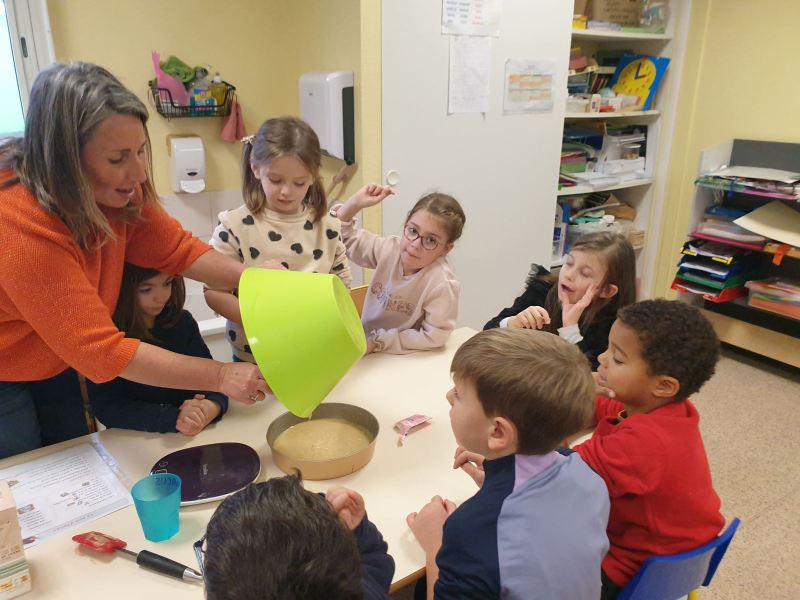 Nous avons terminé ces temps par partager un goûter géant entre les GS et les CP-CE1. Nous avons cuisiné des pains d’épices, des cuillères en chocolat et des roses des sables. Un vrai délice !