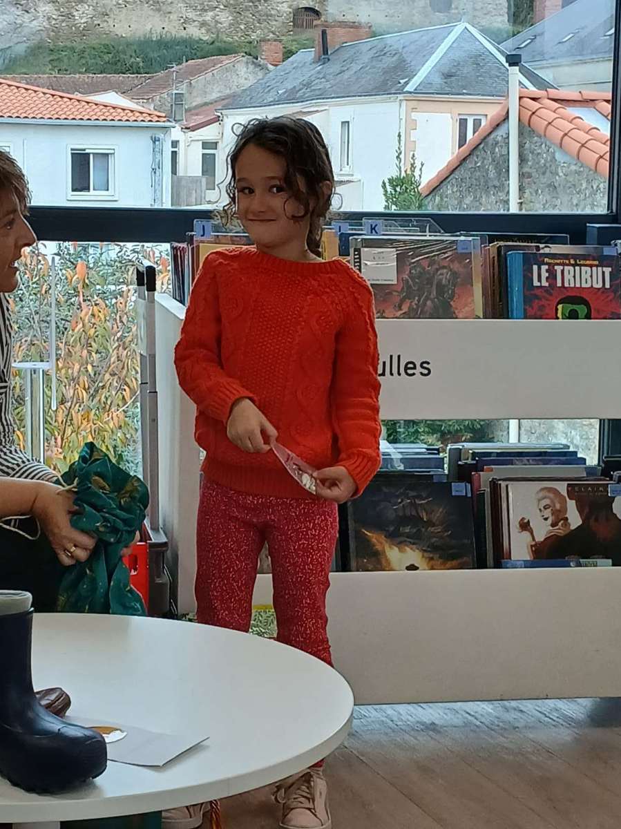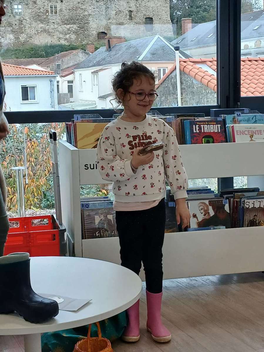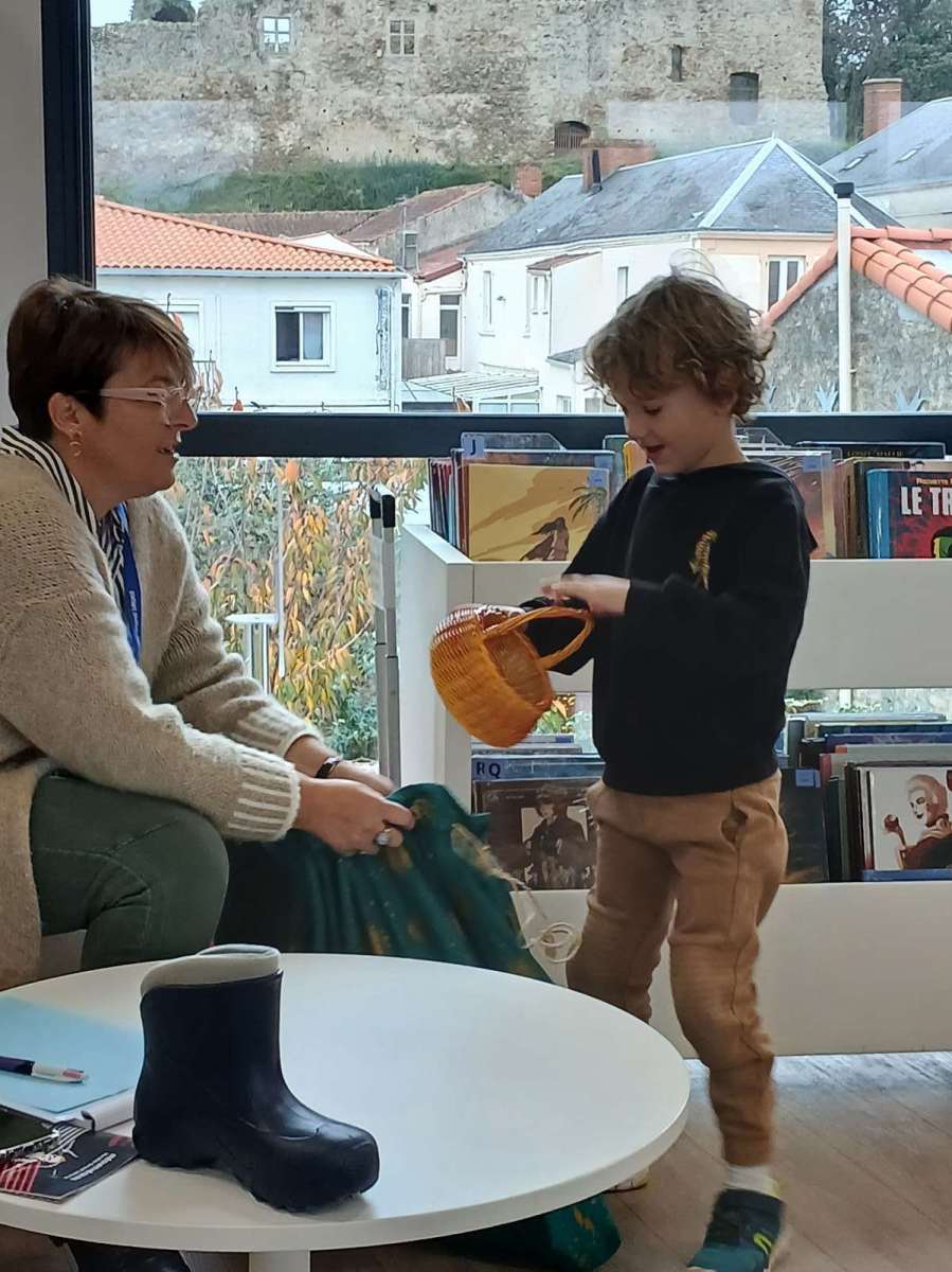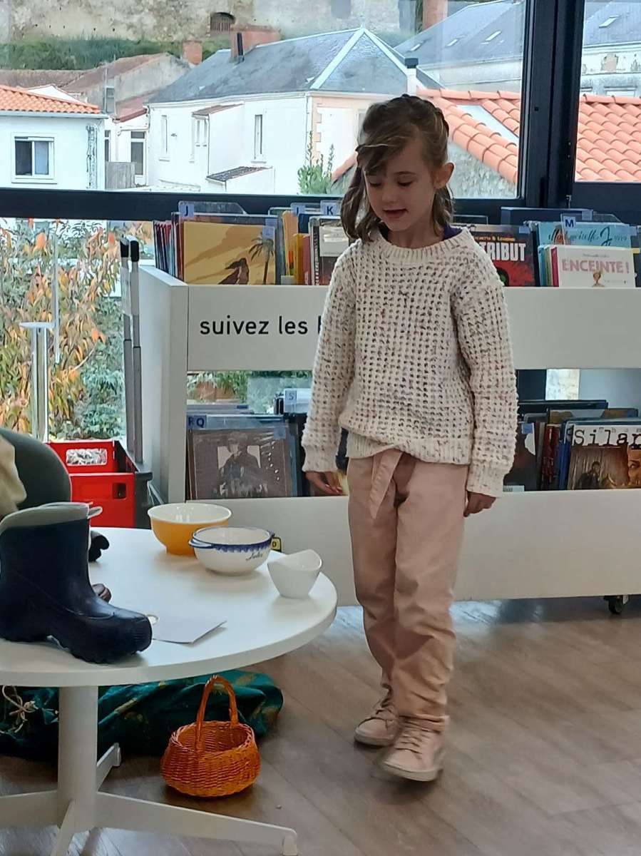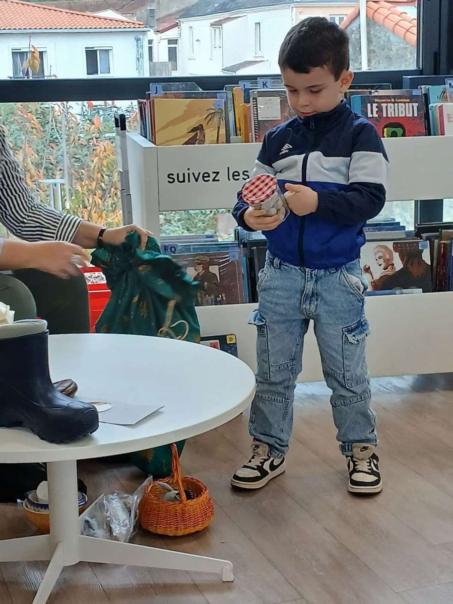 Sophie, l’animatrice, nous avait préparé un petit jeu. Dans un sac, elle avait caché des objets appartenant à des contes et nous devions retrouver leurs titres. Nous avons ainsi trouvé Blanche-Neige avec la pomme, Le chat botté avec la botte, Boucle d’or avec les trois bols et bien d’autres. Elle nous a même lu les contes de « Peau d’âne » et « Le roi et l’oiseau ». Nous avons beaucoup apprécié. Pour terminer ce temps à la médiathèque, nous nous sommes installés avec des livres.
