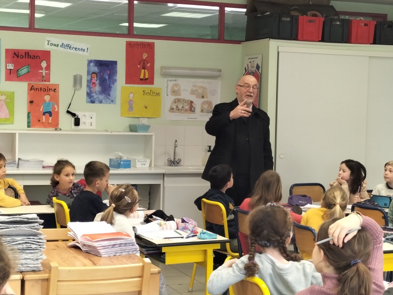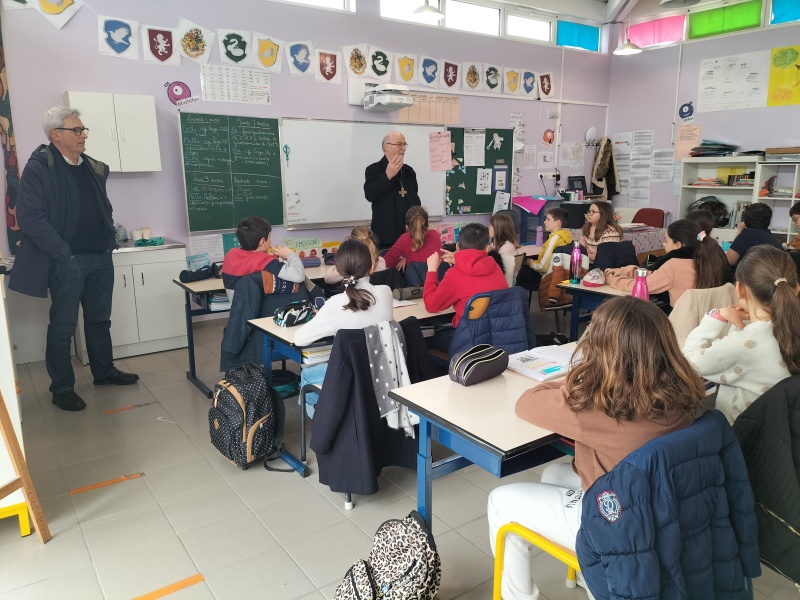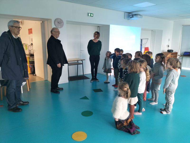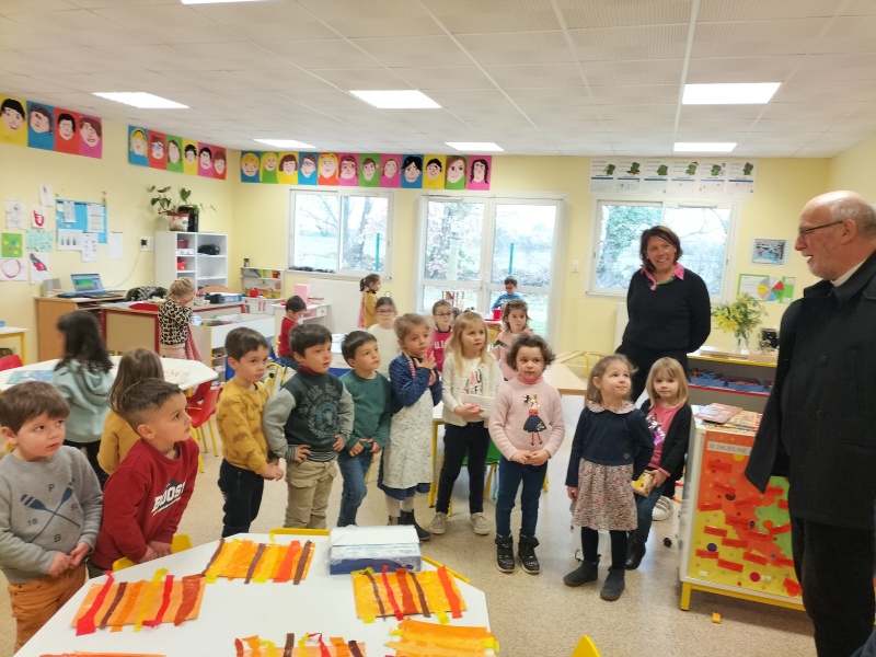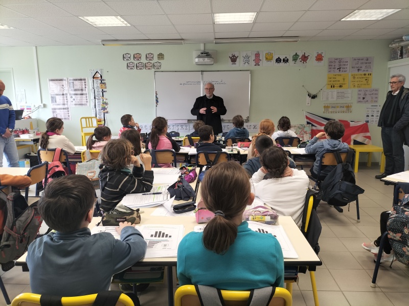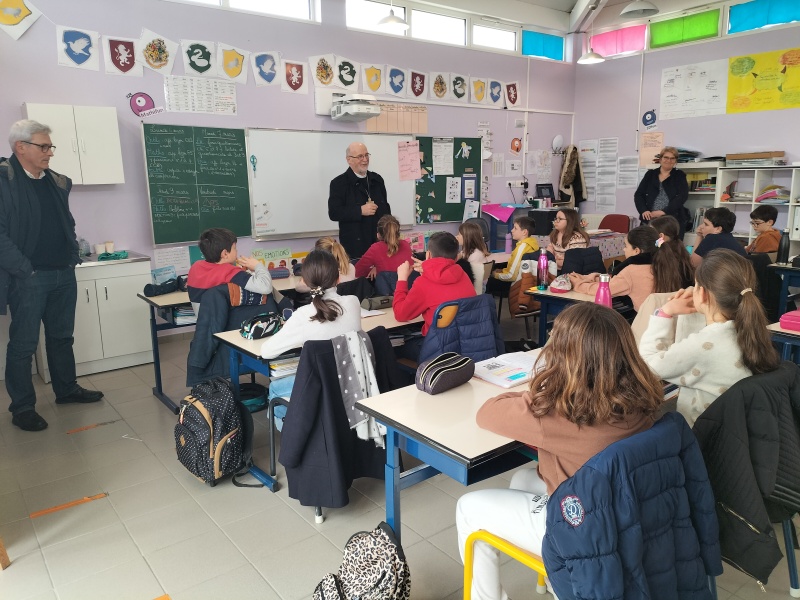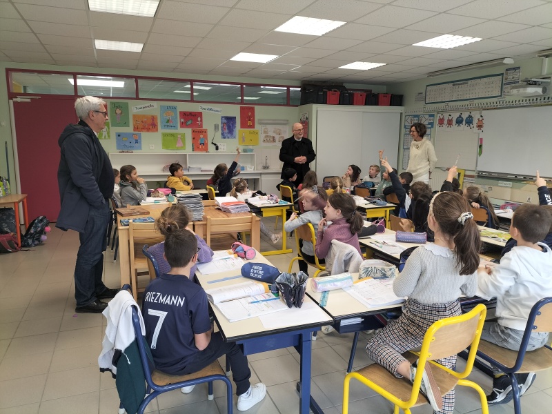 Accompagné par le père Daniel Archambaud, Mgr Jacolin a pris le temps de visiter chacune des classes et a répondu aux questions des enfants qui étaient très fiers de le recevoir!